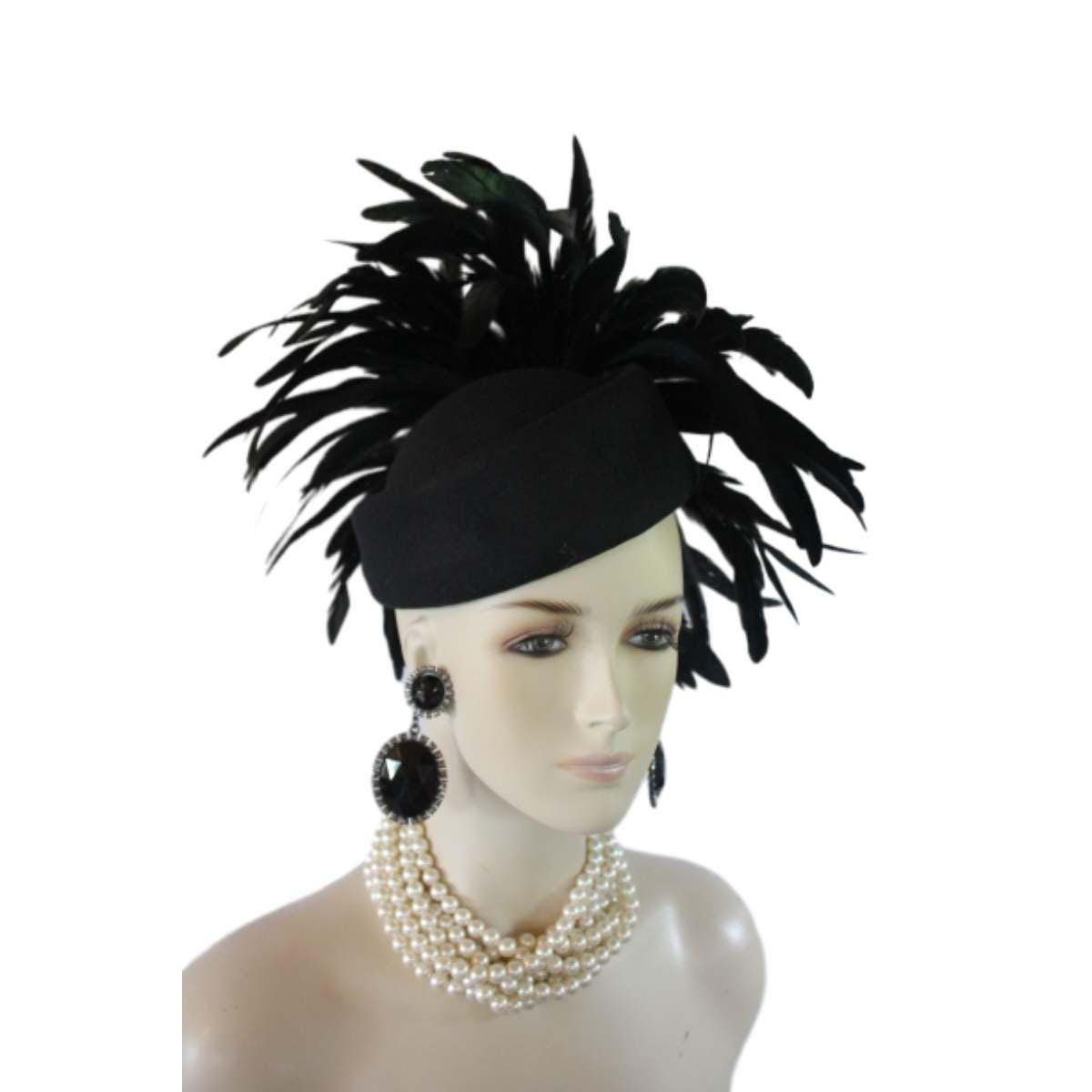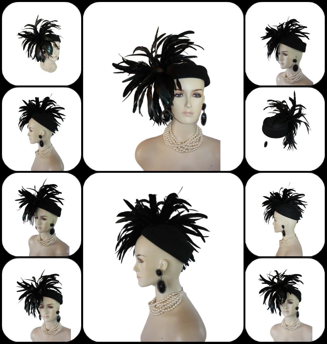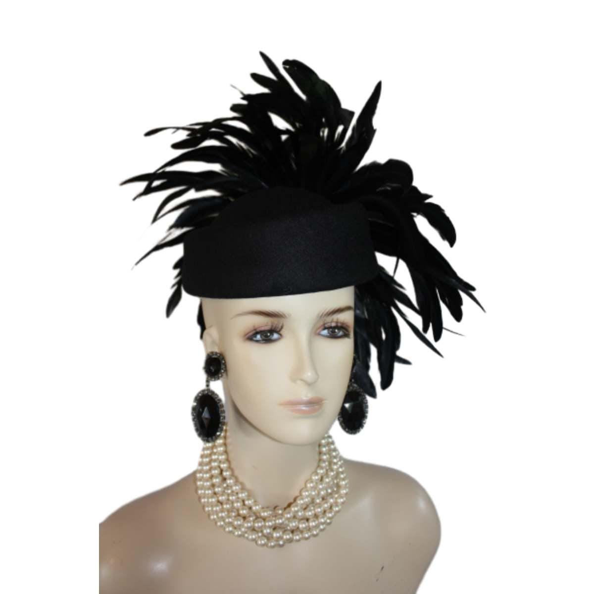 Experience the epitome of high fashion with our Avant Garde Black Haute Couture Pillbox Hat, a stunning creation that is tastefully adorned with shimmering black iridescent feathers. This designer headpiece is the ideal choice for mothers of the bride, brides themselves, and discerning wedding guests seeking to make a luxurious statement. Perfect for luncheons, exotic occasions, and races like the Kentucky Derby, the Royal Ascot, or the Melbourne Cup. This custom-made hat elevates your ensemble effortlessly. Embrace the elegance of feathered headpieces and dress hats for women, curated for formal events and sophisticated gatherings. Crafted for the fashion runway and inspired by Vogue millinery, this exquisite headgear guarantees you stand out in style.