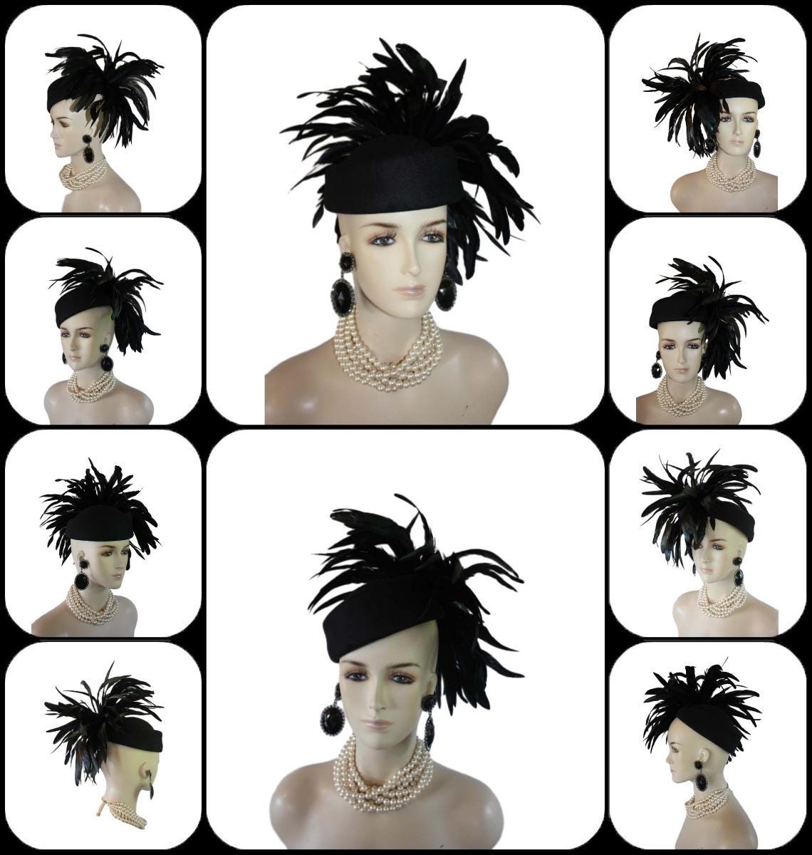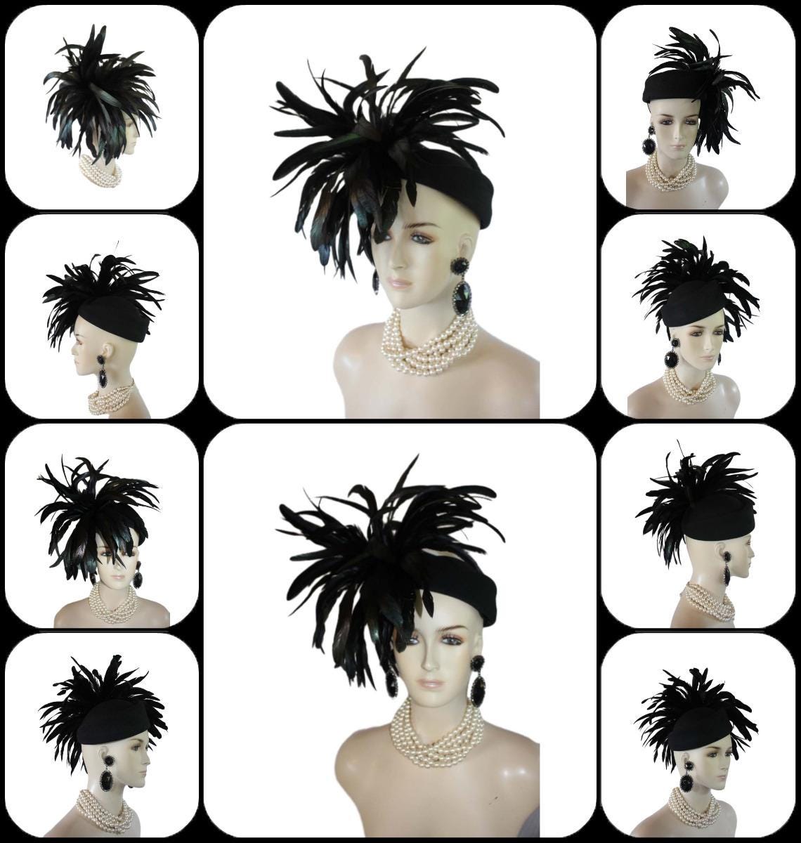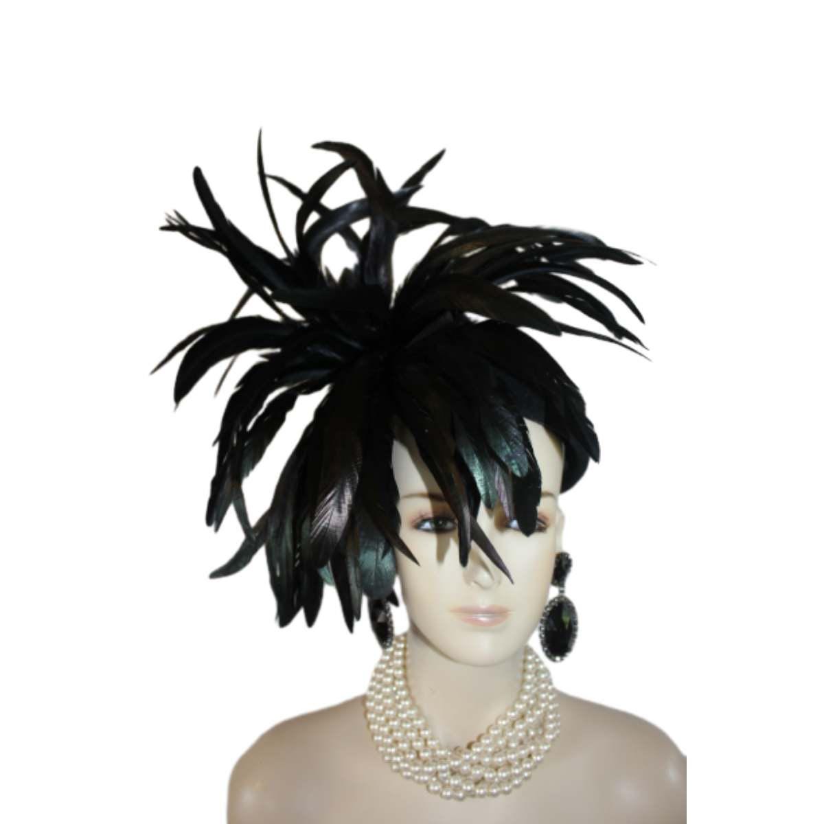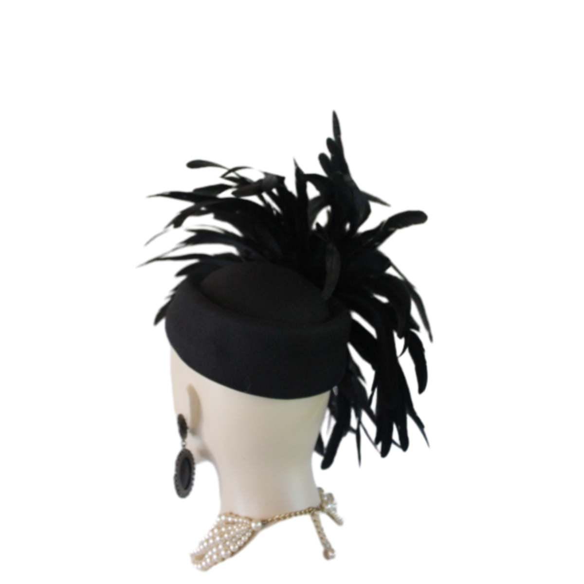 Experience the epitome of high fashion with our Avant Garde Black Haute Couture Pillbox Hat, a stunning creation that is tastefully adorned with shimmering black iridescent feathers. This designer headpiece is the ideal choice for mothers of the bride, brides themselves, and discerning wedding guests seeking to make a luxurious statement. Perfect for luncheons, exotic occasions, and races like the Kentucky Derby, the Royal Ascot, or the Melbourne Cup. This custom-made hat elevates your ensemble effortlessly. Embrace the elegance of feathered headpieces and dress hats for women, curated for formal events and sophisticated gatherings. Crafted for the fashion runway and inspired by Vogue millinery, this exquisite headgear guarantees you stand out in style.