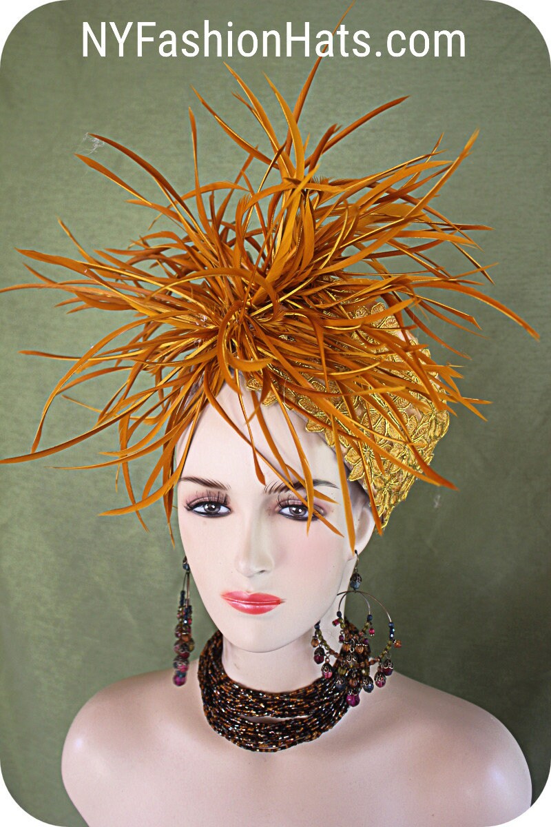 Avant Garde Timeless Vintage Style Hat Luxury Feathered Headpiece, Antique Gold Copper Statement Pillbox Motf Wedding Hat For Women.
