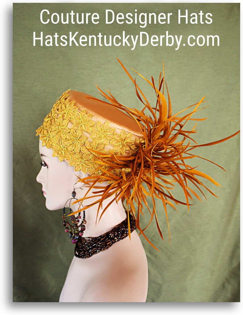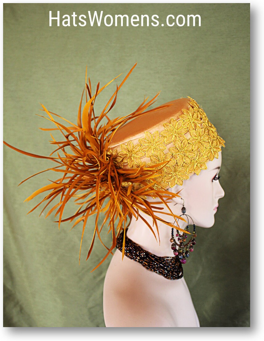 Custom Made Headwear Millinery,Antique gold Satin Hat,Gold Poinsetta Embroidered Trim,Antique Copper Gold Goose Biot Feathers