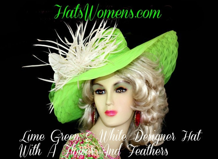 Beautiful Custom Made Lime Green Scallop Brim Designer Hat With A Lily Flower And Exotic White Feathers. Customize This Dress Hat To Match Your Wardrobe. Choose Custom Hat Colors, Flower And Feathers Will Be White On All Color Choices. This Fashion Hat Is Available In Black, White, Pink, Lemon Yellow, Emerald Green, Orange, Turquoise Blue, Navy Blue, Red, Ivory, White, Purple, Dark Brown, And Burgundy. This Elegant Hat Is Suited For The Kentucky Derby, Horse Races, Weddings, Formals, Church, And Special Occasion.