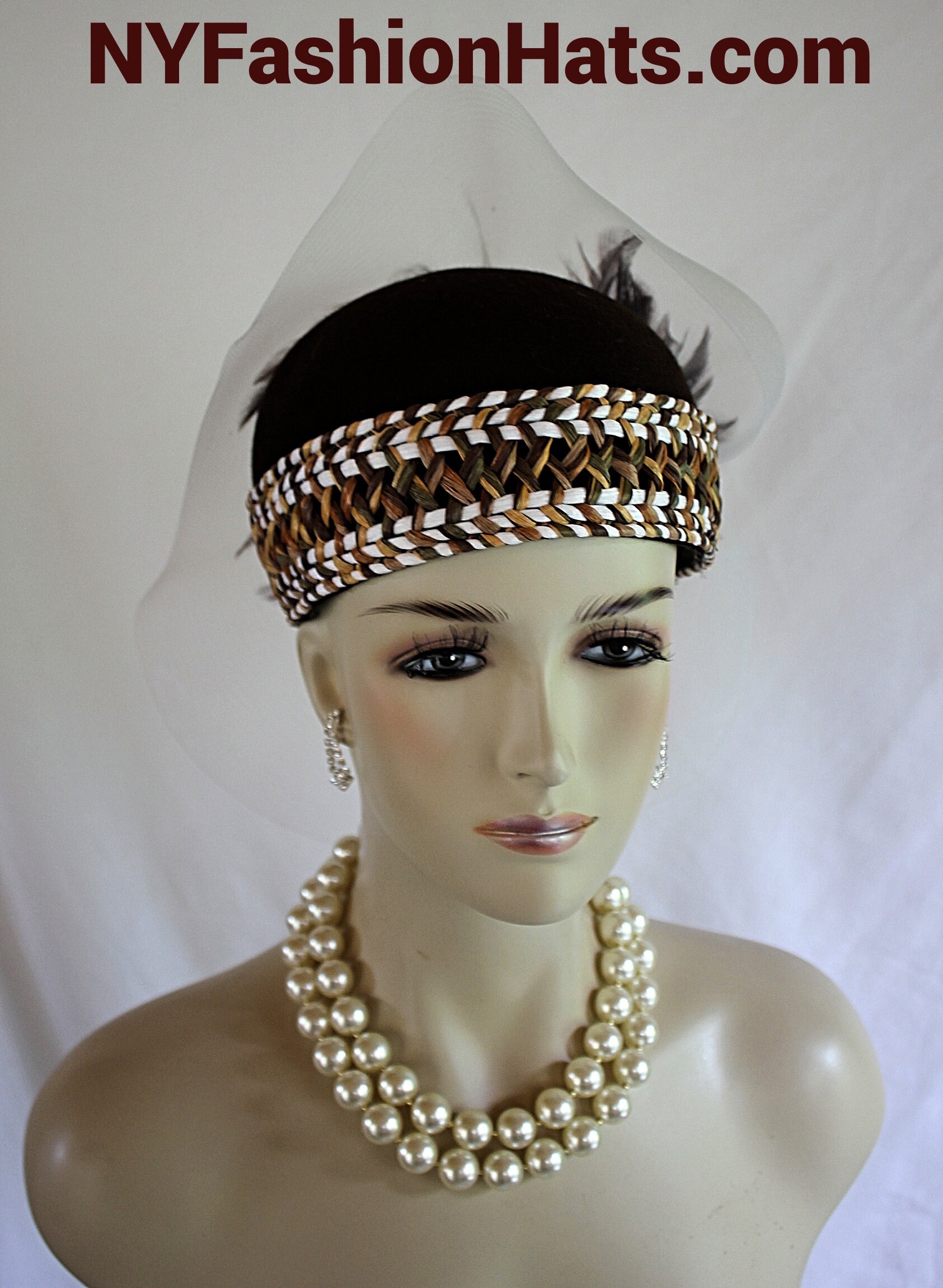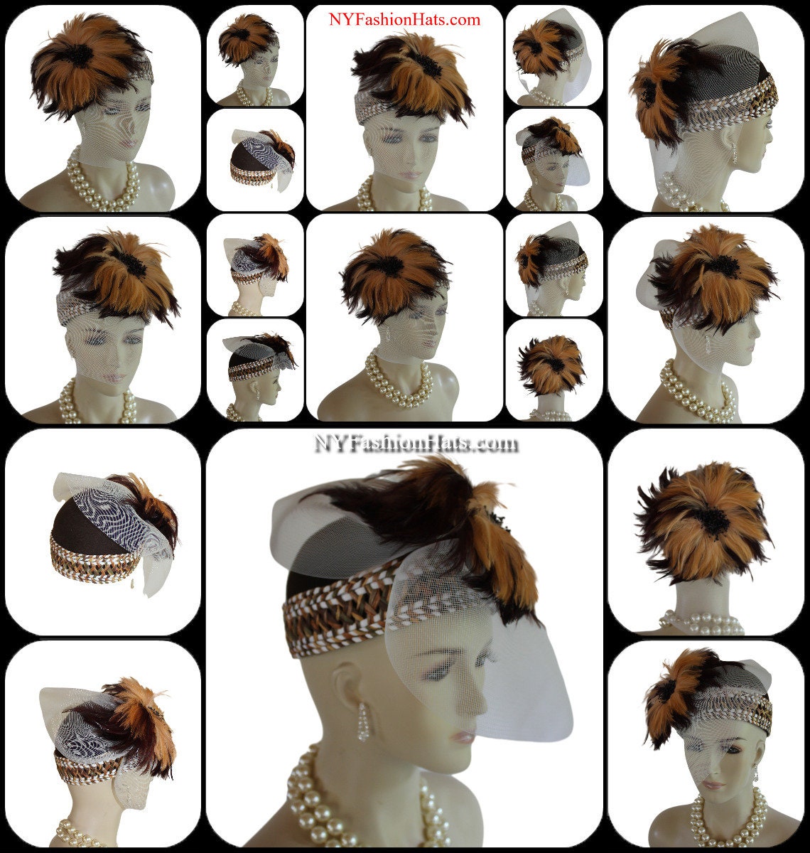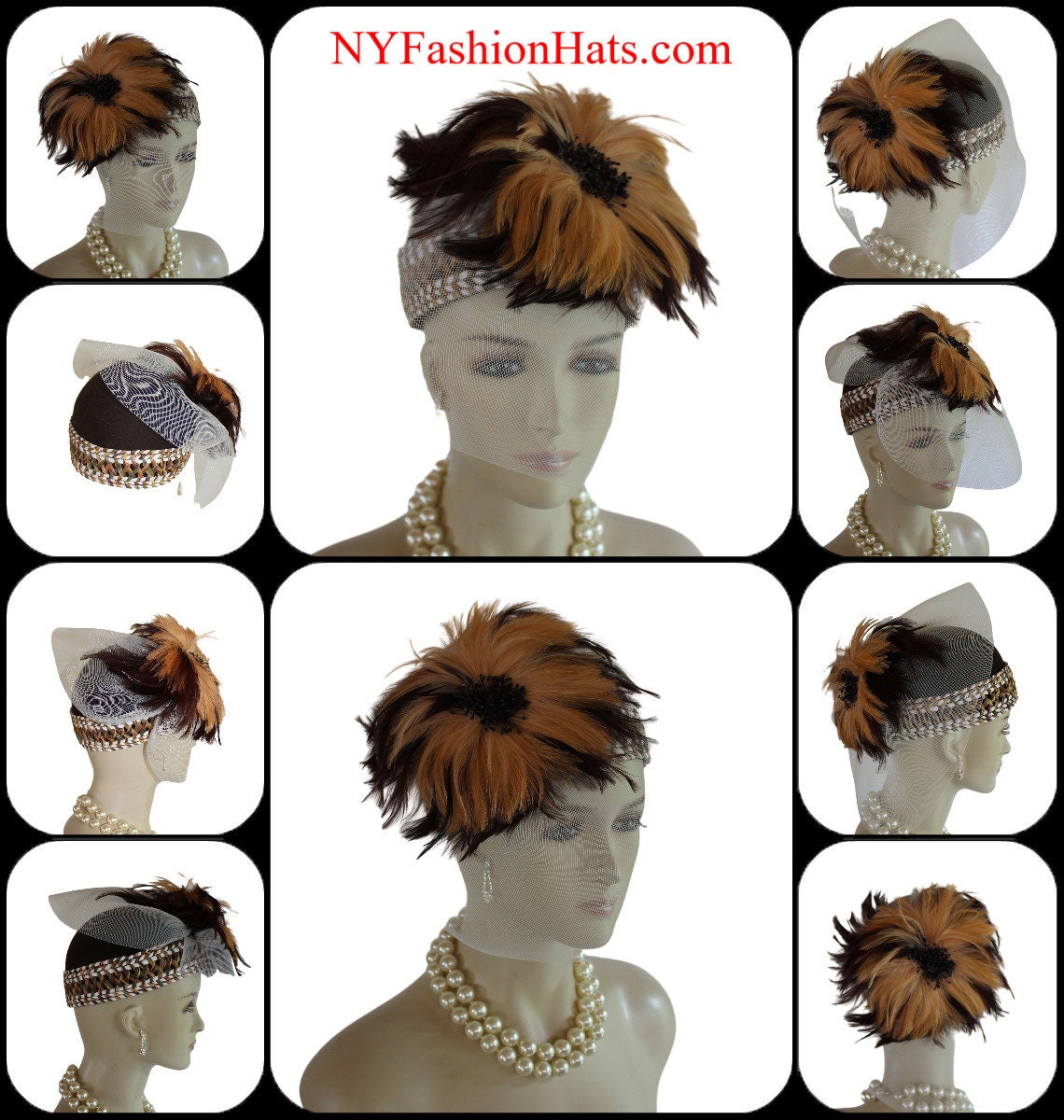 Women’s Brown Winter Wool Sculptured Haute Couture Custom Made Designer Pillbox Cloche Vintage Style Hat. This Formal 1920’s Flapper Art Deco Styled Hat Wedding Headpiece Can Be Worn In Different Positions. This High-Fashion Cocktail Hat Is Embellished With A Large Sheer Horsehair Bow, Accented With Expensive Multi Colored Copper Beige Brown Exotic Hackle Feathers. Vintage Purple And Brown Peks Are Placed In The Center For Added Design. A Multi Colored Large Handmade Straw Band Encircles The Crown. This Dress Hat Is A Show Piece. Inspired By The Vintage Era. This Prestigious Pillbox Hat Is Custom Made And Designed By NY Fashion Hats Couture Millinery. https://www.nyfashionhats.com – This New Collection Headpiece Is Part Of The Anastasia Konstandina Couture Headdress Line. This Women’s High-Fashion Winter Chapeau Is Suited For Cocktail Parties, Church, Temple, Red Carpet Events, Holidays, Weddings, Mother Of The Bride, Formals, Horse Races And Special Occasions.