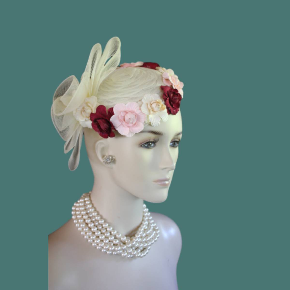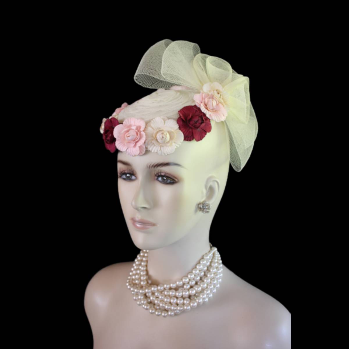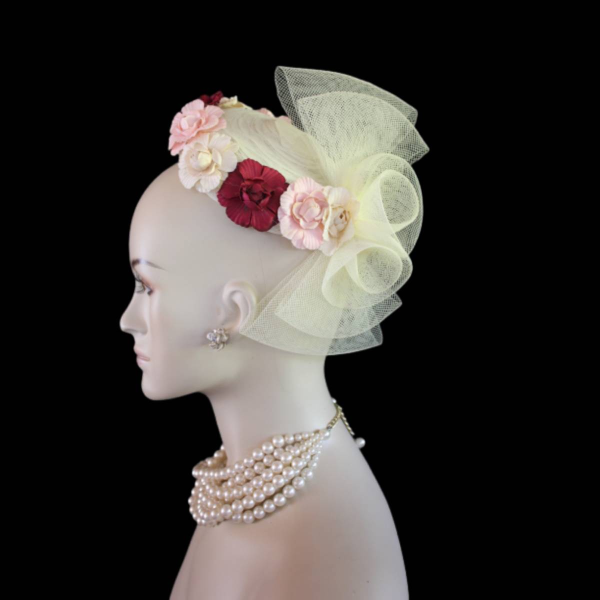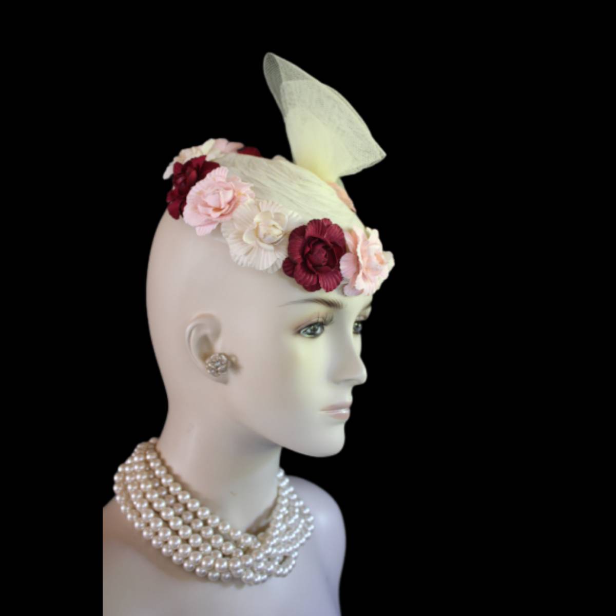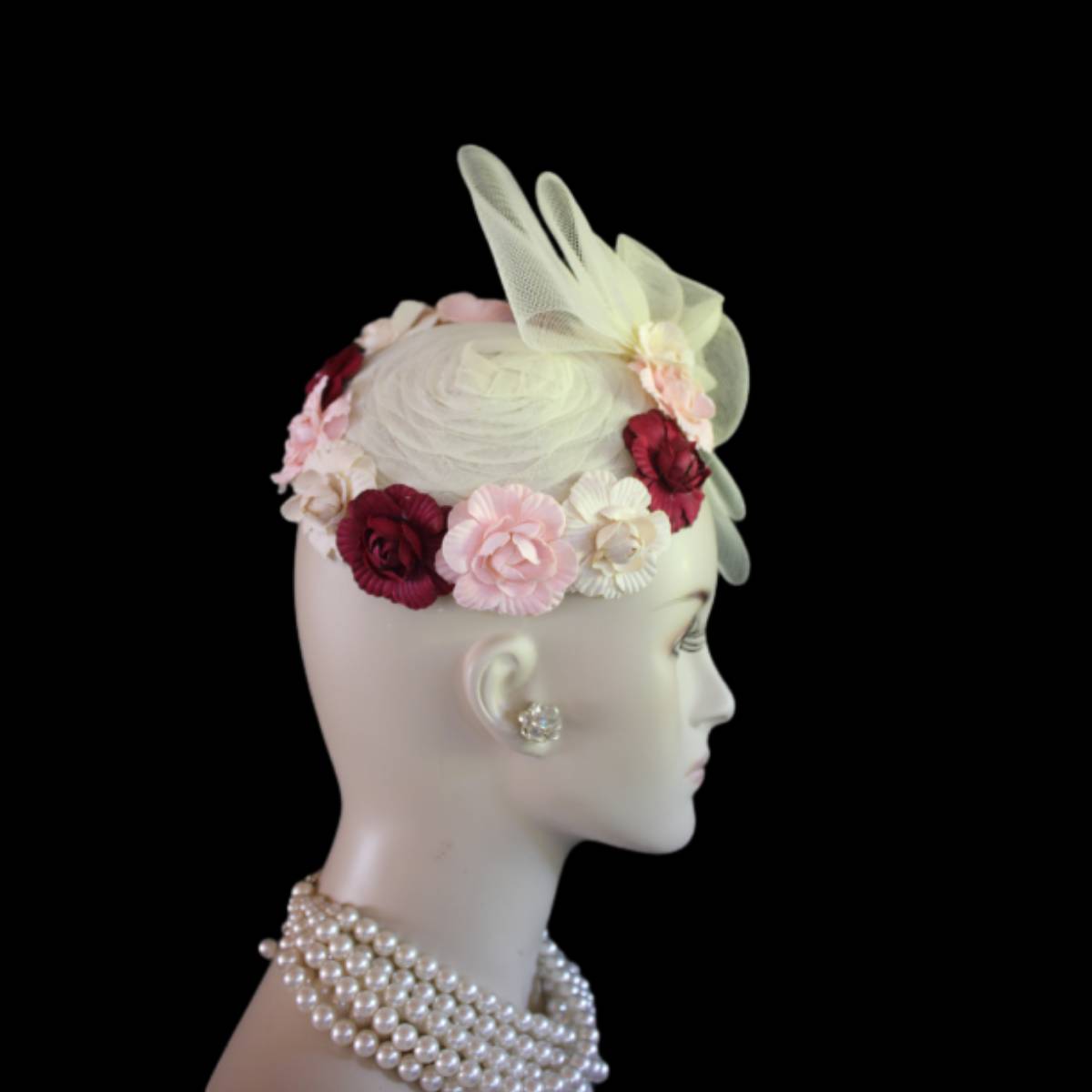 Imagine the carefree spirit and whimsical elegance encapsulated in a sweeping sheer ivory crinoline bow, flowing effortlessly like a delicate breeze. This dreamlike design dances with handcrafted vintage flowers in soft beige, pink, and burgundy, wrapping around the lower edge of the hat in a way that evokes a timeless romance. This custom-made beauty reimagines the classic pillbox style, fusing creativity with a touch of modern flair to create a tactile masterpiece that’s as unique as the wearer.