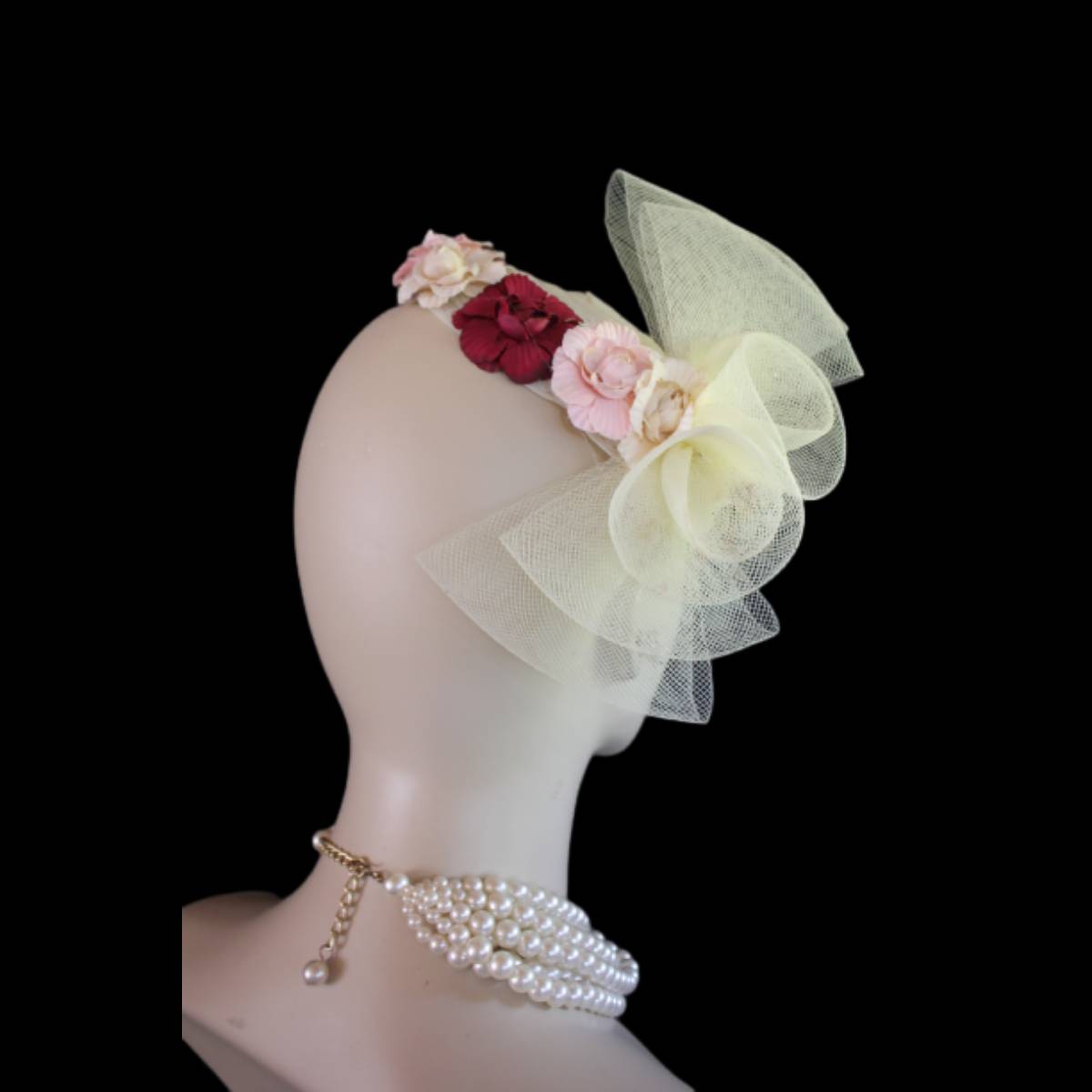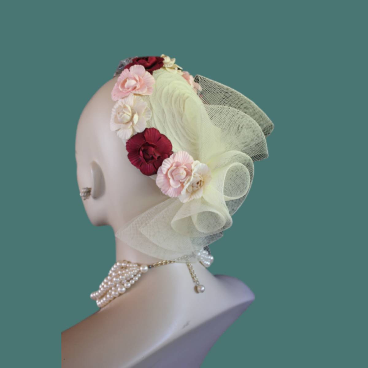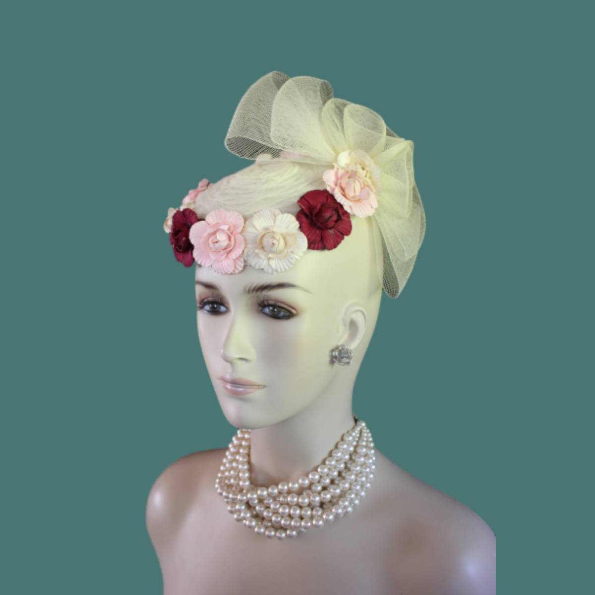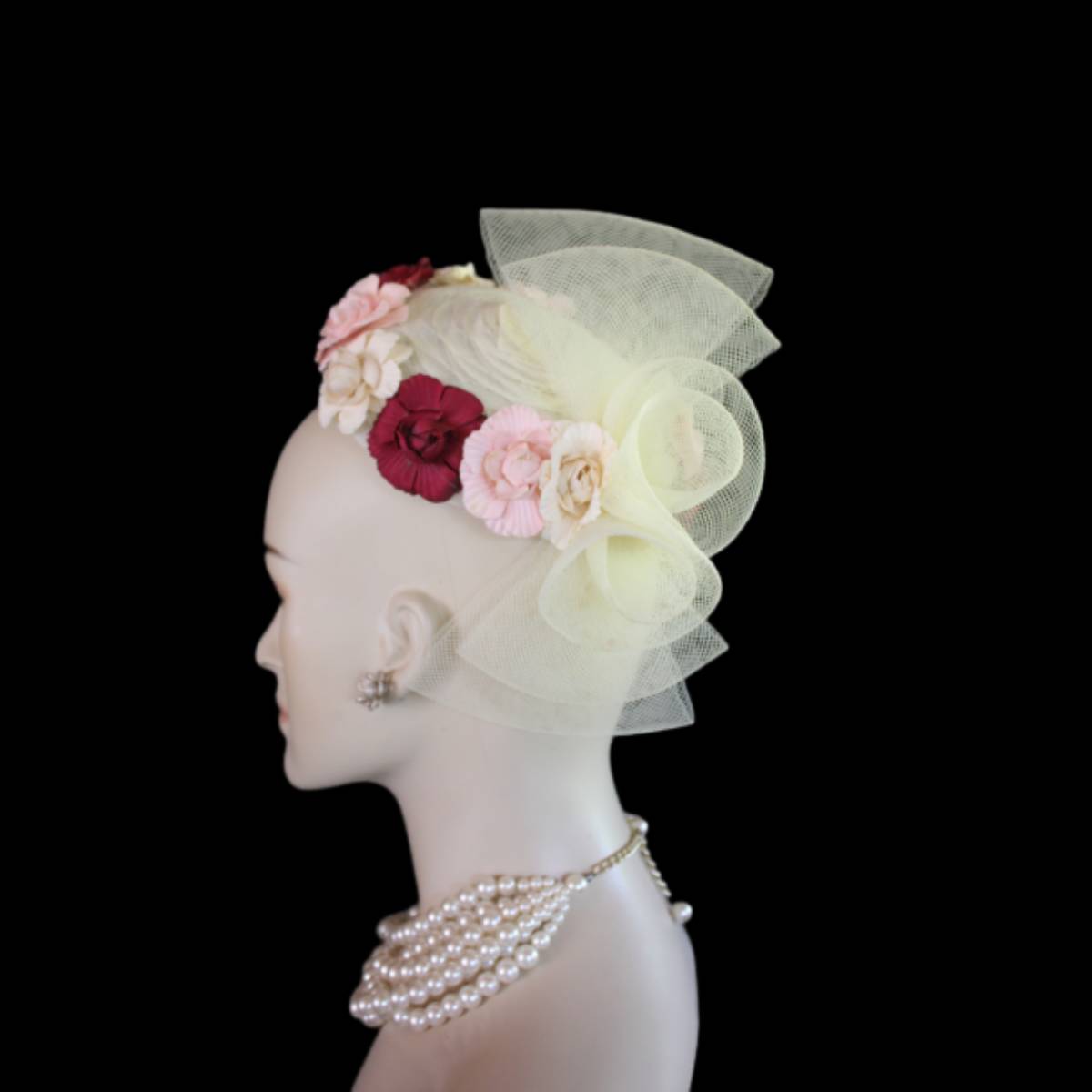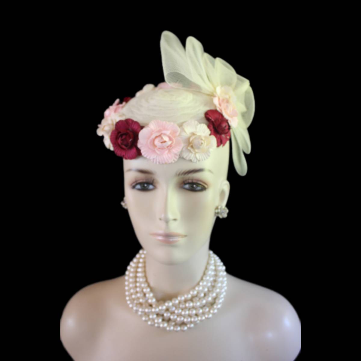 Imagine the carefree spirit and whimsical elegance encapsulated in a sweeping sheer ivory crinoline bow, flowing effortlessly like a delicate breeze. This dreamlike design dances with handcrafted vintage flowers in soft beige, pink, and burgundy, wrapping around the lower edge of the hat in a way that evokes a timeless romance. This custom-made beauty reimagines the classic pillbox style, fusing creativity with a touch of modern flair to create a tactile masterpiece that’s as unique as the wearer.