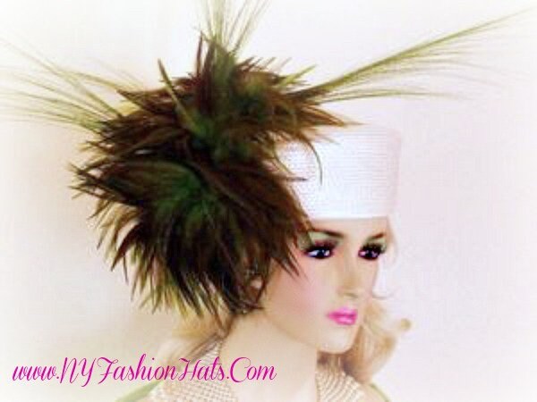 Avant Garde Luxurious Haute Couture Feather Pillbox Hat, Ivory Beige Lime Olive Green Brown Occasion Hat, NYFashionHats Haute Couture Millinery Hat, Rio By NYFashionHats.Com