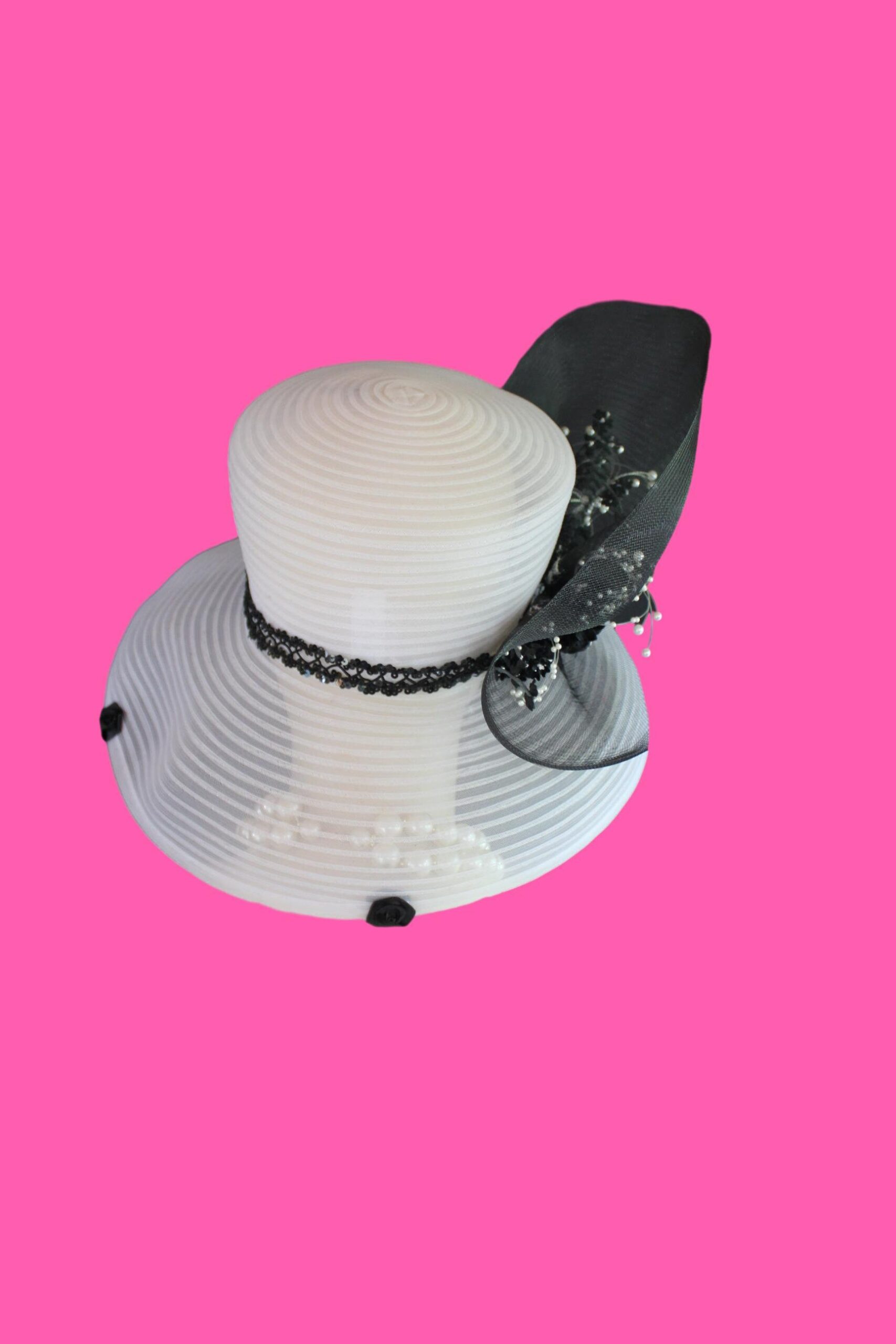 Women’s Haute Couture Designer Sheer Black And White Wedding Formal Hat Bridal Headpiece. This Avant Garde Statement Large Brimmed Church Hat Is Embellished With A Large Black Sheer Horsehair Crinoline Bow. Placed Inside This Fabulous Bow Are Vintage Handmade Black Silk Flowers Encrusted With White Pearls. A Delicate Black Trim Encircles The Lower Portion Of The Crown On This Lovely Dress Hat. Black Satin Rosettes Are Placed Around The Hat For Added Design. This Hat Speaks For Itself In Style And Design. NOTE: The Brim Can Be Worn Rolled Up Or Worn As A Lampshade Style Hat. This Is A Versatile Hat.