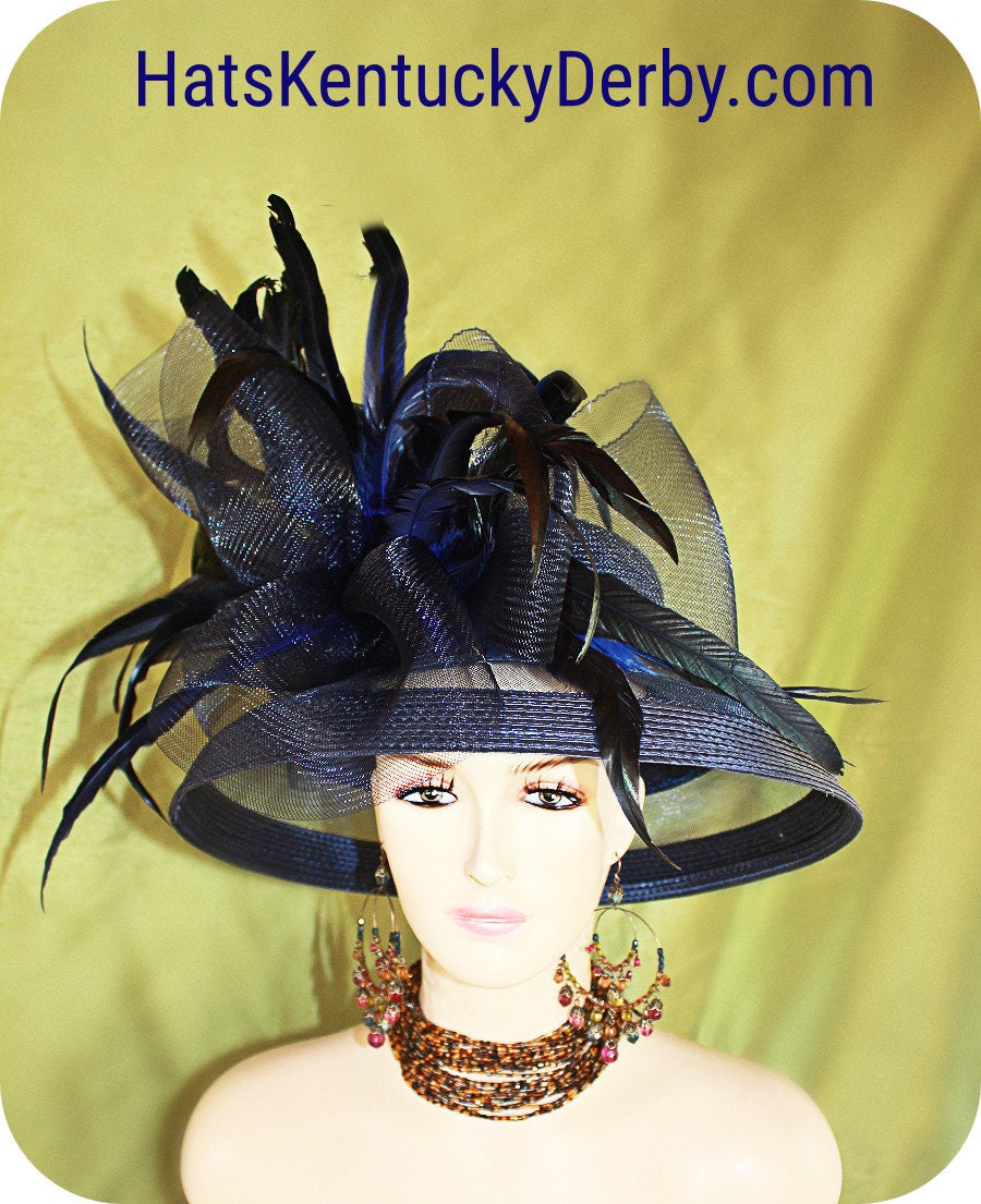 Custom Made Headwear Millinery,Navy Blue Poly Straw Braid,Navy Blue Horsehair Crinoline Big Bow,Exotic Rooster Long Coque Feathers,NY Fashion Hats Haute Couture Millinery,Custom Hats For Horse Races And Events,Partial Sheer Big Large Wide Brim