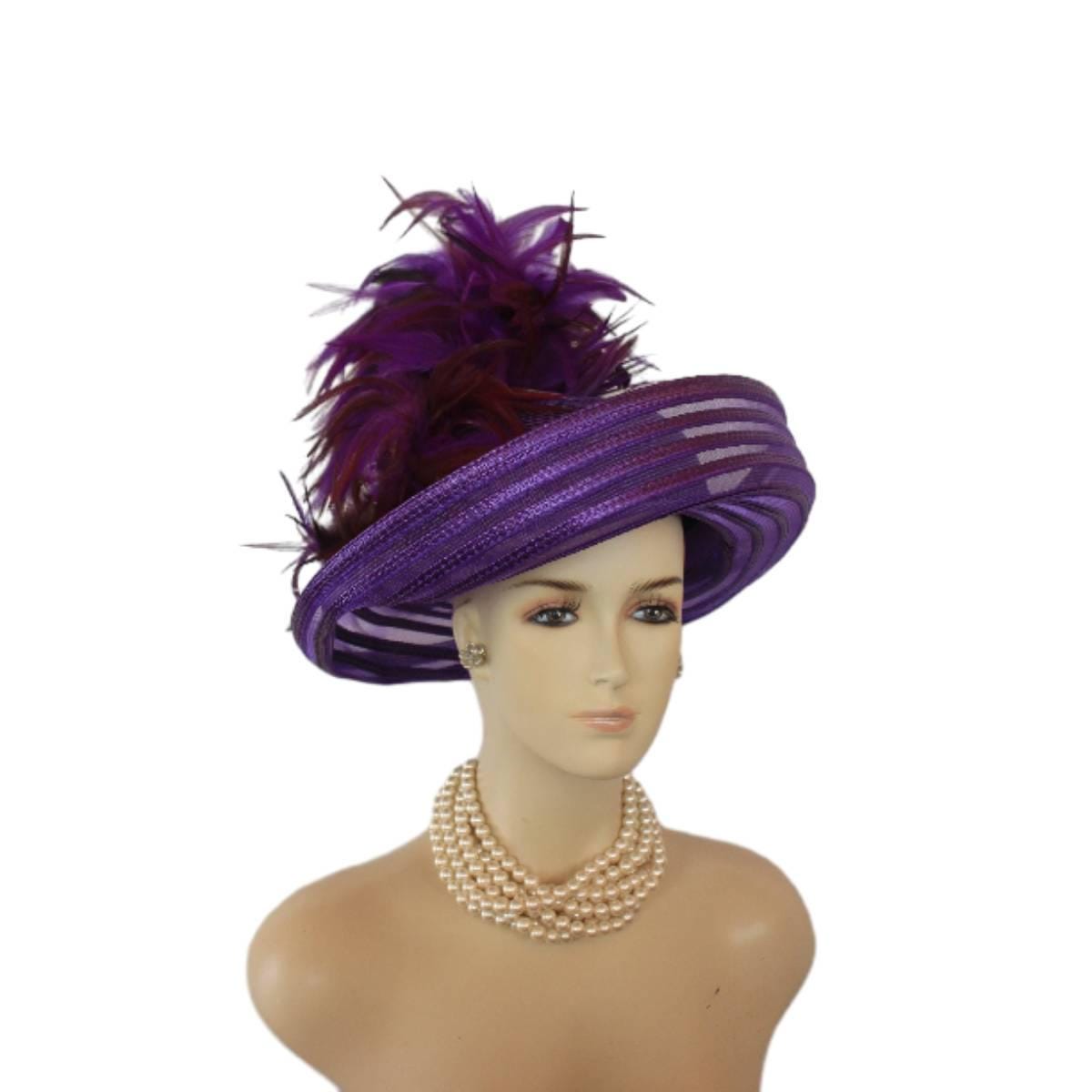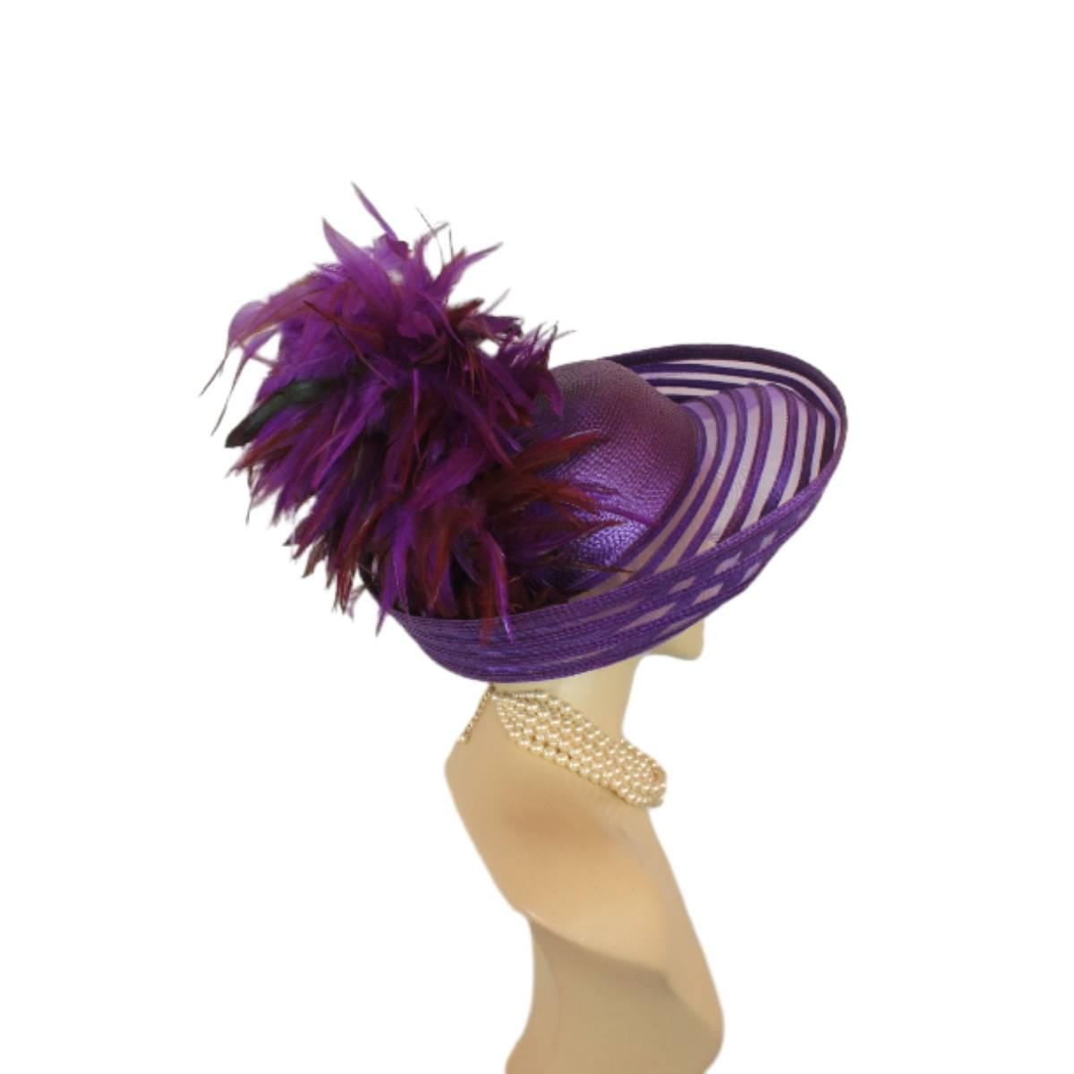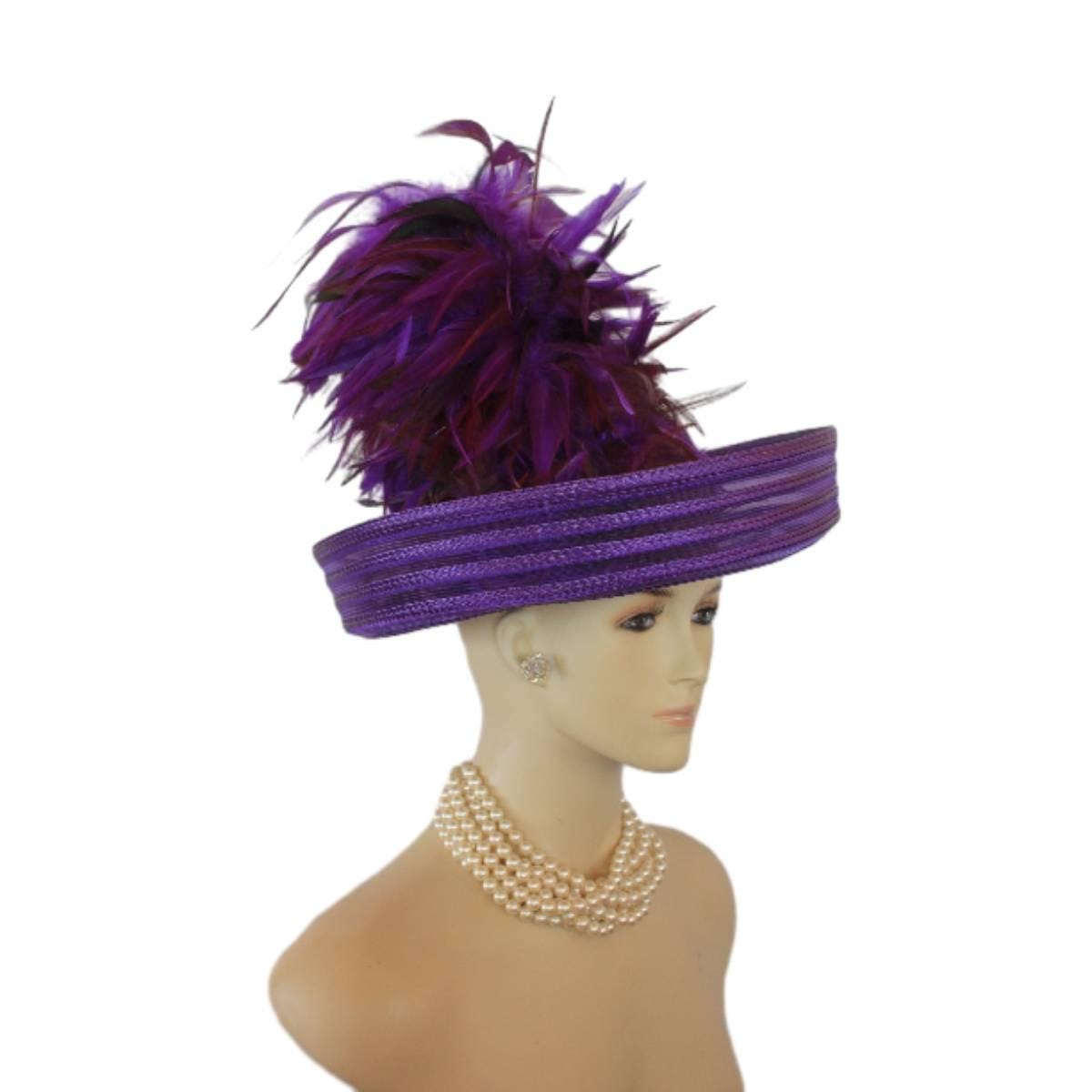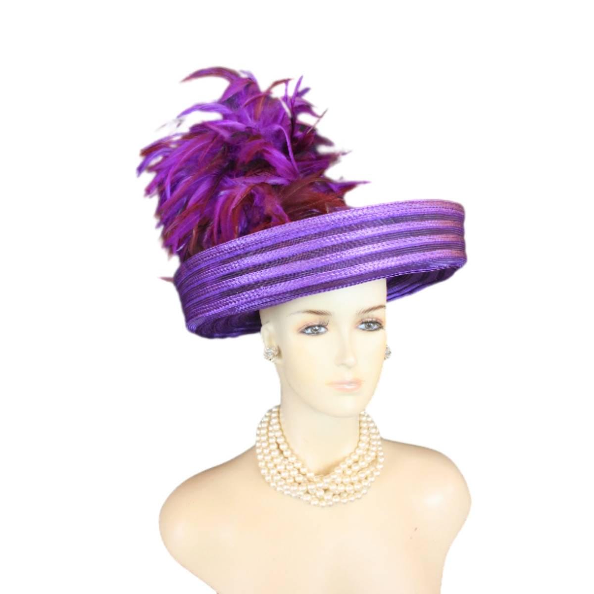 Elevate your fashion statement with our exquisite feathered Avant Garde Royal Purple Haute Couture roll-up sheer wide brimmed hat. This striking designer headpiece is adorned with vibrant, deep multi colored purple rooster hackle feathers that stand in an upright position, enhanced by a mesmerizing iridescent sheen. This luxurious hat transforms any outfit into a high-fashion masterpiece, making it the ideal accessory for the mother of the bride, the bride herself, or wedding guests eager to leave a memorable impression. This special occasion dress hat is an essential addition for luncheons, church services, festive gatherings, and iconic horse racing events such as the Kentucky Derby, Breeder’s Cup, The Preakness Stakes, Royal Ascot, Grand National Steeplechase, Prix de l’Arc de Triomphe in France, Pegasus World Cup, Dubai World Cup, Virginia World Cup, and Melbourne Cup. This glamorous headpiece, with its unique design, beautifully complements your wardrobe while embodying the elegance synonymous with luxurious feathered accessories.