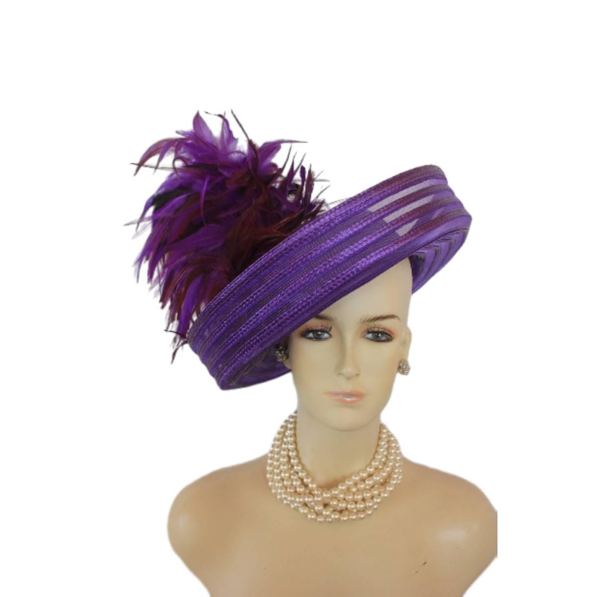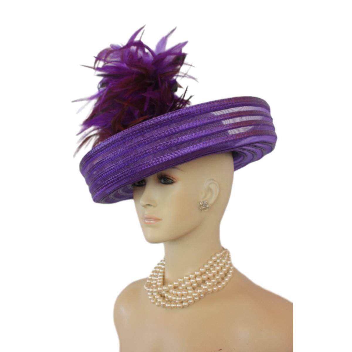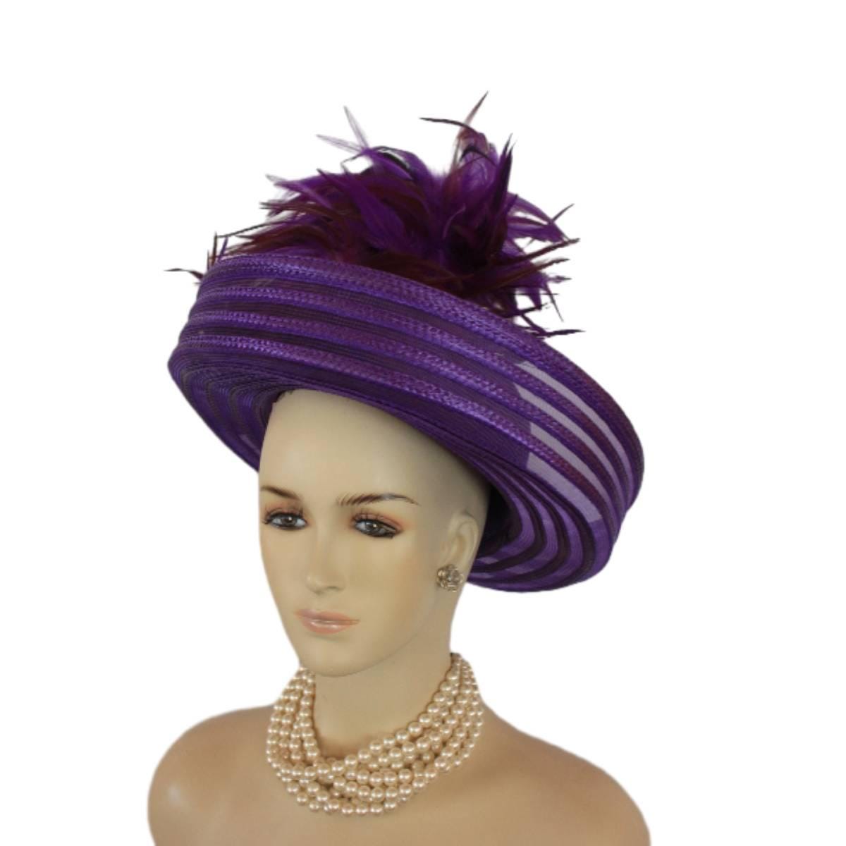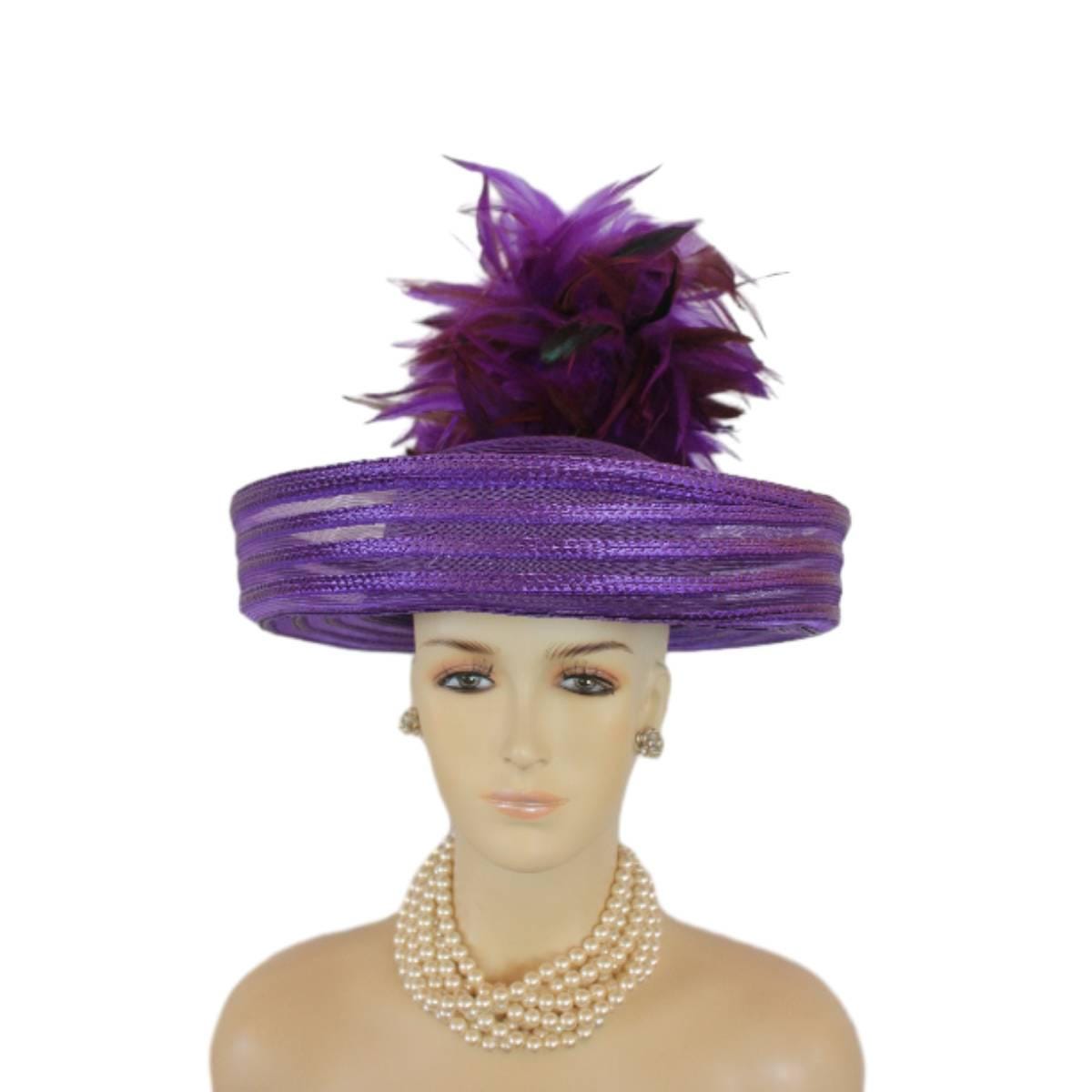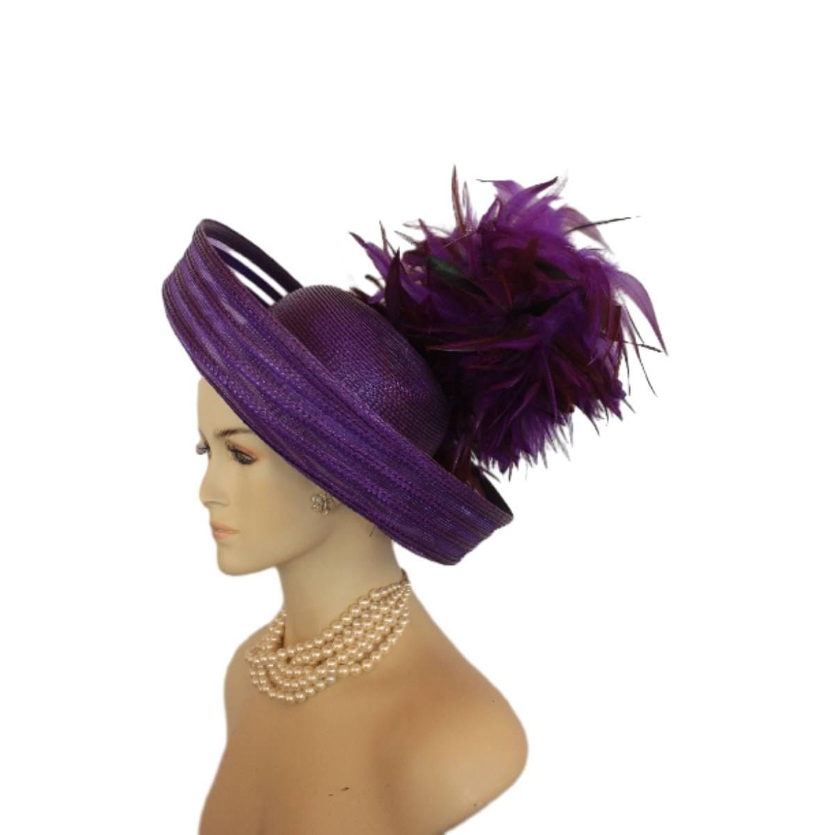 Elevate your fashion statement with our exquisite feathered Avant Garde Royal Purple Haute Couture roll-up sheer wide brimmed hat. This striking designer headpiece is adorned with vibrant, deep multi colored purple rooster hackle feathers that stand in an upright position, enhanced by a mesmerizing iridescent sheen. This luxurious hat transforms any outfit into a high-fashion masterpiece, making it the ideal accessory for the mother of the bride, the bride herself, or wedding guests eager to leave a memorable impression. This special occasion dress hat is an essential addition for luncheons, church services, festive gatherings, and iconic horse racing events such as the Kentucky Derby, Breeder’s Cup, The Preakness Stakes, Royal Ascot, Grand National Steeplechase, Prix de l’Arc de Triomphe in France, Pegasus World Cup, Dubai World Cup, Virginia World Cup, and Melbourne Cup. This glamorous headpiece, with its unique design, beautifully complements your wardrobe while embodying the elegance synonymous with luxurious feathered accessories.