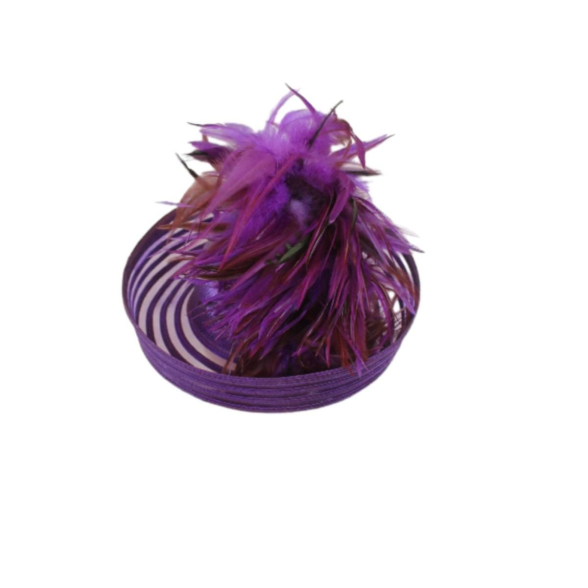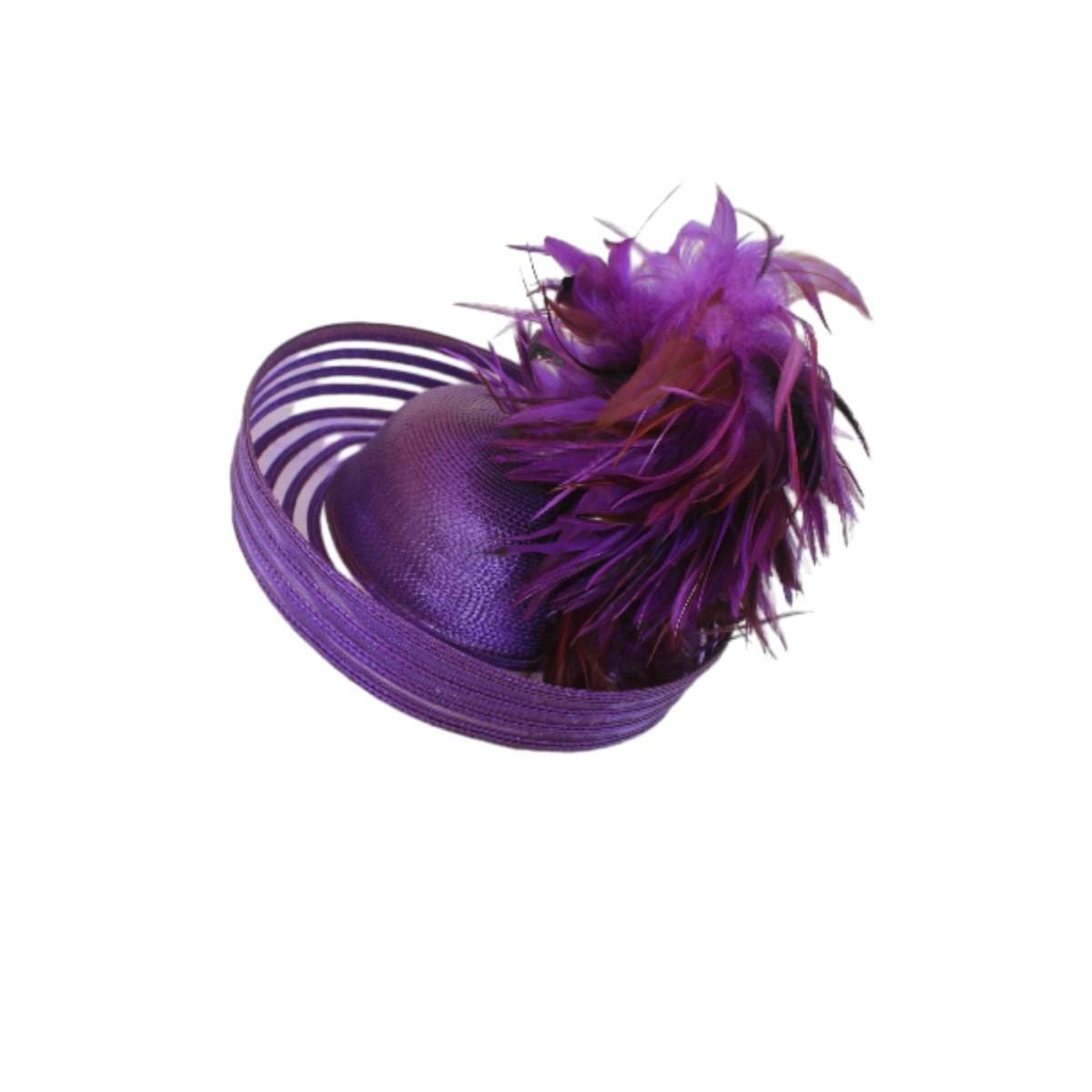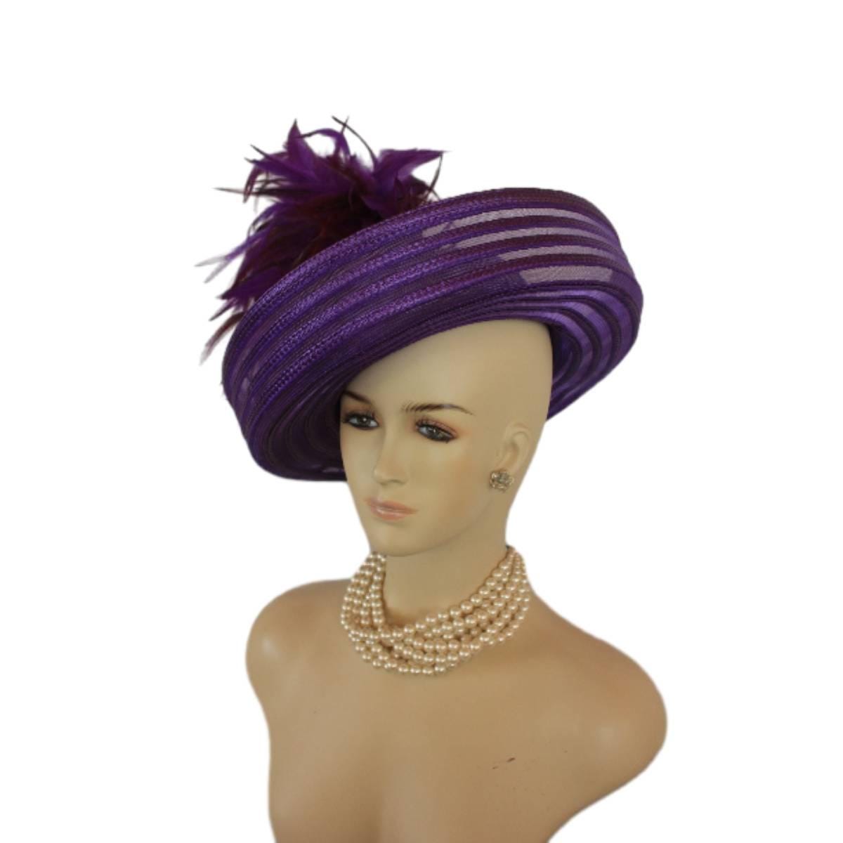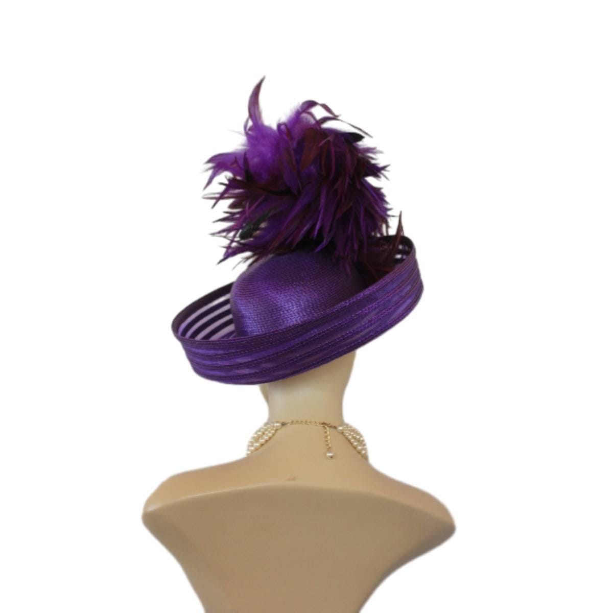 Elevate your fashion statement with our exquisite feathered Avant Garde Royal Purple Haute Couture roll-up sheer wide brimmed hat. This striking designer headpiece is adorned with vibrant, deep multi colored purple rooster hackle feathers that stand in an upright position, enhanced by a mesmerizing iridescent sheen. This luxurious hat transforms any outfit into a high-fashion masterpiece, making it the ideal accessory for the mother of the bride, the bride herself, or wedding guests eager to leave a memorable impression. This special occasion dress hat is an essential addition for luncheons, church services, festive gatherings, and iconic horse racing events such as the Kentucky Derby, Breeder’s Cup, The Preakness Stakes, Royal Ascot, Grand National Steeplechase, Prix de l’Arc de Triomphe in France, Pegasus World Cup, Dubai World Cup, Virginia World Cup, and Melbourne Cup. This glamorous headpiece, with its unique design, beautifully complements your wardrobe while embodying the elegance synonymous with luxurious feathered accessories.