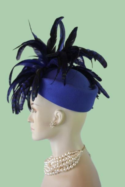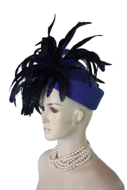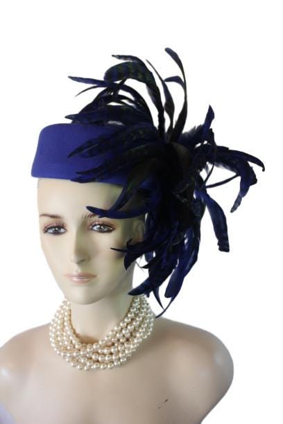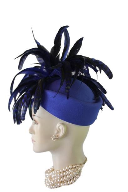 Elevate your fashion statement with our exquisite feathered Avant Garde Royal Blue Haute Couture Felt Pillbox Hat. This striking designer headpiece is adorned with vibrant, multi-colored royal blue tiger rooster coque feathers, enhanced by a mesmerizing black and deep emerald green iridescent sheen. This luxurious hat transforms any outfit into a high-fashion masterpiece, making it the ideal accessory for the mother of the bride, the bride herself, or wedding guests eager to leave a memorable impression. This special occasion dress hat is an essential addition for luncheons, church services, festive gatherings, and iconic horse racing events such as the Kentucky Derby, Breeder’s Cup, The Preakness Stakes, Royal Ascot, Grand National Steeplechase, Prix de l’Arc de Triomphe in France, Pegasus World Cup, Dubai World Cup, Virginia World Cup, and Melbourne Cup. This glamorous headpiece, with its unique design, beautifully complements your wardrobe while embodying the elegance synonymous with luxurious feathered accessories.