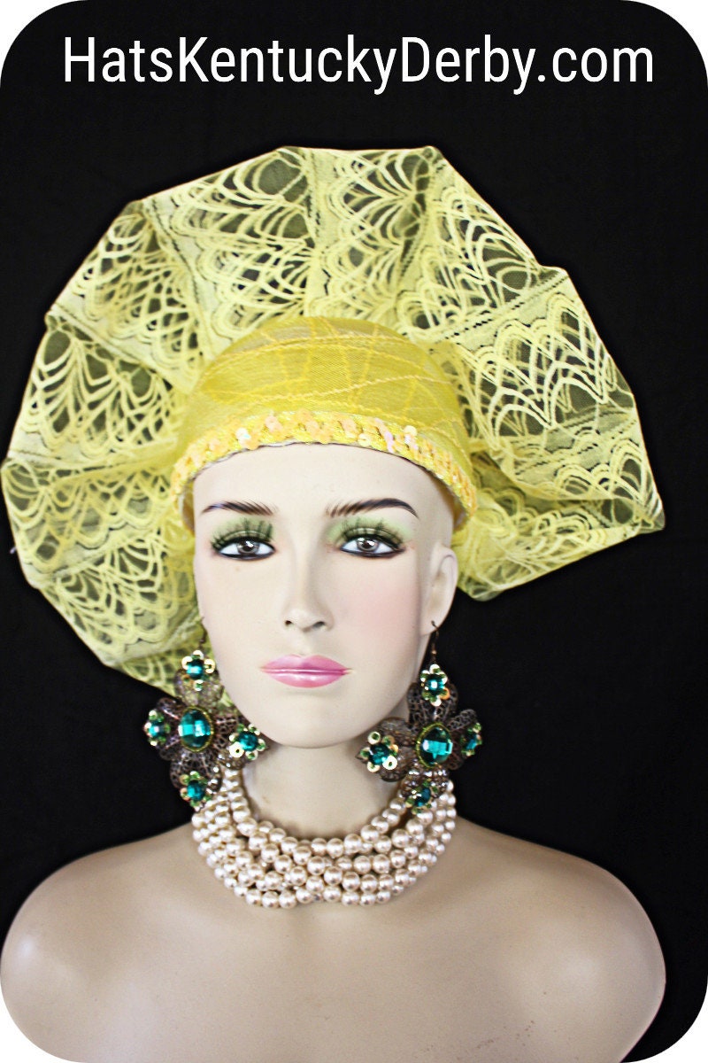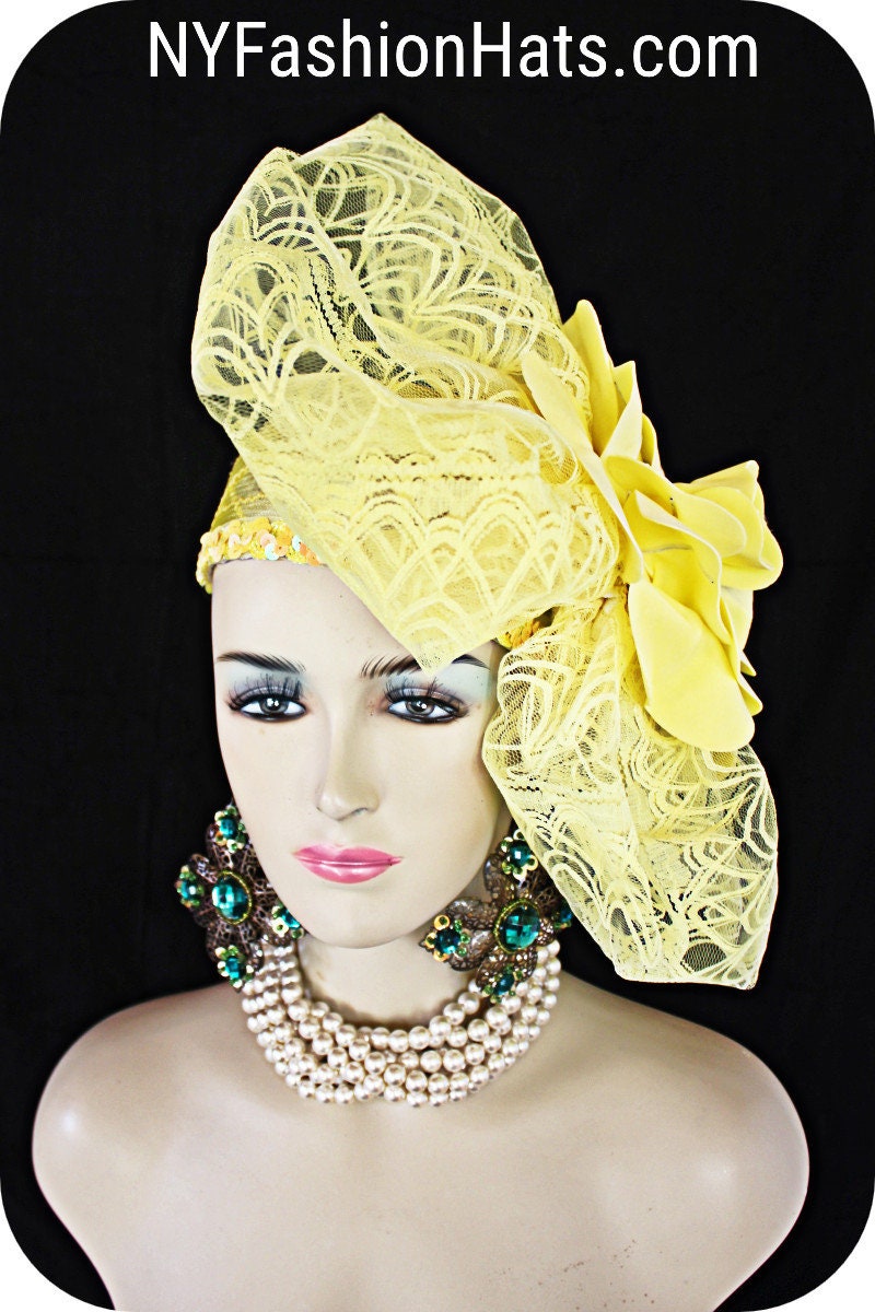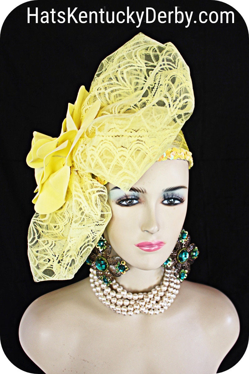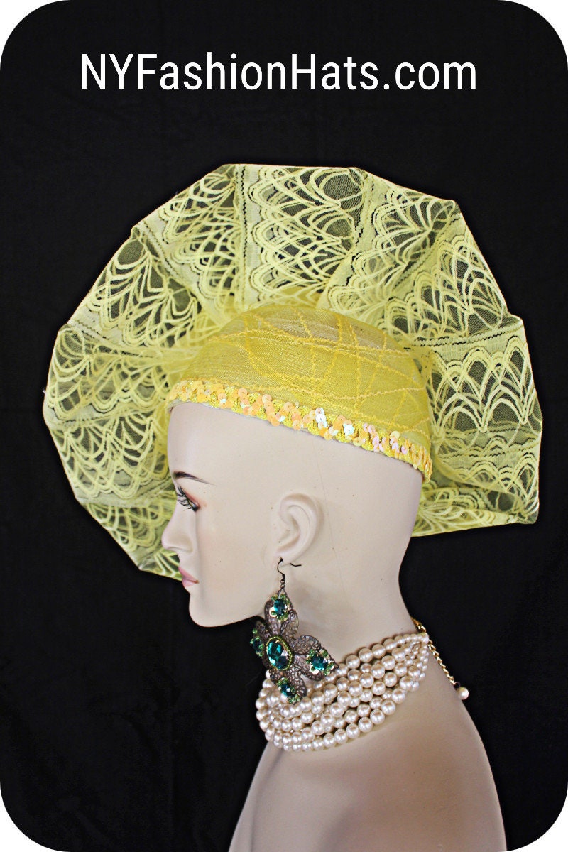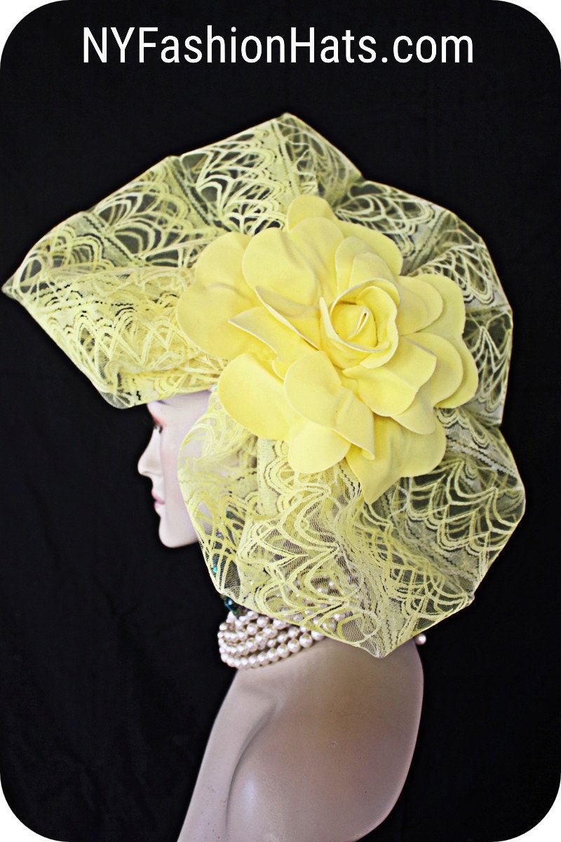 Custom Made Headwear Millinery,Horsehair Crinoline Hat,Hige Yellow Stiff Lace Handmade Bow,Big Yellow Foam Statement Rose,Decorative Yellow Sequin Trim