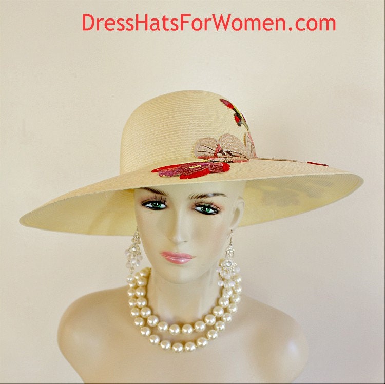 Beige Haute Couture Fashion Hat Women,Poly Straw Braid Formal Wedding Hat,Multi Color Embroidered Floral Applique,Handmade Applique