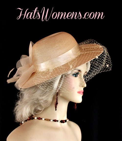 Beige Medium Brim Wedding Bridal Hat With A Birdcage Veil, Mother Of The Bride Couture Designer Hat, Traditional Formal Dress Hat, NYFashionHat Edith