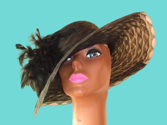 Wide Brim Horsehair Designer Hat,Rooster Chandelle Feathers,Couture Designer Fashion Hat For Women,This Hat Is Custom Made To Your Order,dress hats for women,black wide brim hat,Custom Feather Color Choices