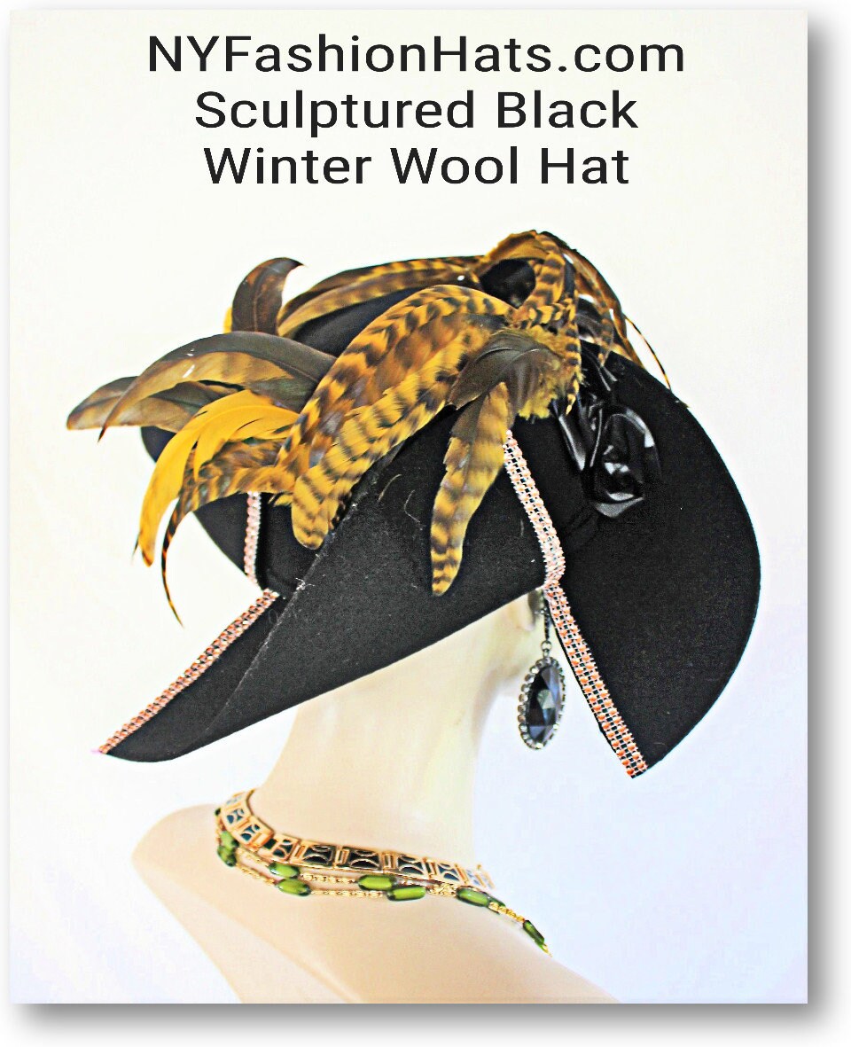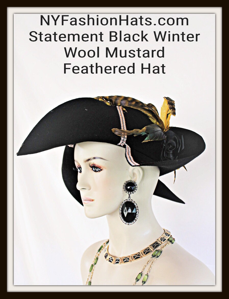 Black Shaped Wool Winter Hat,ONE OF A KIND HAT,Mustard Golden Yellow Black Rooster Feathers,Large Black Satin Rosettes,Glittering Rhinestones,Handmade Millinery Hat For Women