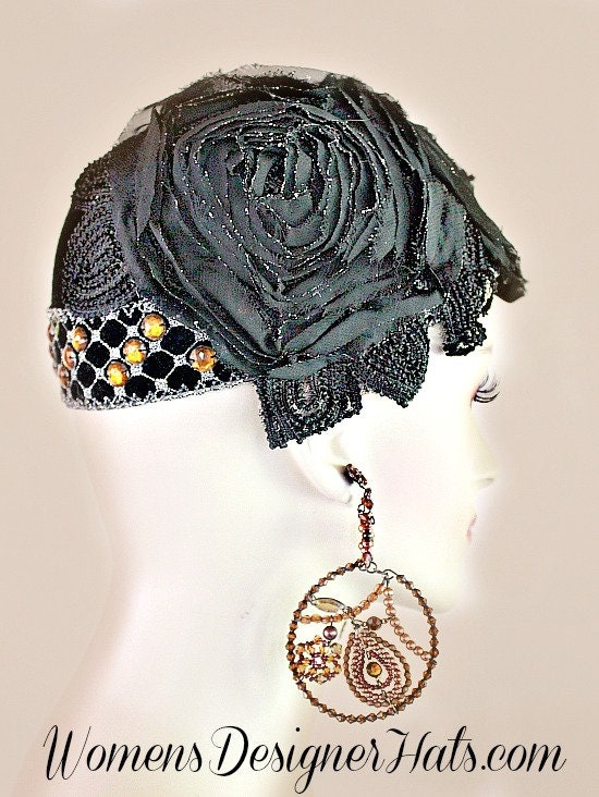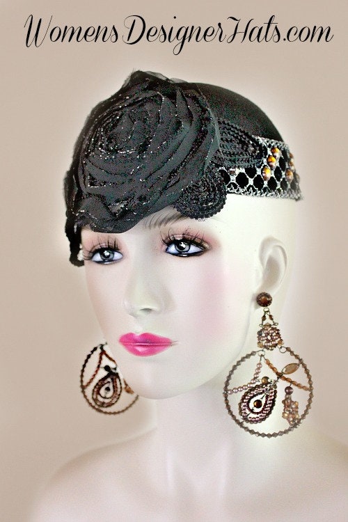 Black And Metallic Silver Couture Cocktail Formal Hat For Women. Hand Made 1920’s Flapper – Art Deco Era Designer Fashion Hat. This Designer Hat Is Trimmed With A Black And Metallic Silver Flower Rose Applique Covering A Large Portion Of The Hat. A Stunning Vintage Orange Beaded, Metallic Silver, Black Velvet Trim Encircles The Crown Of This Couture Pillbox Hat. Measurements: 22.5″ Crown Size, Soft Crown Style – Fits Most Women. New Condition – Custom Made Couture Fashion Hat Material: Black Wool – Hat Is Appropriate For Winter And FallThis Hat Can Be Worn In Different Positions. Can Be Worn More Toward The Back Of The Head Or As A Cloche Fashion Hat. This Designer Custom Made Hat Is A Show Stopper. This Formal Black Dress Hat Is Suited For Weddings, Formals, Holidays, The Kentucky Derby, Horse Races, Church, And Special Occasion. This Hat Is Custom Made And Designed By Women’s Designer Hats, NY Fashion Hats, www.nyfashionhats.comAll Sales Are Final.