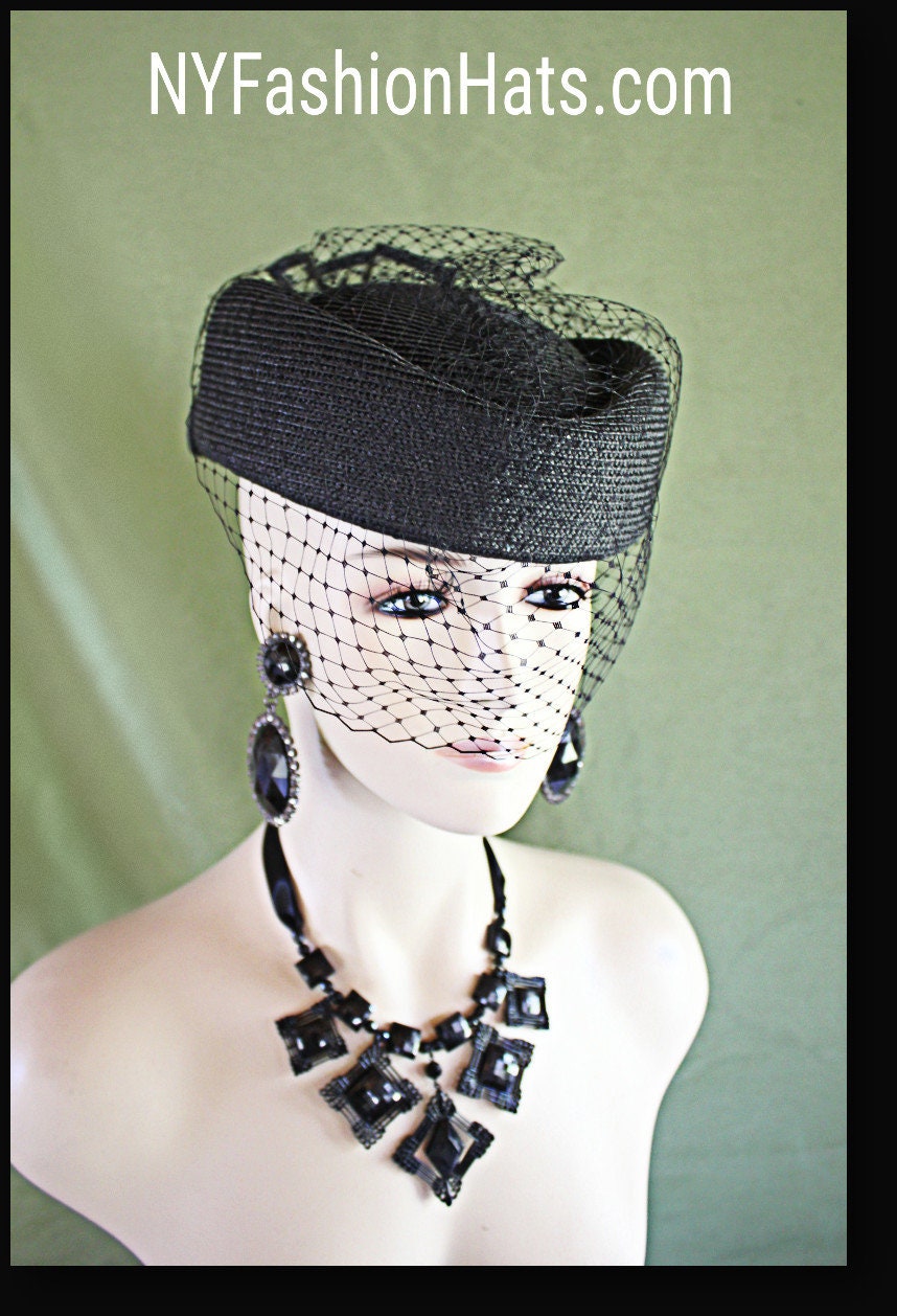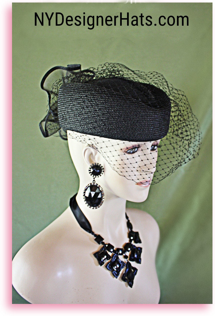 Handmade Couture Designer Hat,Polyproplene Straw Braid,Horsehair Braid Bow Trimmed Edge,Classic Styled Shaped Crown,Pillbox Hat With A Birdcage Veil,NYFashionHats Millinery,CoutureDesignerHats,Black Pillbox Fashion Hat With A Veil