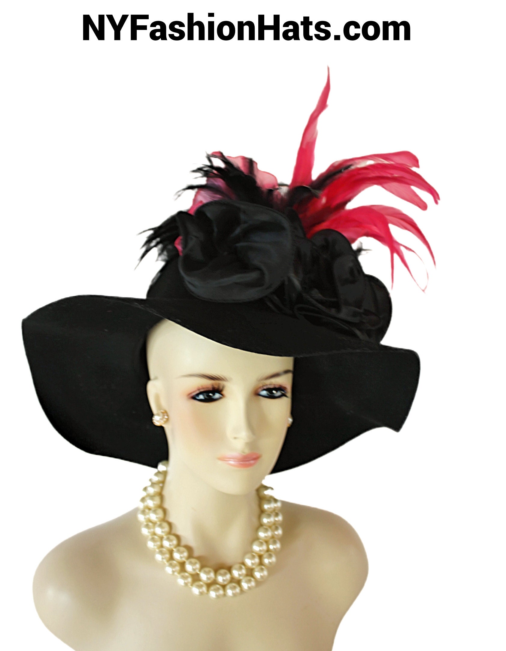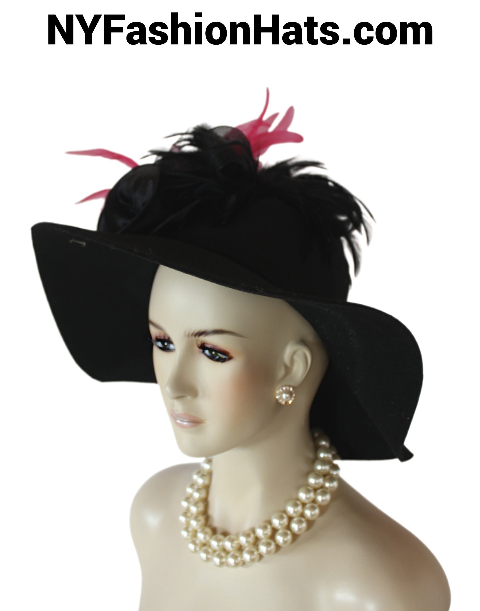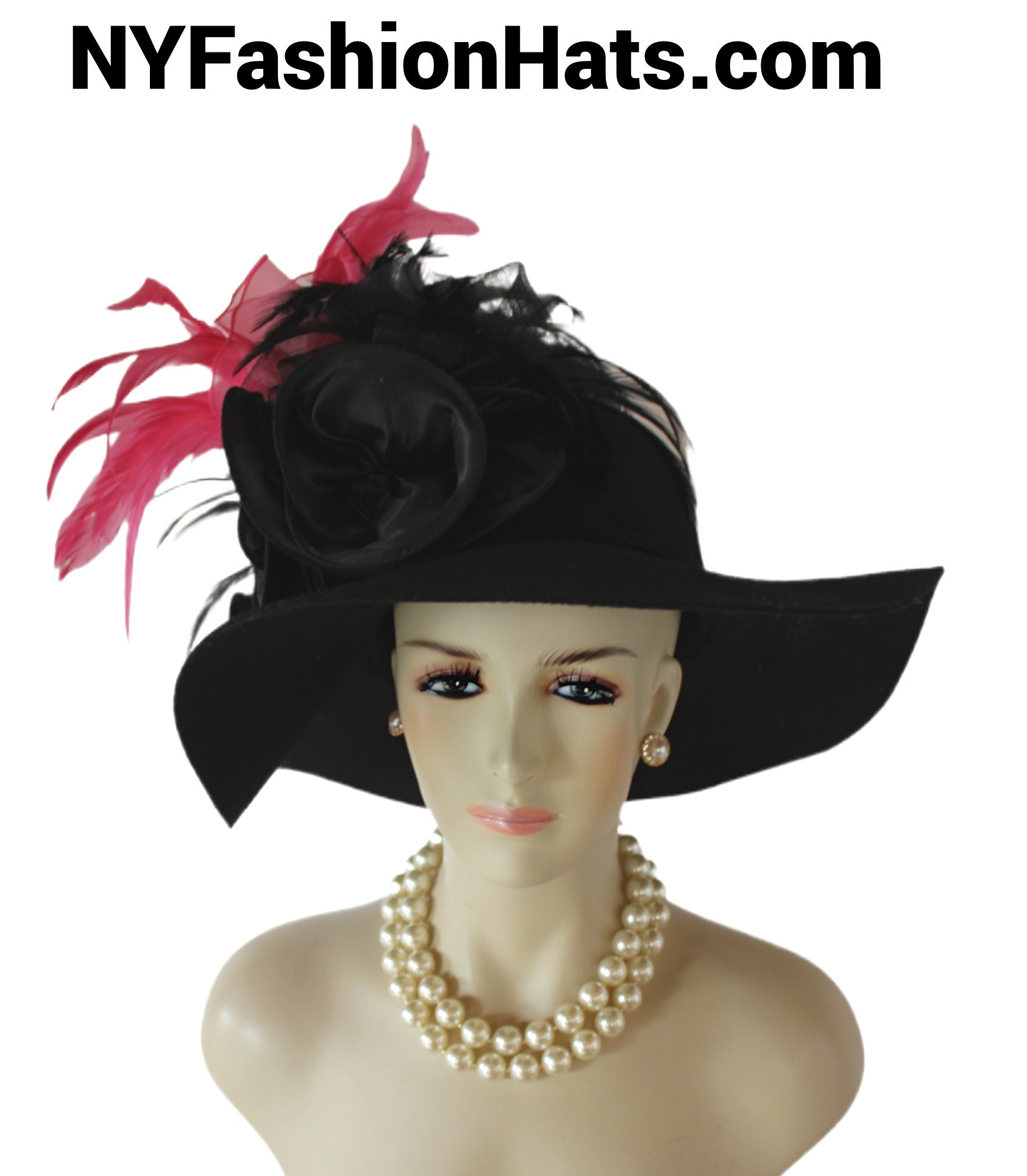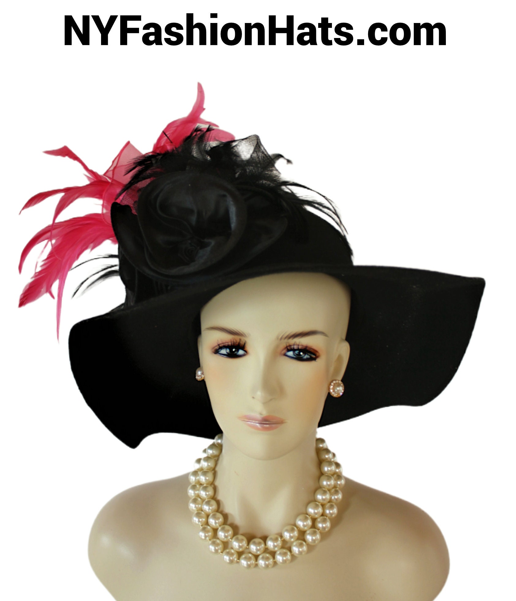 Women’s Formal Haute Couture Avant Garde Black And Hot Pink Feathered Winter Wool Satin Floppy Vintage Style Hat.