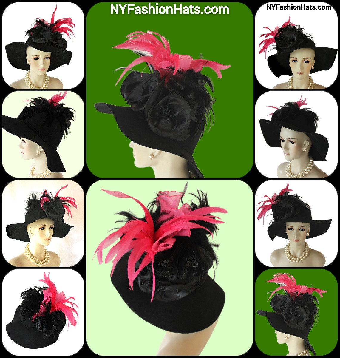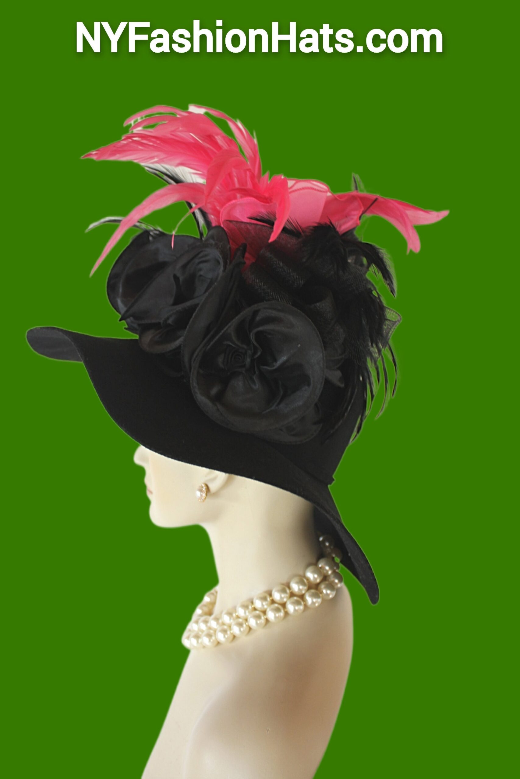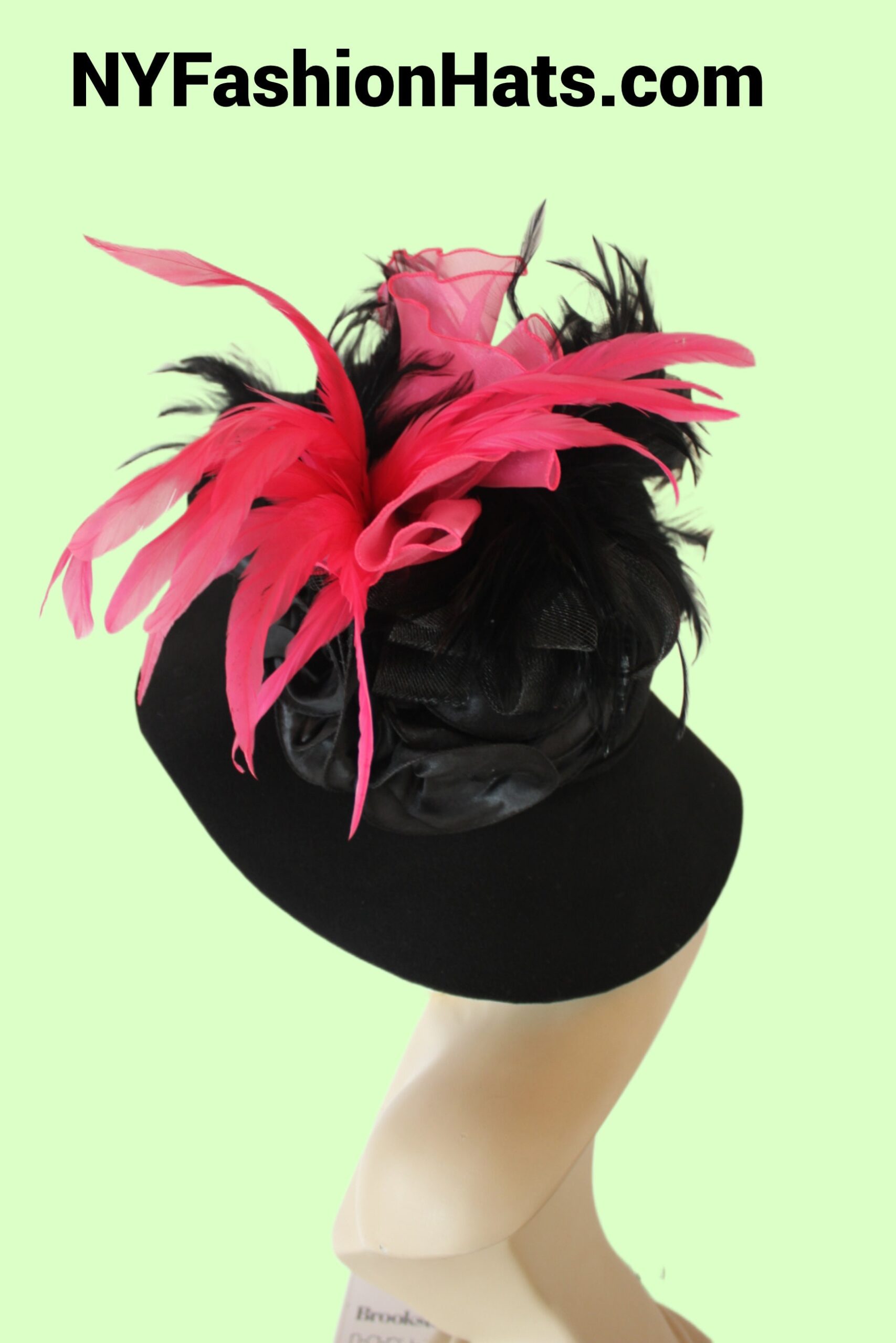 This Stylish Luxury Hat Is Embellished With Black Decorative Satin Bowing Mixed With Hot Pink Bowing. Placed In This Extravagent Bowing Are Black Expensive Rooster Hackle Feathers Enhanced With Exotic Hot Pink Long Rooster Coque Feathers.