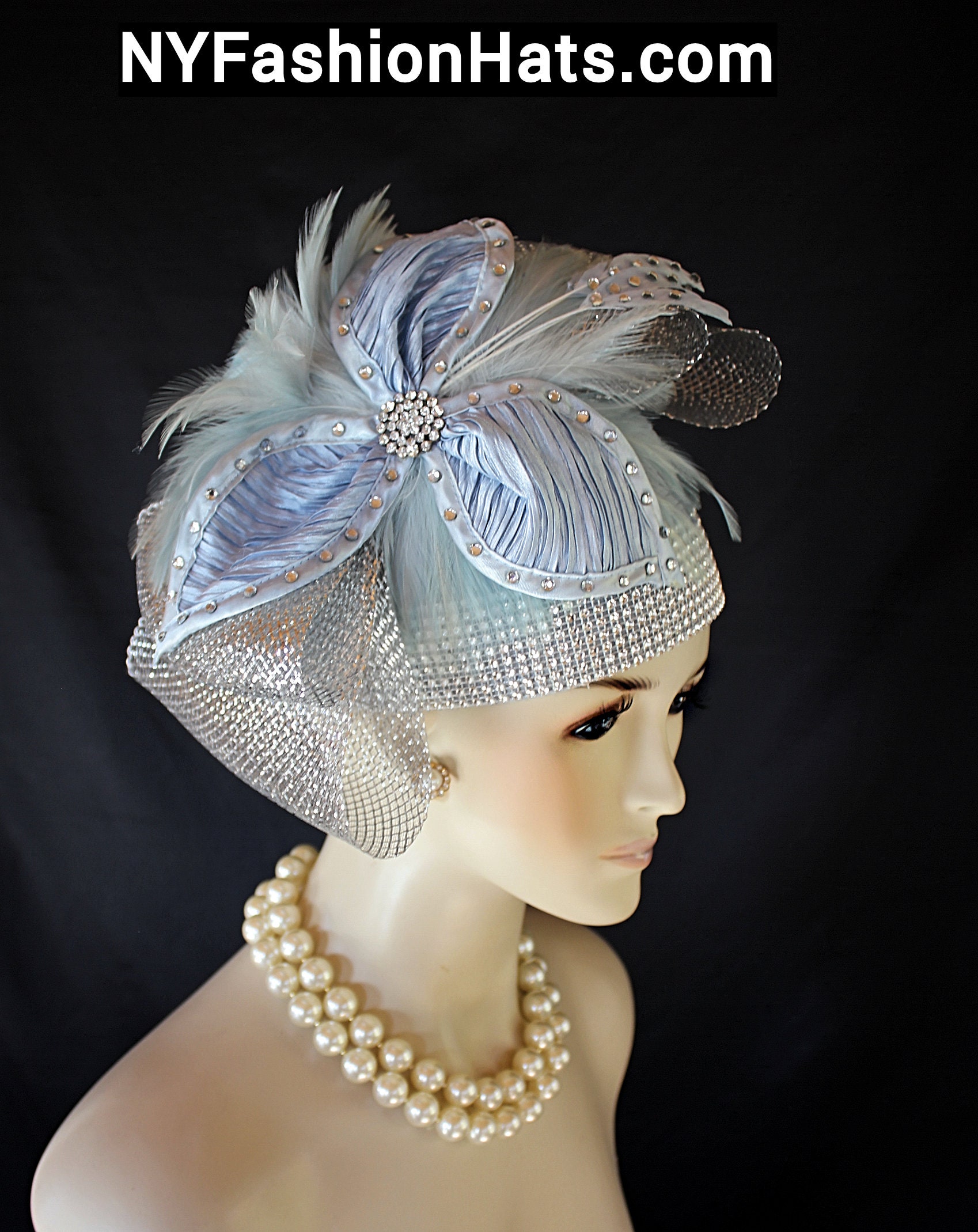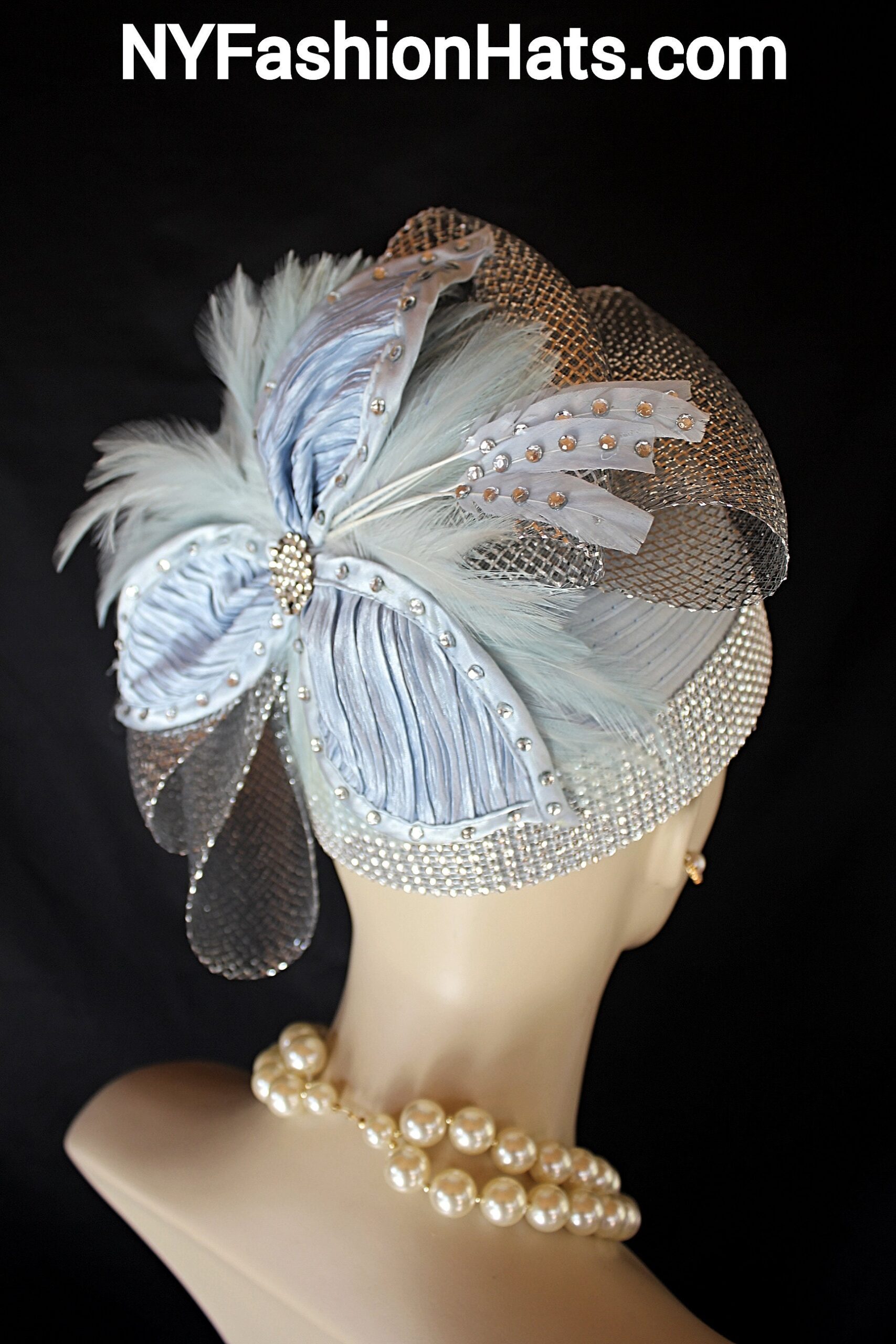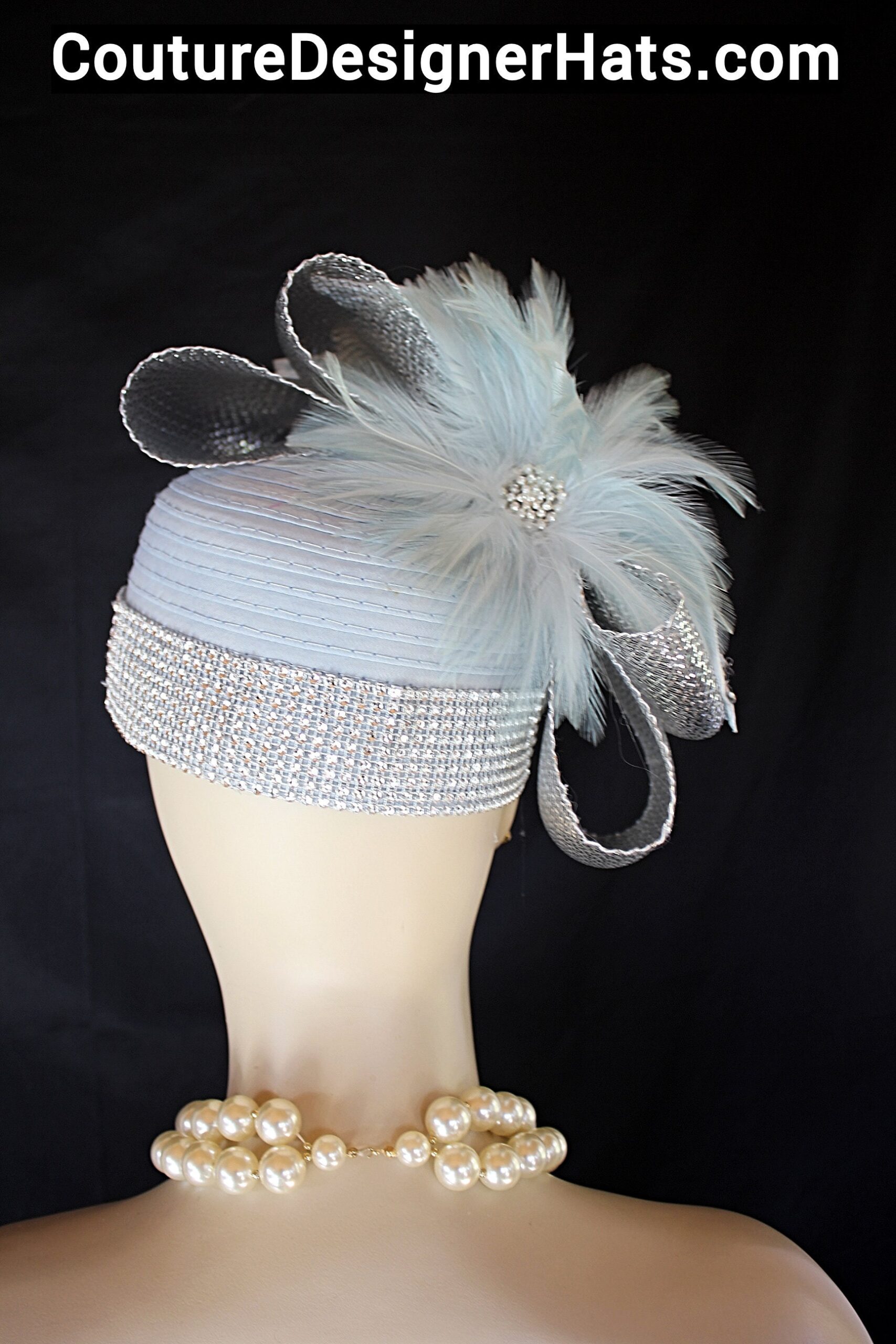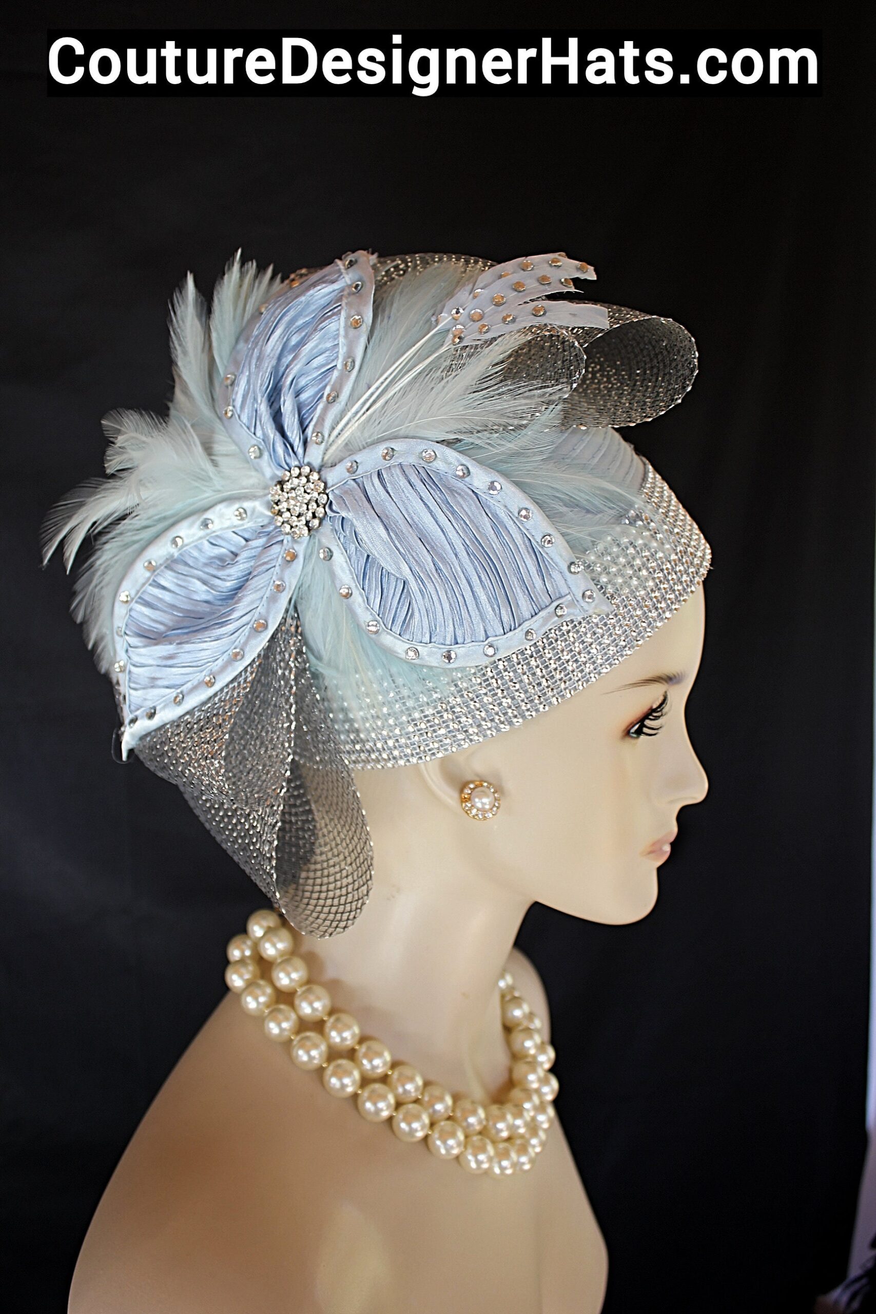 Baby Blue Haute Couture Satin Pillbox Wedding Bridal Formal Hat. This Is An Avant Garde Designer Hat For Women. This Hand Made Motf Premium Soft Blue Satin Pillbox Fashion Dress Hat Is Trimmed With A Large Metallic Silver Elaborate Bow Enhanced With A Baby Blue Satin Leaf Bow Trimmed With Rhinestones And A Large Rhinestone Brooch. Delicate Coque Feathers Embeded With Rhinestones Top Off This Femaine Bow. Also Placed Within This Beautiful Bow, Are Expensive Soft Baby Blue Hackle Feathers. A Rhinestone Hat Band Encircles The Crown Of This Elegant Ladies Hat. This Designer Custom Made Hat Is A Show Stopper. Suited For Winter, Spring, Summer And Fall.