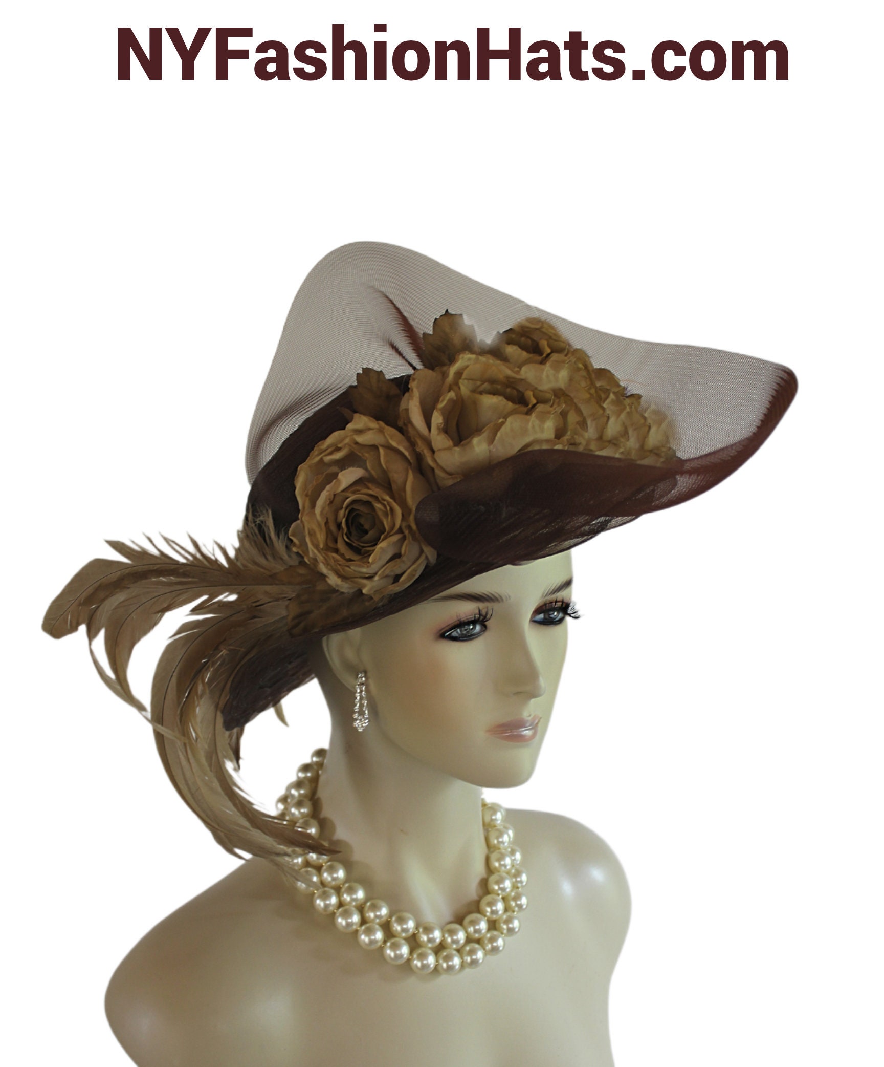 This Stylish Dark Brown Luxury Scallop Brim Hat Is Embellished With A Large Dark Brown Horsehair Crinoline Bow. Placed In This Extravagent Bowing Are Handmade Vintage Beige Cabbage Roses With Beautiful Leaves. To Top Off This Fantastic Hat, Beige Long Rooster Coque Feathers Add Such A Haute Couture Look. For Added Design A Large Satin Thick Padded Braid Band Encircles The Crown Of This Pretty Hat.