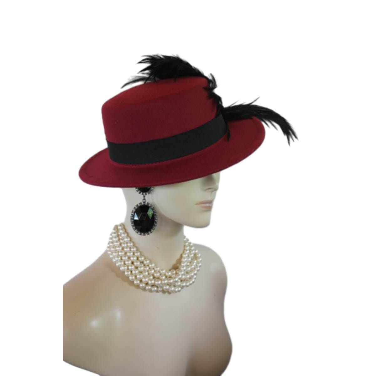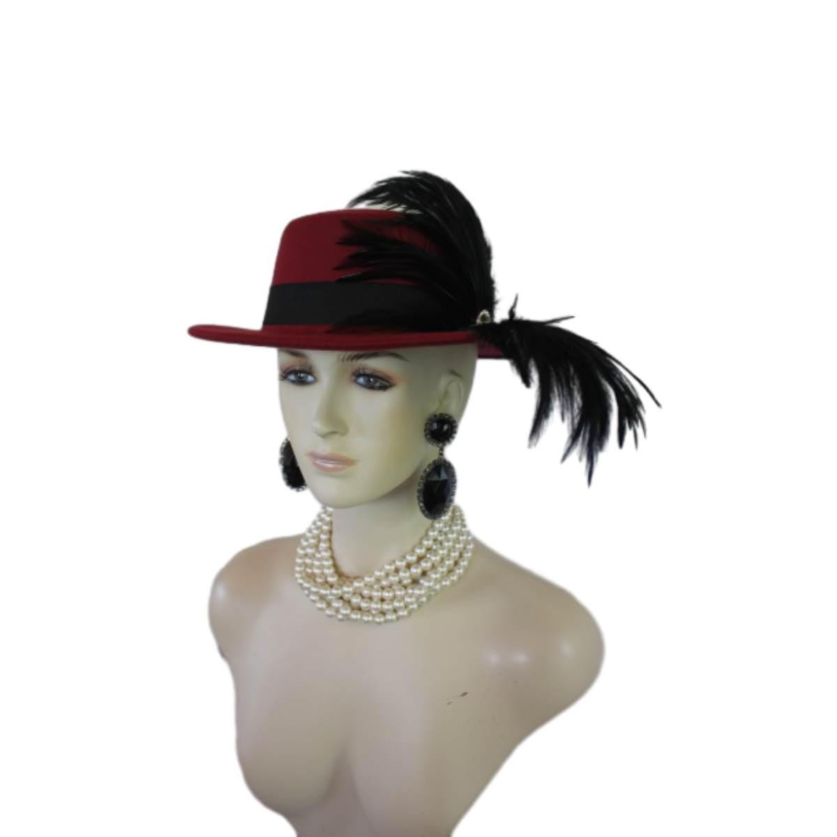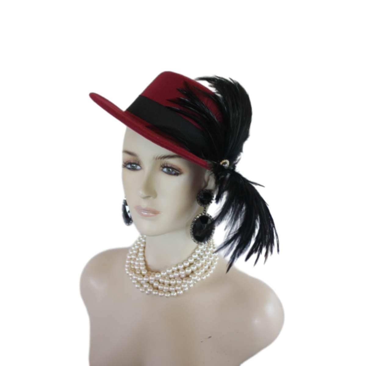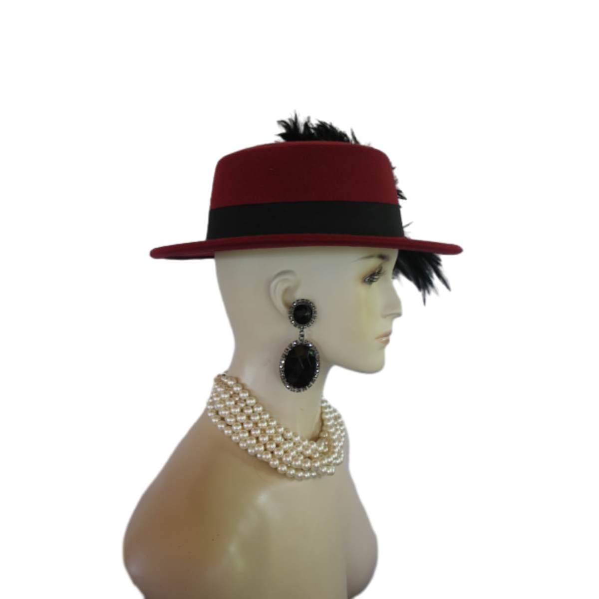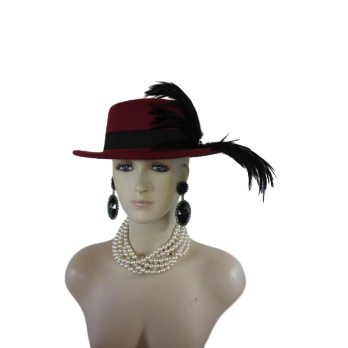 “””Elvolve into the realm of haute couture with the Ladies Burgundy Red Wine Gondola Bolero Gaucho Designer Hat—a true masterpiece that embodies the elegance and sophistication of high fashion. This striking boater-style hat, meticulously crafted by the renowned artisans at NYFashionHats.com, showcases an exquisite blend of sumptuous black rooster hackle feathers. Its daring design redefines what it means to make a fashion statement, ensuring that all eyes are on you at every occasion.
