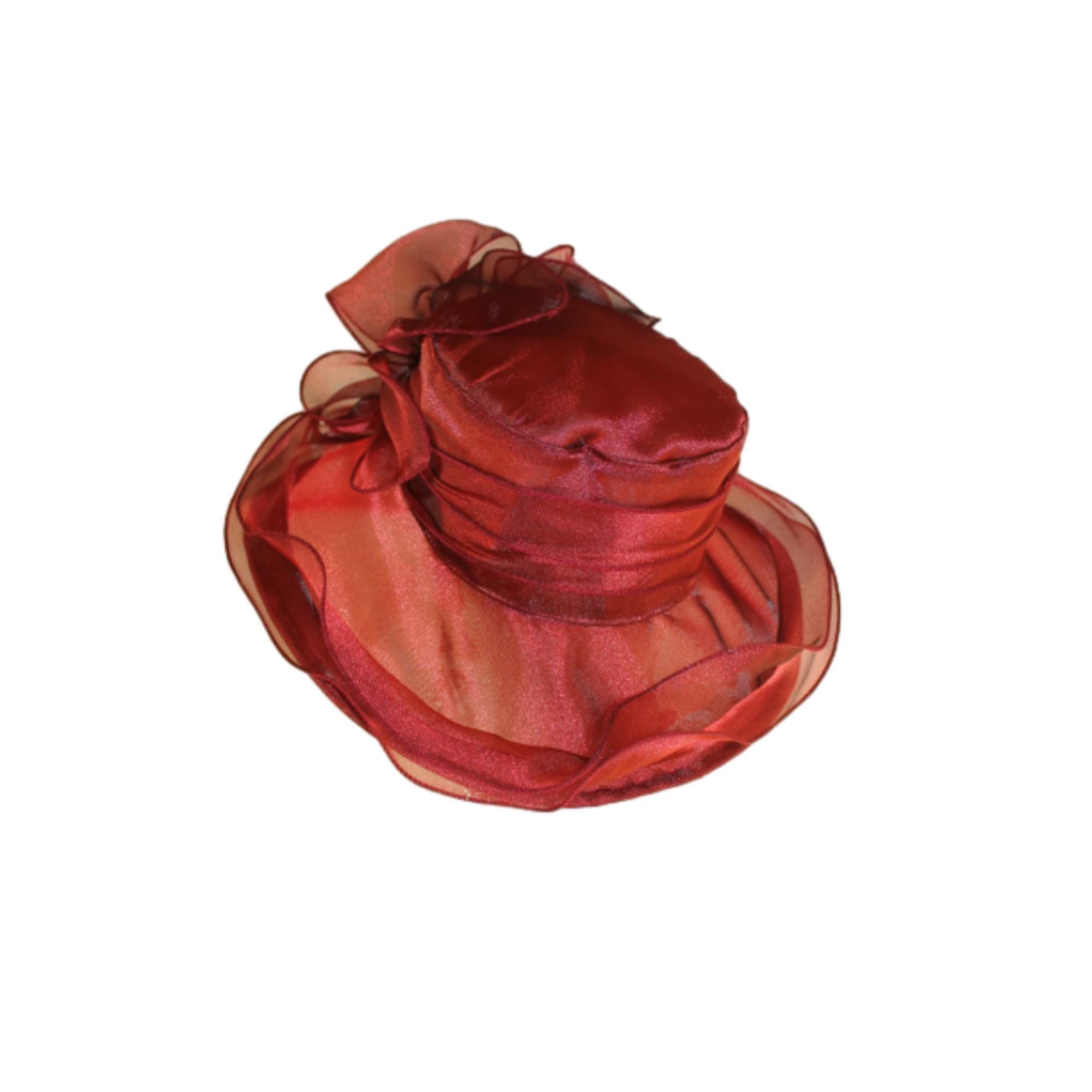 Ladies Red Burgandy Wine Sheer Soft Big Classic Designed Ruffle Brim Designer Dress Hat. This Old Hollywood Vintage Inspired Fashion Hat Is Embellished With A Large Organza Fabric Decorative Bow, Enhanced With Large Organza Handmade Millinery Flower Petals. Delicate Pink Coque Feathers Are Placed Within The Beautiful Bow For A Feminine Romantic Look. A Sheer Organza Band Is Placed Around The Crown For A Simple Elegant Appearance.