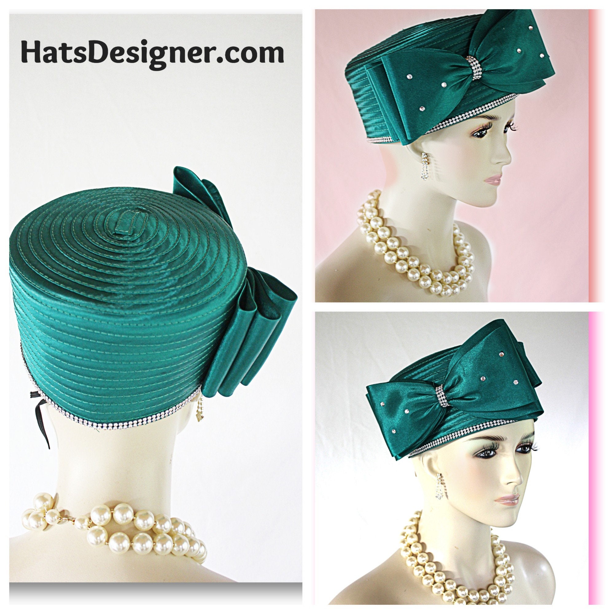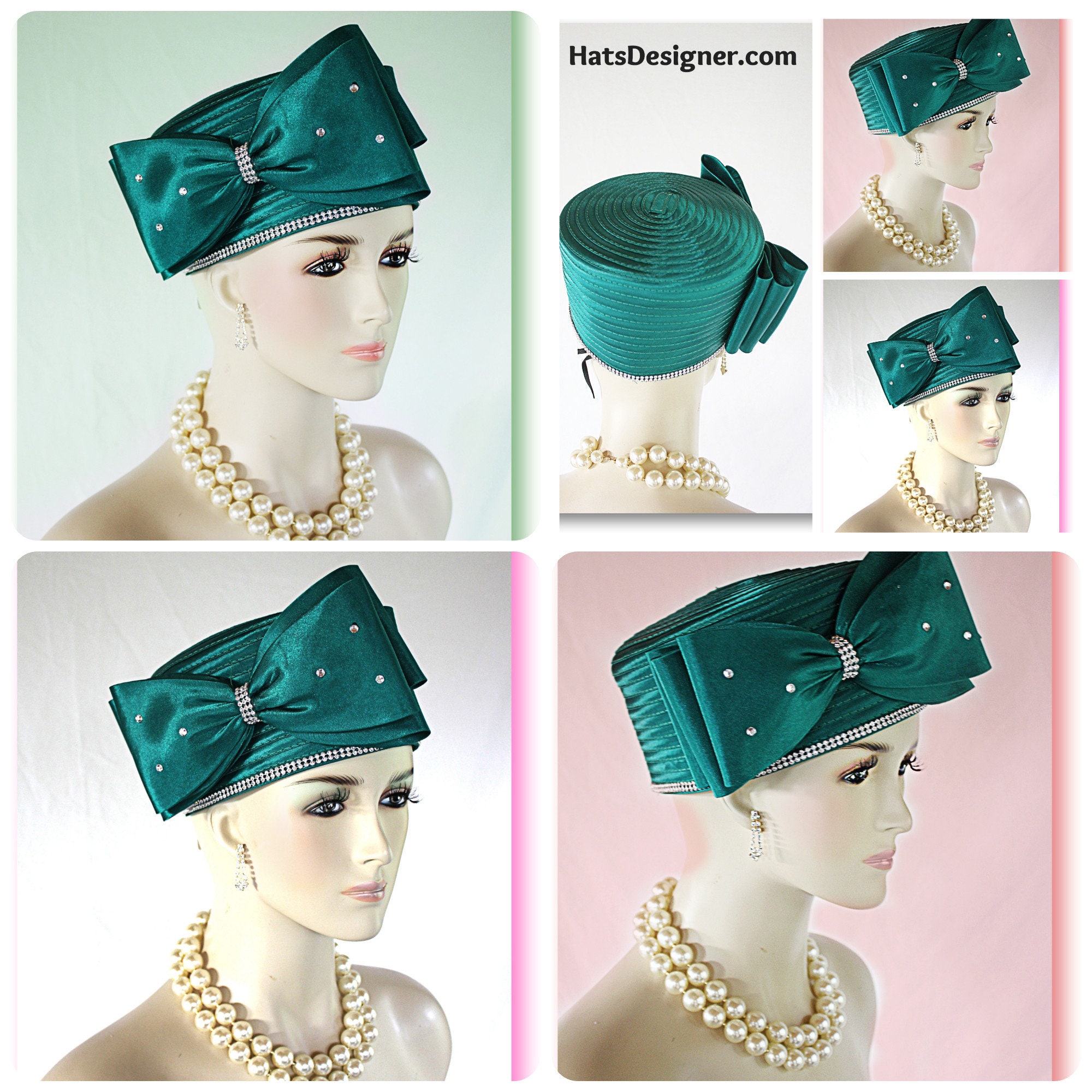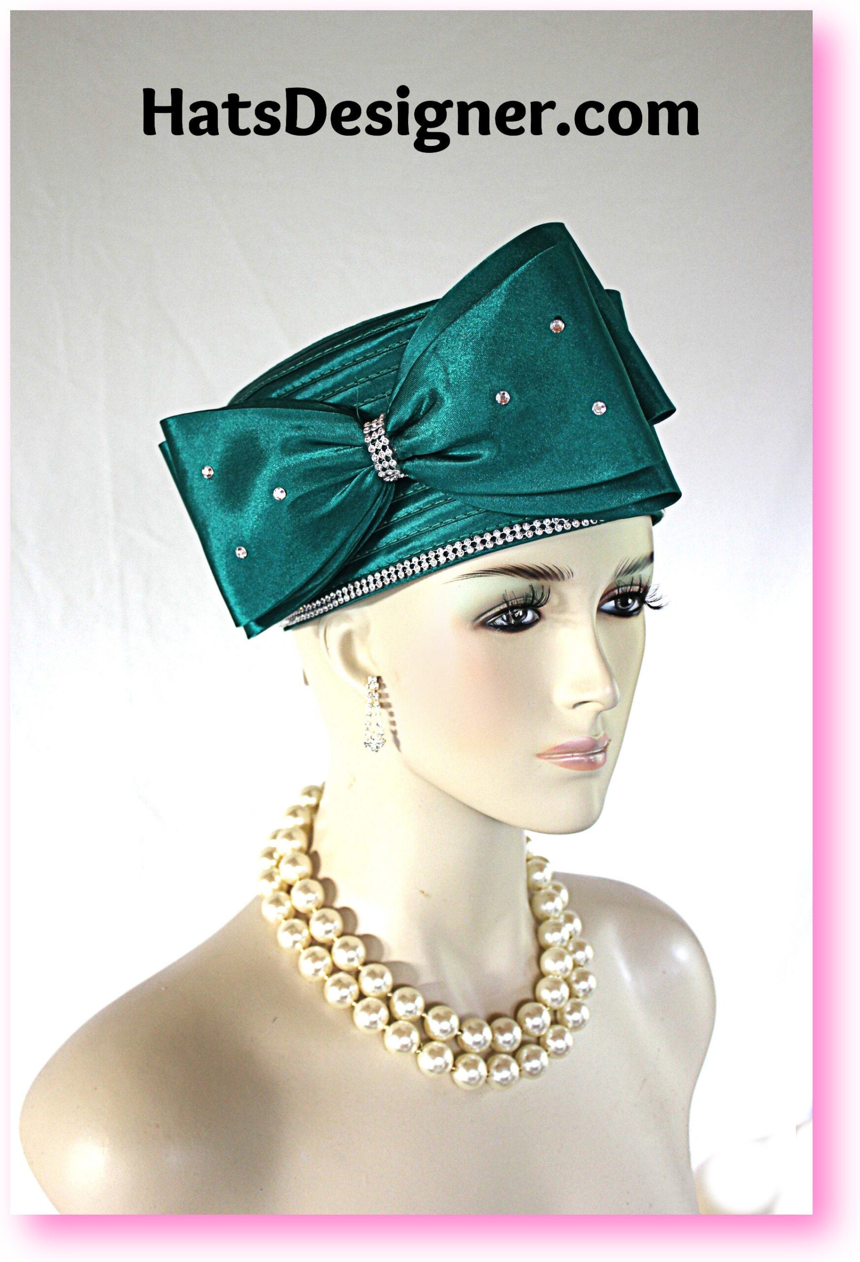 Large Satin Bow,NYFashionHats Couture Hats For Women,Womens Custom Hats,Mother Of The Bride Pillbox Wedding Hat,CoutureDesignerHats Headwear Apparel,Green Satin Pillbox Wedding Hat,Rhinestones On Bow And Hat,Hat Adjustor Inside Of Hat,Simple Classic Design Satin Braid Hat