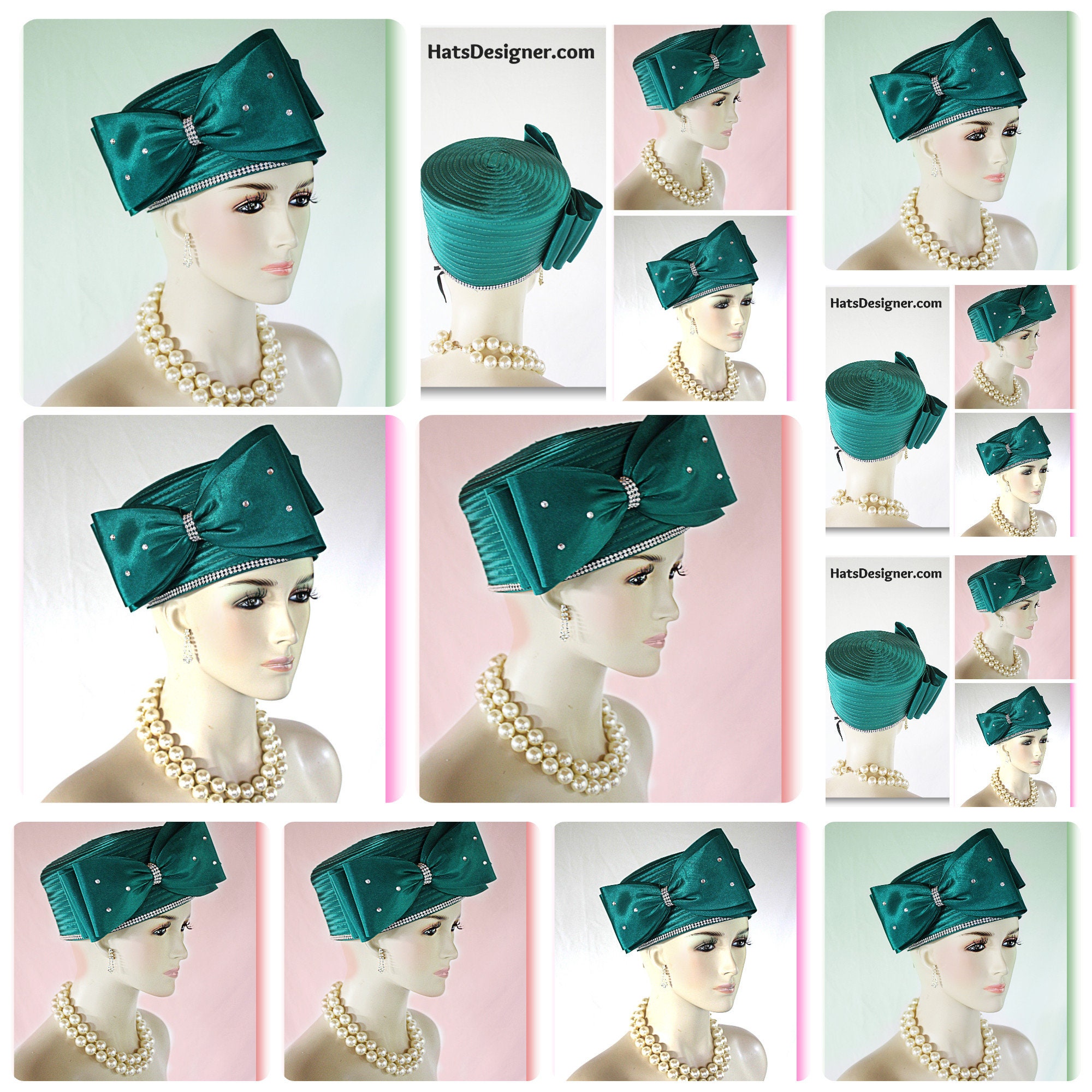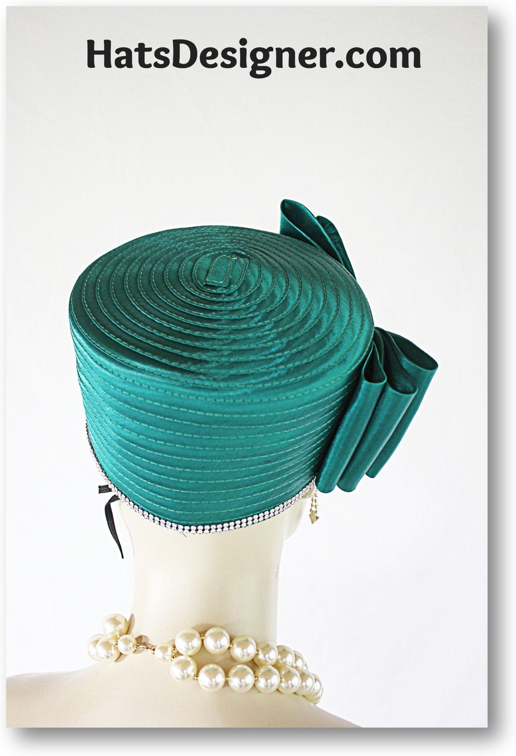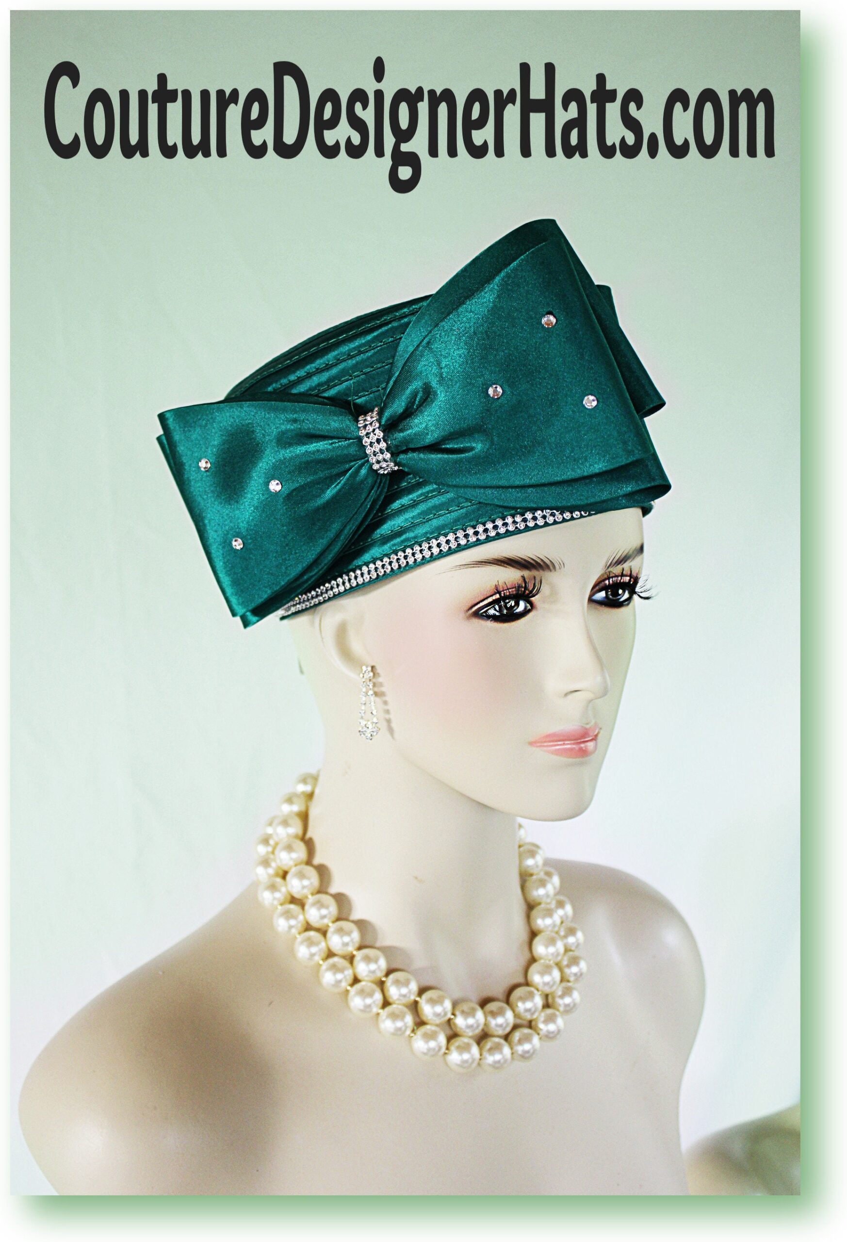 Large Satin Bow,NYFashionHats Couture Hats For Women,Womens Custom Hats,Mother Of The Bride Pillbox Wedding Hat,CoutureDesignerHats Headwear Apparel,Green Satin Pillbox Wedding Hat,Rhinestones On Bow And Hat,Hat Adjustor Inside Of Hat,Simple Classic Design Satin Braid Hat