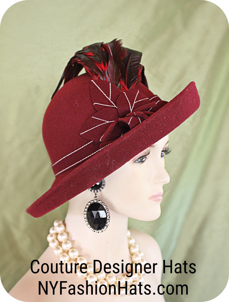 Custom Made Headwear Millinery,Burgundy Wool Designer Hat,Iridescent Rooster Coque Feathers,Wool Stitched Detailed Flower,Detailed Stitched Hat Band