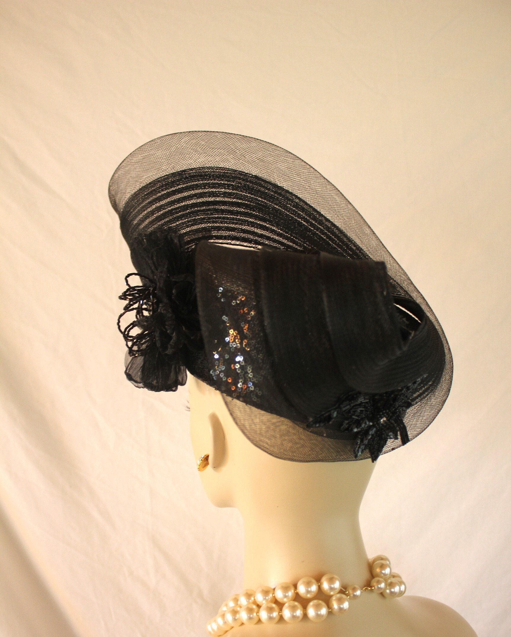 NYFashionHats Headwear Apparel,CoutureDesignerHats Millinery For Women,Black Classic Shaped Pillbox Hat Base,Poly Straw Braid Hat,Black Decorative Sequin Trim,Custom Headdress Apparel For Women,Each Hat Is Custom Made Per Order,Black Shaped Pillbox Wedding Church Hat,Decorative Thick Black Sequin Trim,Horsehair Straw Braid Sculptured Shaped Bow,Organza Beaded Rhinestone Millinery Flower,Black Sequin Glass Beaded Flower