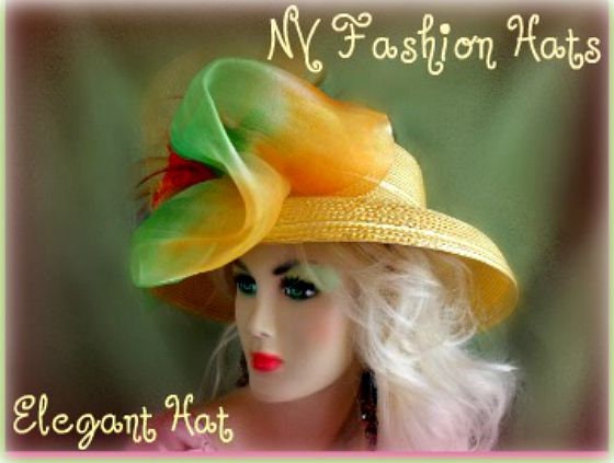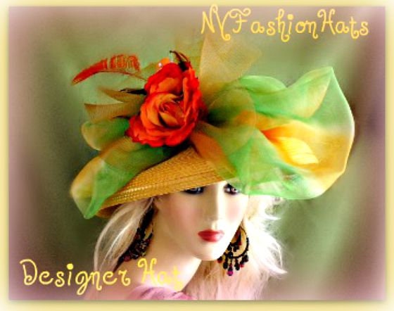 Ladies Women’s Gold Wide Brim Fashion Designer Kentucky Derby Hat, With A Large Gold And Lime Green Sheer Bow, Orange Flowers, And An Orange Peacock Feathers. The Brim Of This Elegant Church Hats, Tilts Down. A Perfect Hat, For Special Occasion, Parties, Tea’s, The Belmont Stakes, And Formals. We Specialize In Kentucky Derby Hats For Women, Dress Hats For Women Ladies Fashion Hats, Designer Hats For Weddings, Church Hats, Tea Party Hats, Ladies Formal Hats, Kentucky Oaks Hats, Preakness Hats, Belmont Stakes Hats, And Special Occasion Hats For Women. Custom Made And Designed By NY Fashion Hats Millinery Headwear. http://www.nyfashionhats.com