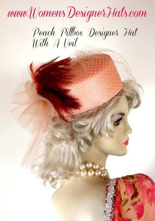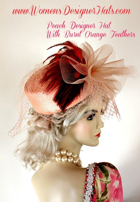 Ladies Peach Custom Made Pillbox Cocktail Wedding Hat With A Birdcage Netting Veil. This formal designer hat is embellished with a peach horsehair crinoline bow accented with burnt orange hackle rooster feathers. A peach birdcage netting face veil gives this elegant hat such style. This fashion hat can be worn with the bow toward the front of the face or toward the back of the head. This dress hat is suited for Winter, Spring, Summer And Fall.