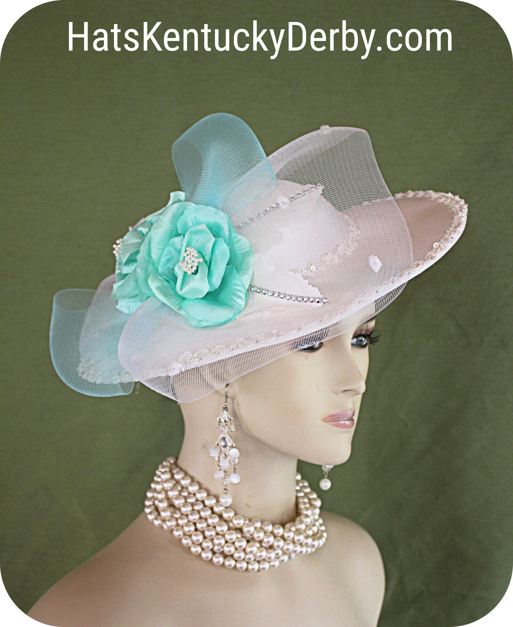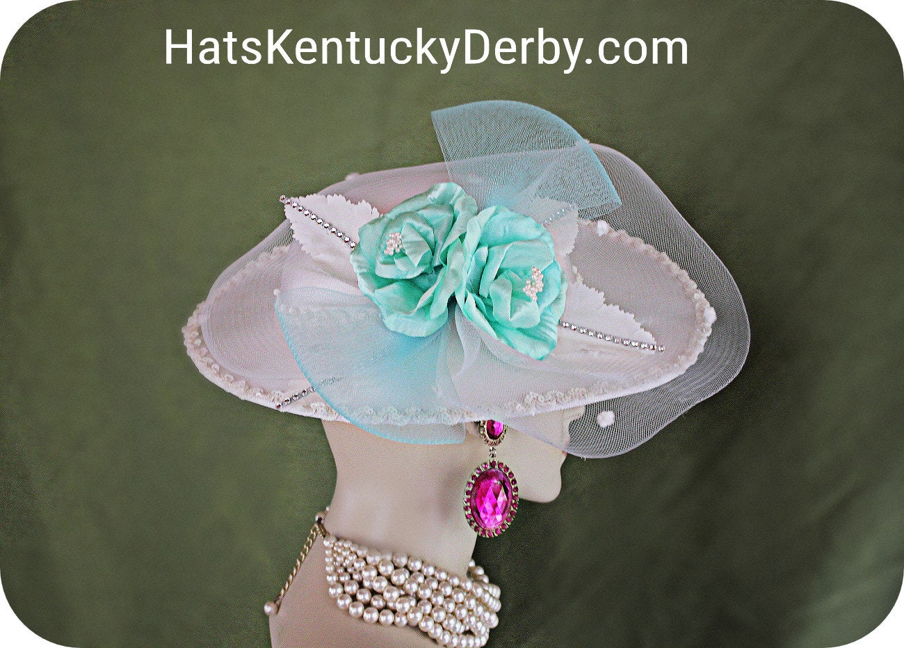 Custom Made Headwear Millinery,Rhinestones,Vintage Pearl Stamens,White Satin Shallow Crown Hat Or Hatinator,Handmade Hat Pin To Hold The Hat In Place,White Large Horsehair Dotted Bow,White Pearl Stamens,Vintage Mint Green Silk Roses,Vintage Handmade White Leaves Rhinestones,White Wavy Sequin Trim,Soft Aqua Blue Horsehair Bow