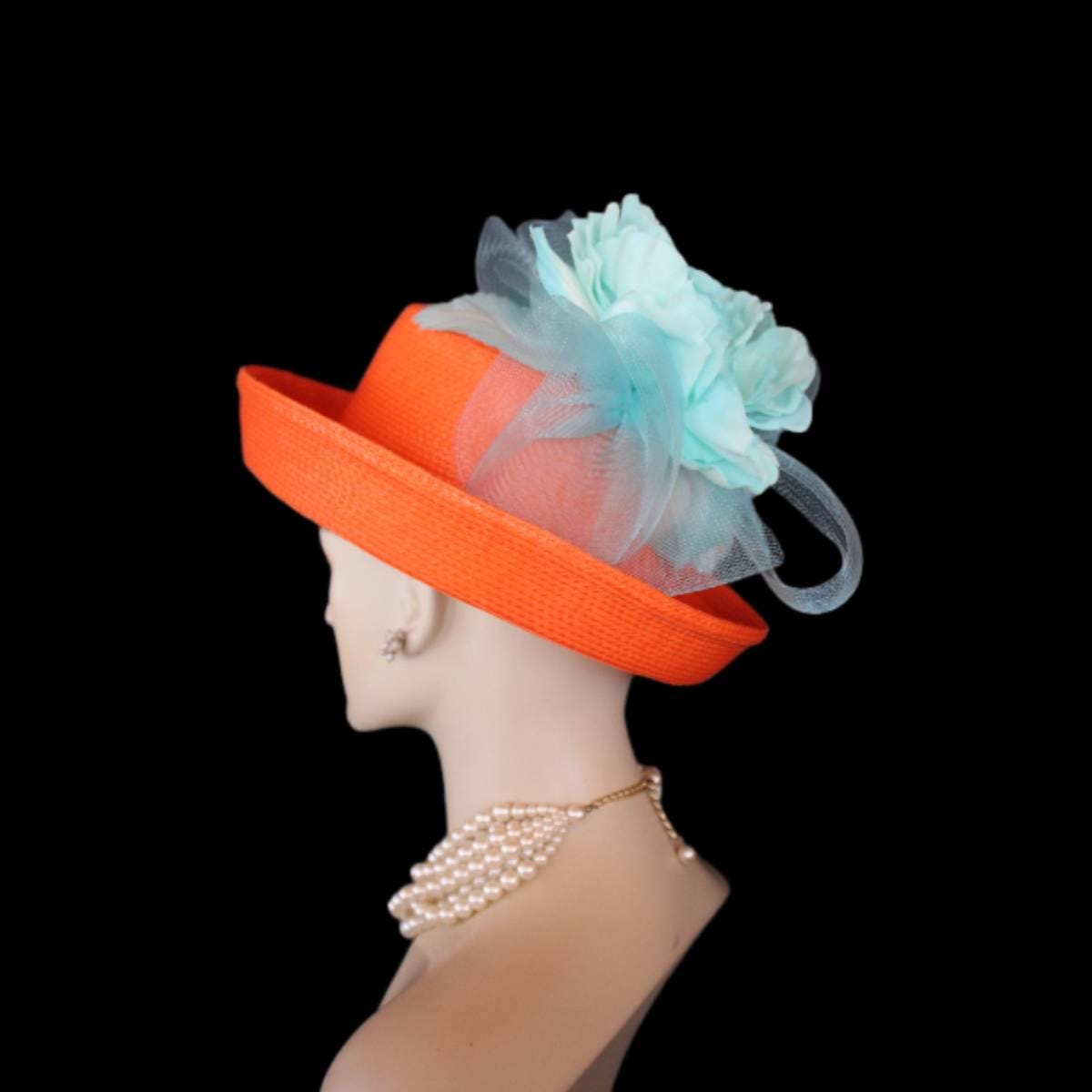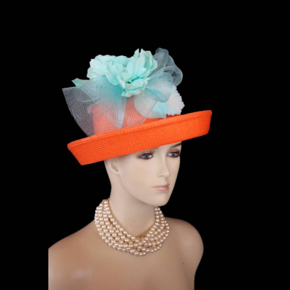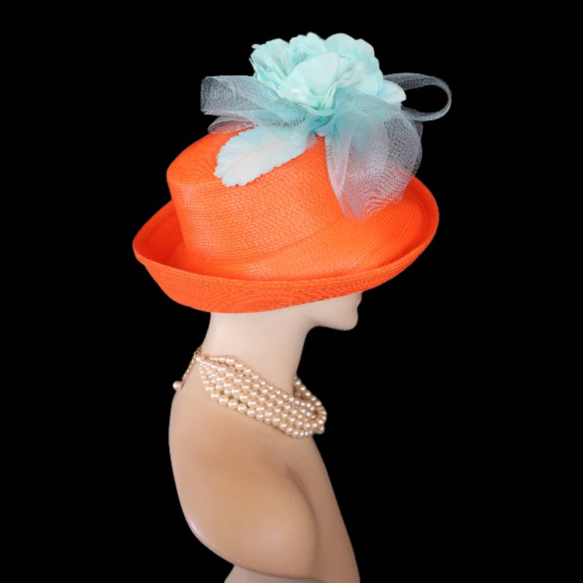 Introducing the epitome of luxury and refinement: the Ladies Orange Turquoise Aqua Formal Wedding Lift Up Brim Hat. This exquisite piece, crafted by the esteemed artisans at NYFashionHats.com, transcends mere headwear; it embodies a bold artistic vision that redefines elegance for the modern woman.