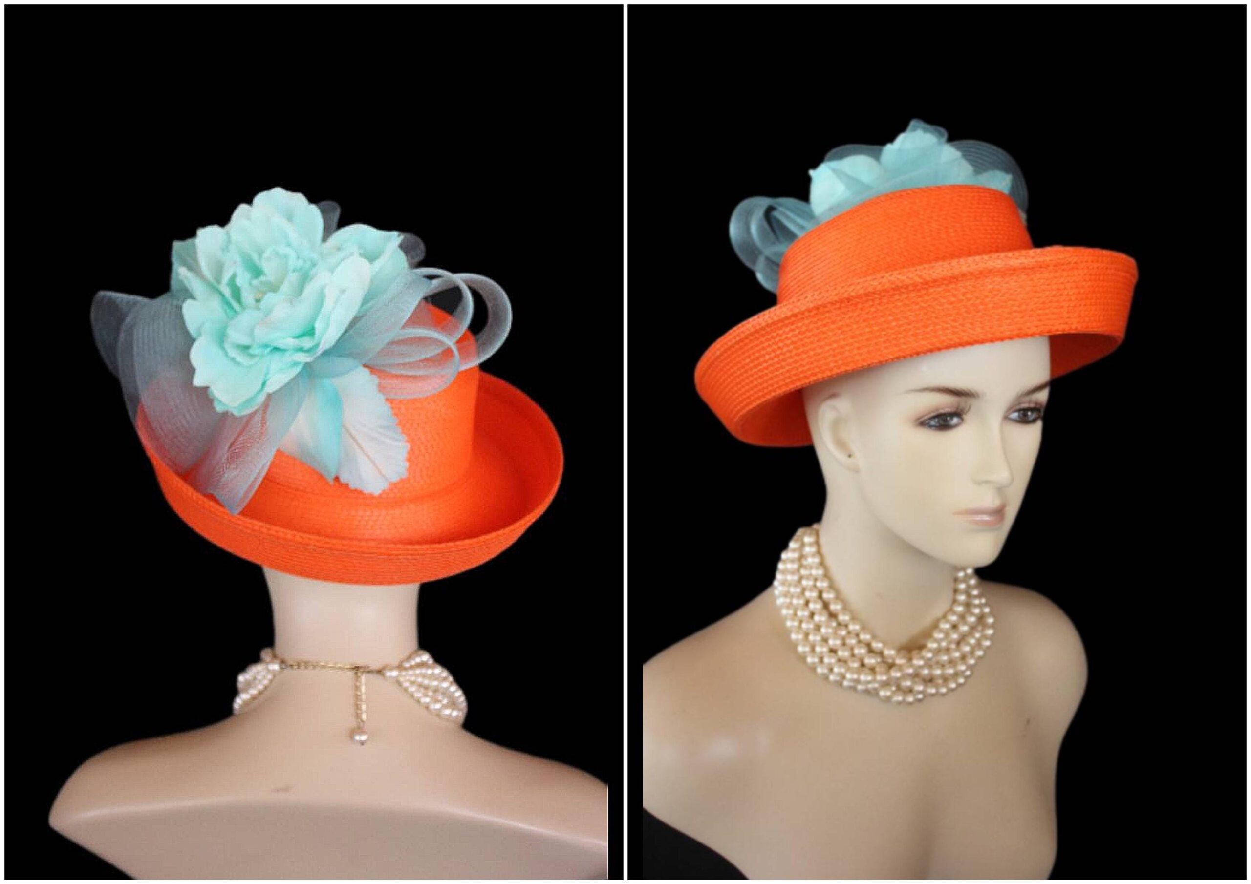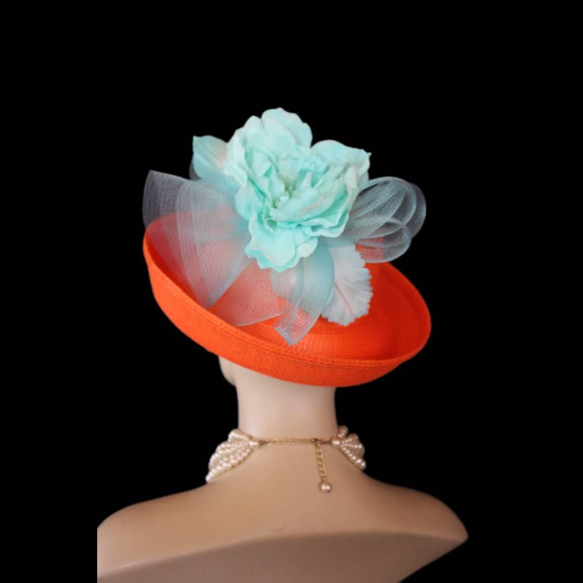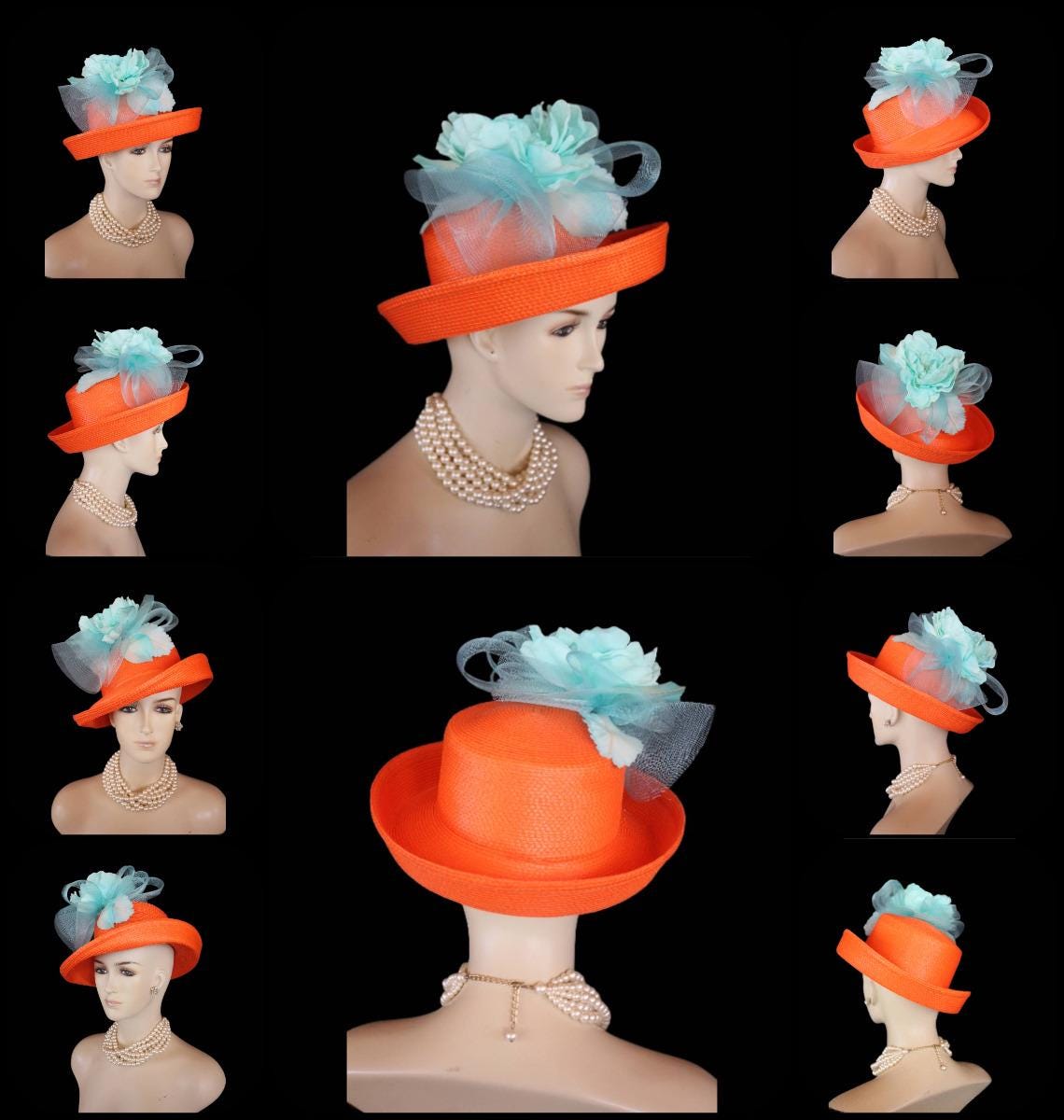 Introducing the epitome of luxury and refinement: the Ladies Orange Turquoise Aqua Formal Wedding Lift Up Brim Hat. This exquisite piece, crafted by the esteemed artisans at NYFashionHats.com, transcends mere headwear; it embodies a bold artistic vision that redefines elegance for the modern woman.
