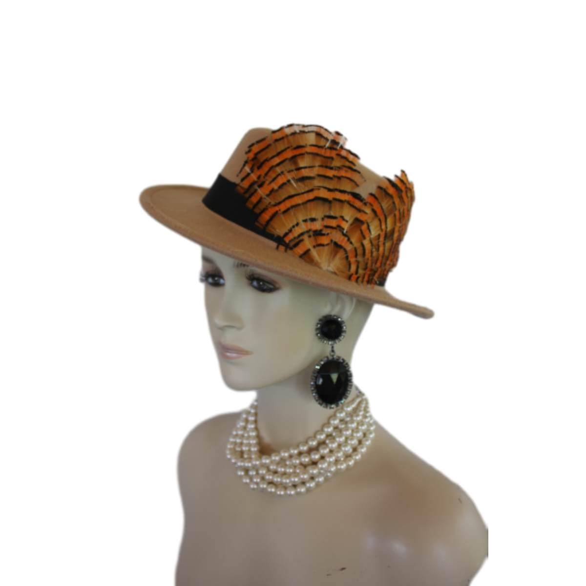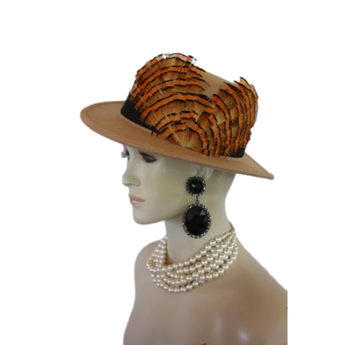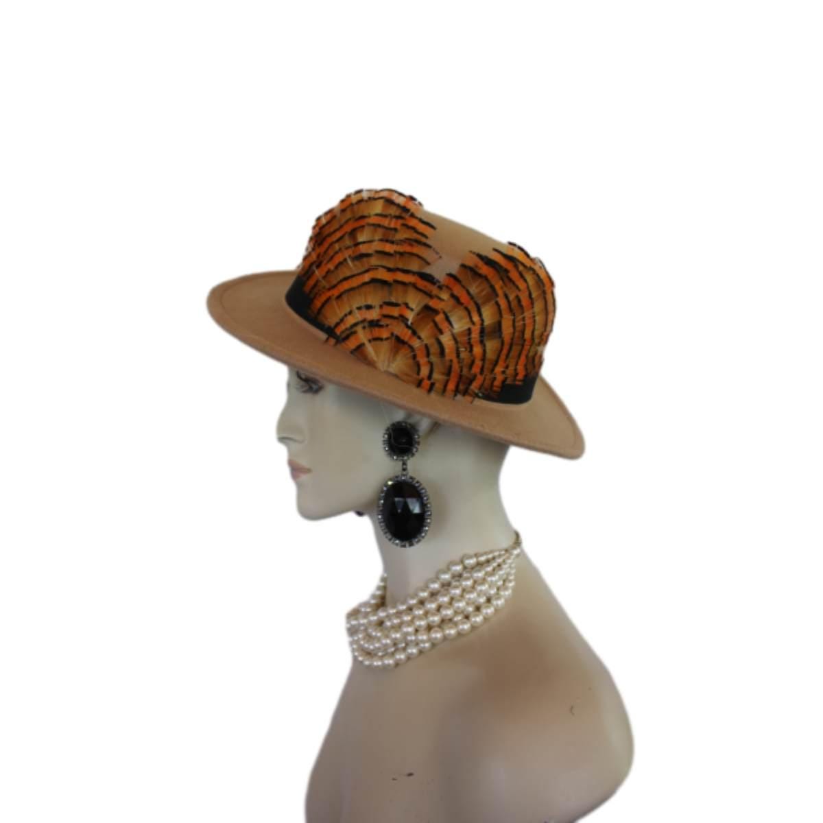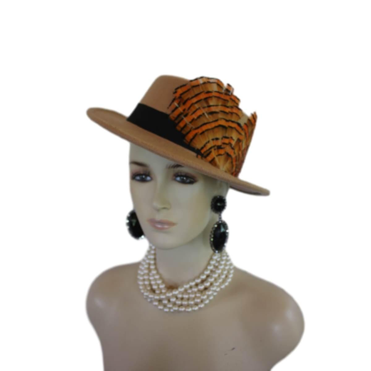 “””Step into the realm of haute couture with the Ladies Camel Beige Gondola Bolero Gaucho Designer Hat—a true masterpiece that embodies the elegance and sophistication of high fashion. This striking boater-style hat, meticulously crafted by the renowned artisans at NYFashionHats.com, showcases an exquisite blend of sumptuous multi-colored orange, beige, and black duck feathers. Its daring design redefines what it means to make a fashion statement, ensuring that all eyes are on you at every occasion.