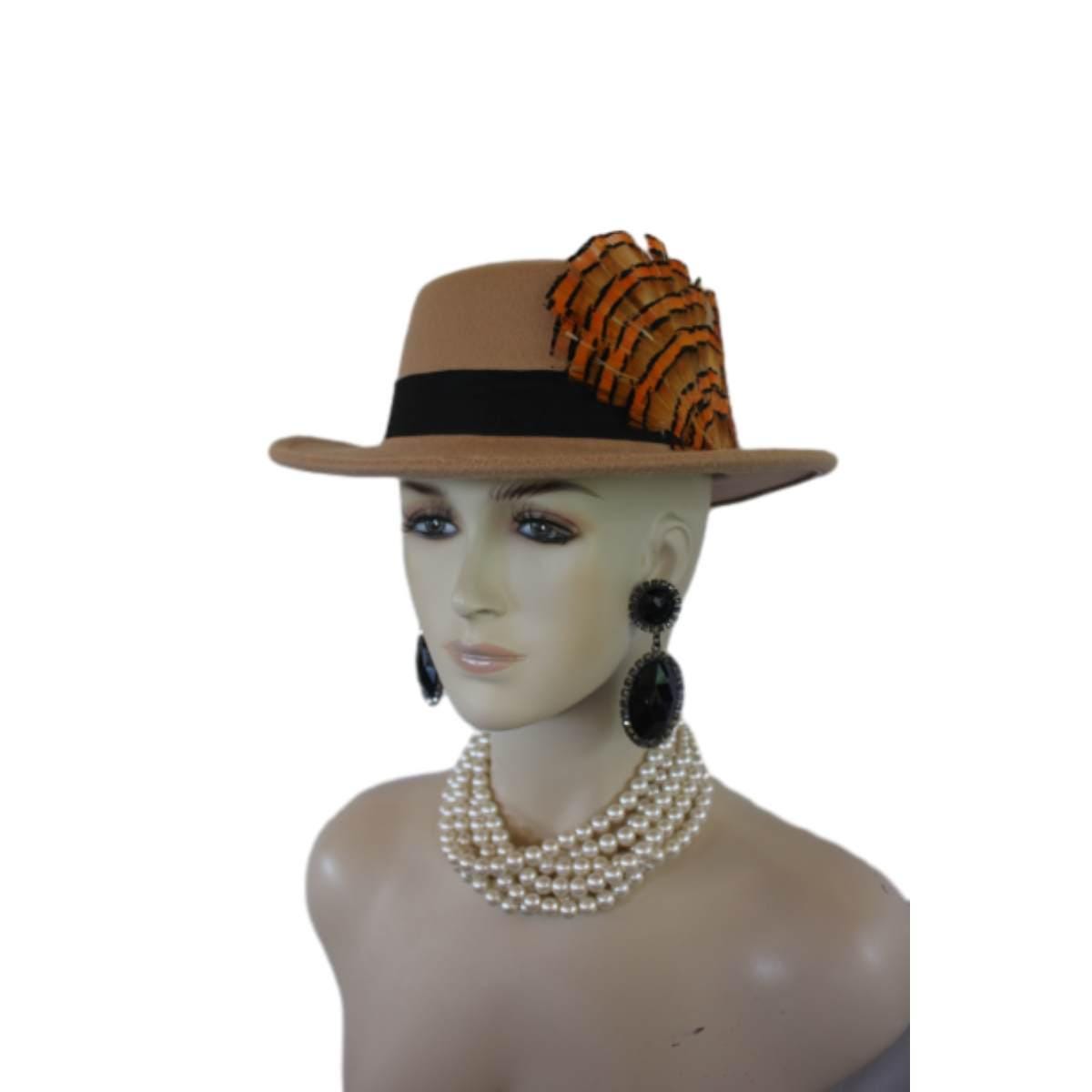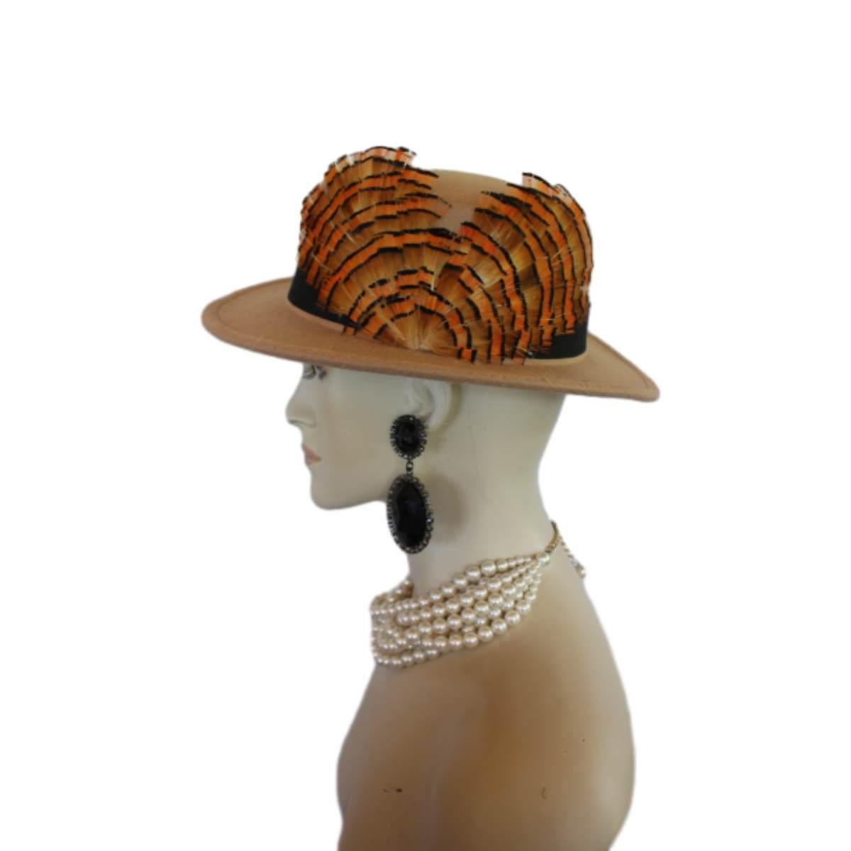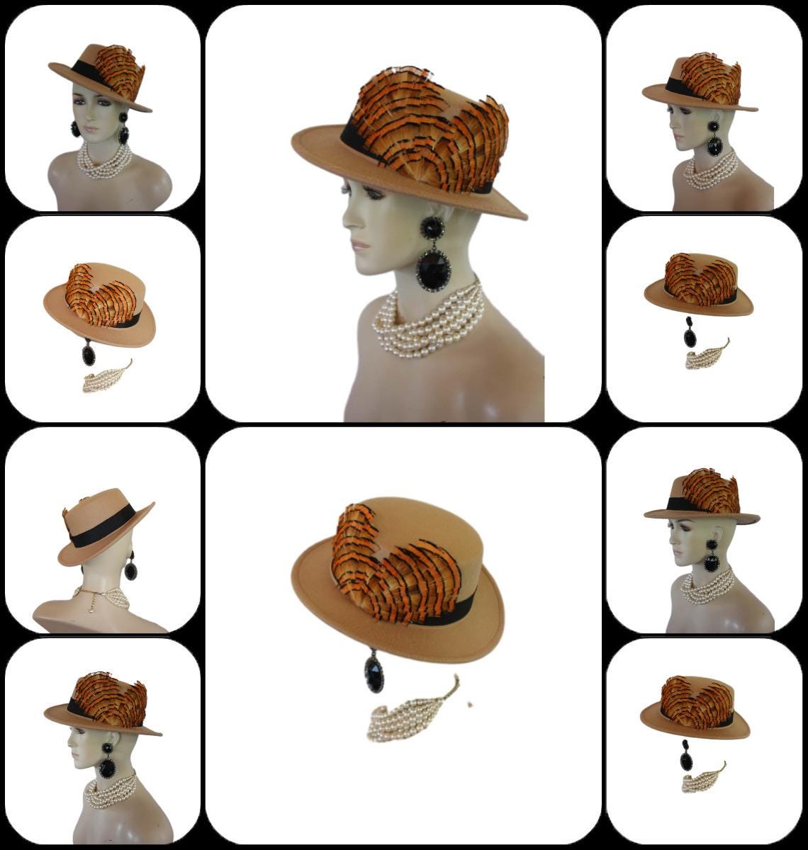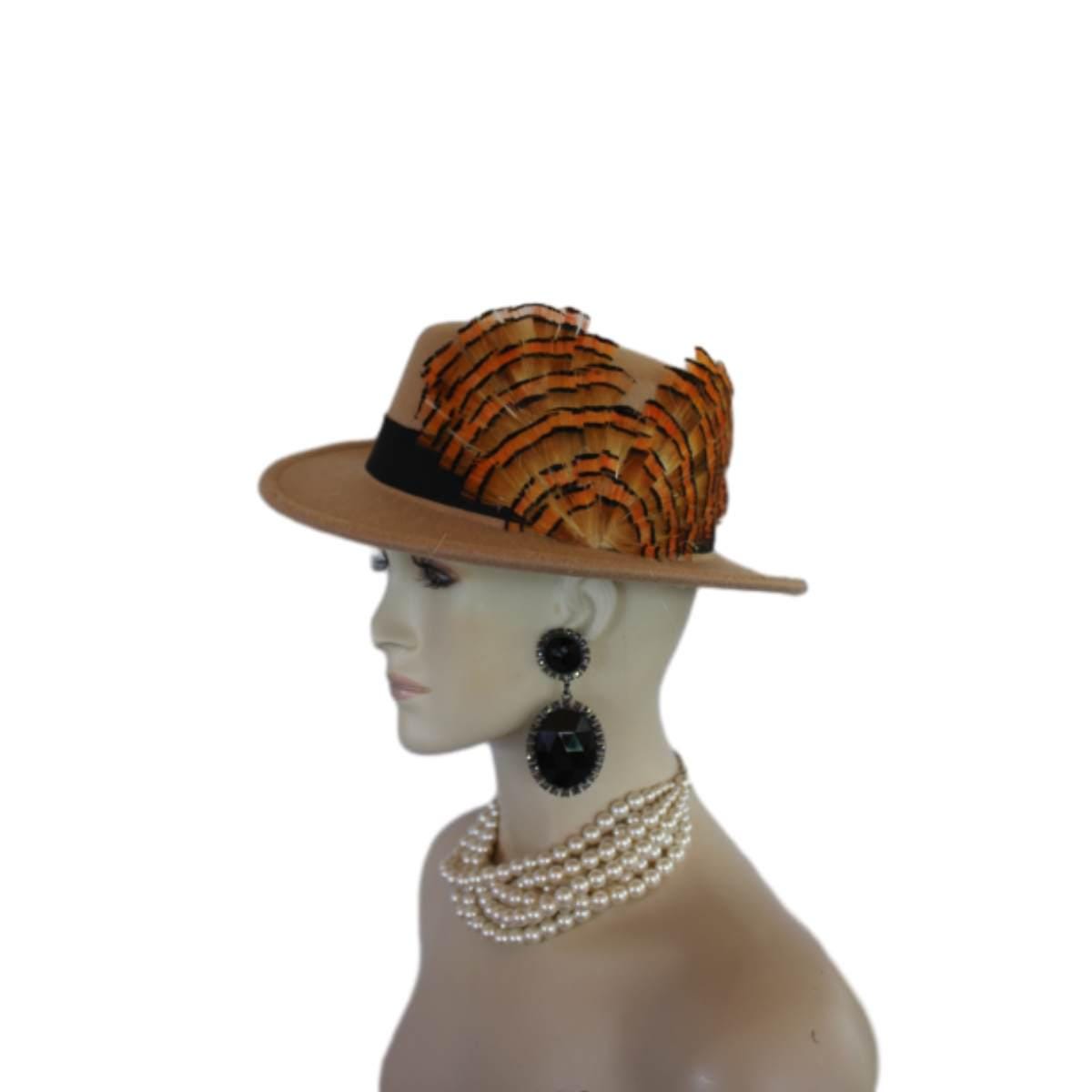 “””Step into the realm of haute couture with the Ladies Camel Beige Gondola Bolero Gaucho Designer Hat—a true masterpiece that embodies the elegance and sophistication of high fashion. This striking boater-style hat, meticulously crafted by the renowned artisans at NYFashionHats.com, showcases an exquisite blend of sumptuous multi-colored orange, beige, and black duck feathers. Its daring design redefines what it means to make a fashion statement, ensuring that all eyes are on you at every occasion.