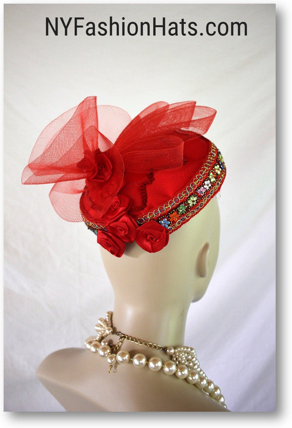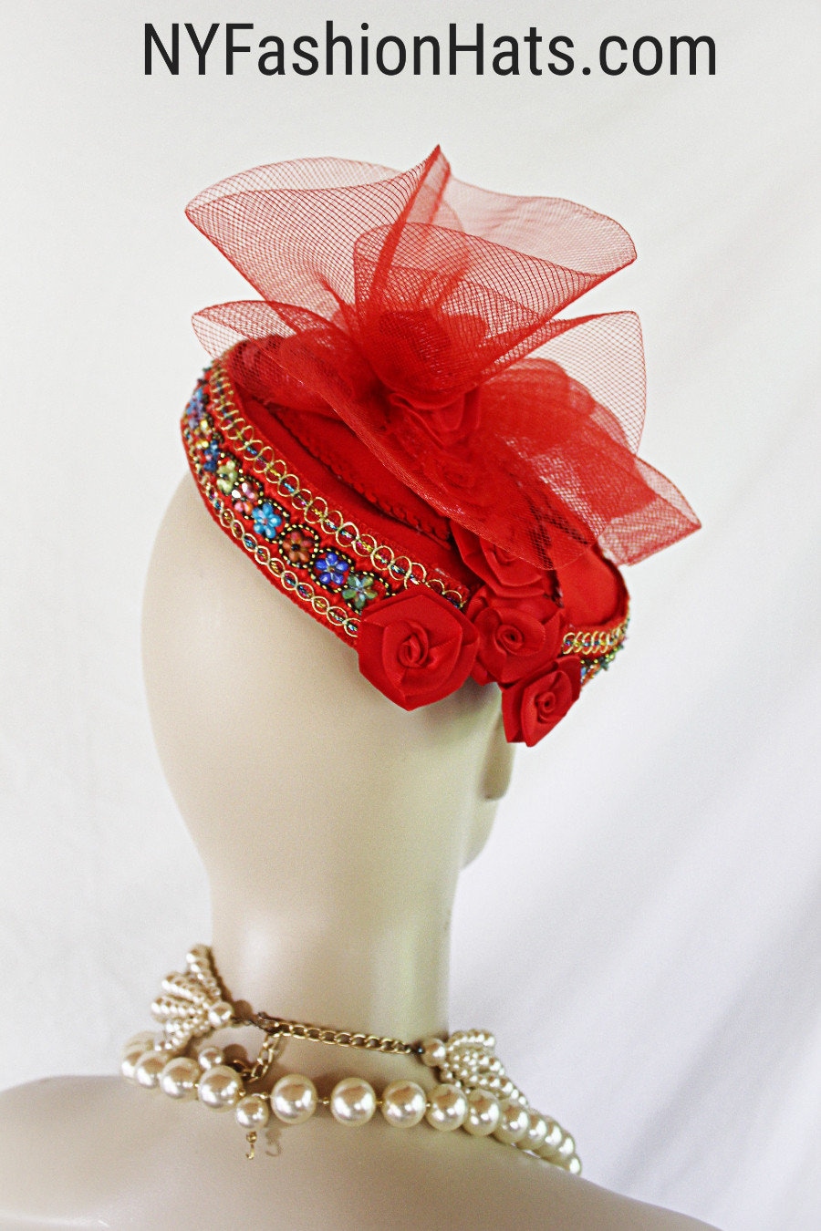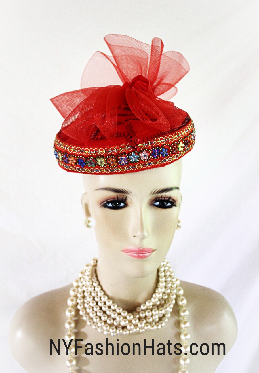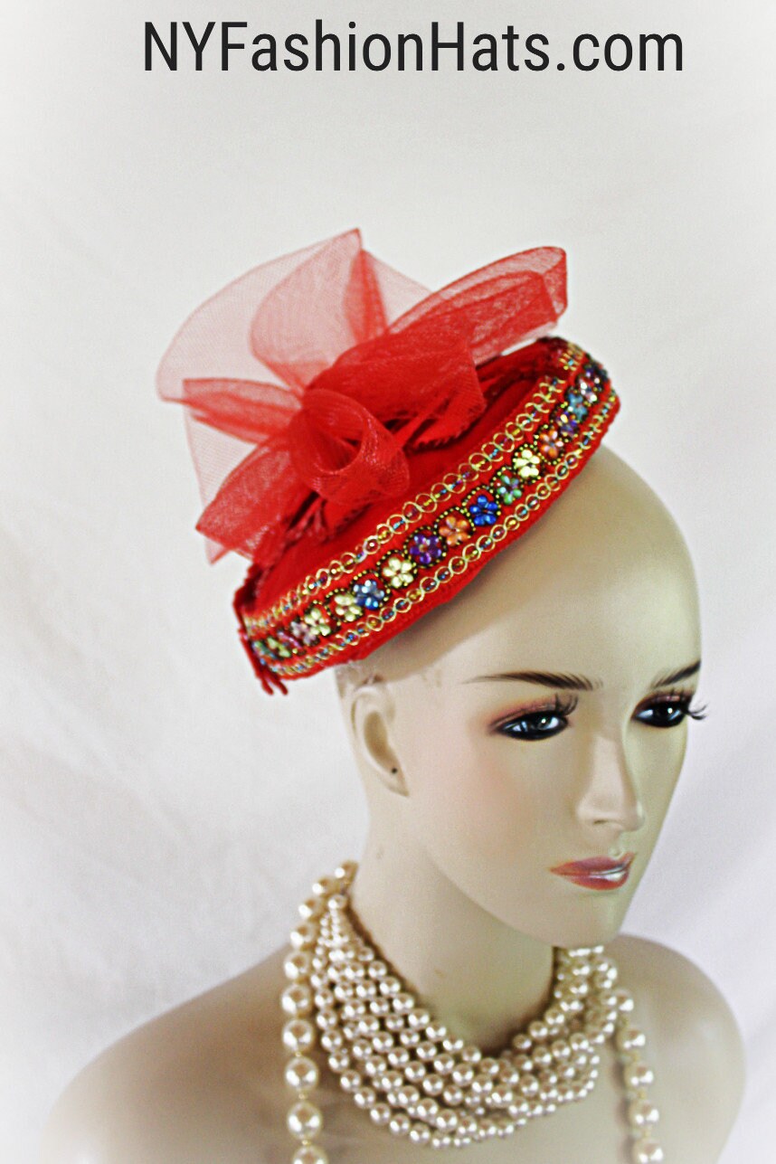 Women’s Red Designer Satin Handmade Vintage Style Pillbox Bridal Wedding Hat. This Formal Fascinator Cocktail Hat Headpiece Is Embellished With A Red Horsehair Bow And Red Satin Rosettes. Flower Petals Are Placed On Top Of The Hat With Red Sequin Edges. A Decorative Hand Beaded Colorful Metallic Thread Trim Encircles The Lower Portion Of This Fancy Holiday Headpiece. This Dressy Hat Can Be Worn Where Desired On Your Head. A Perfect Hat For A Bride Or Mother Of The Bride Or Groom. This Designer Fashion Church Hat Is Custom Made And Designed By NY Fashion Hats Custom Millinery Headwear. http://www.nyfashionhats.com