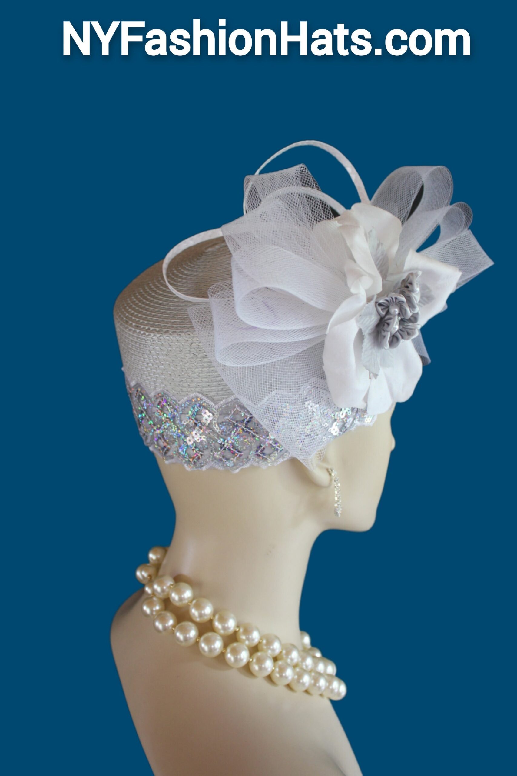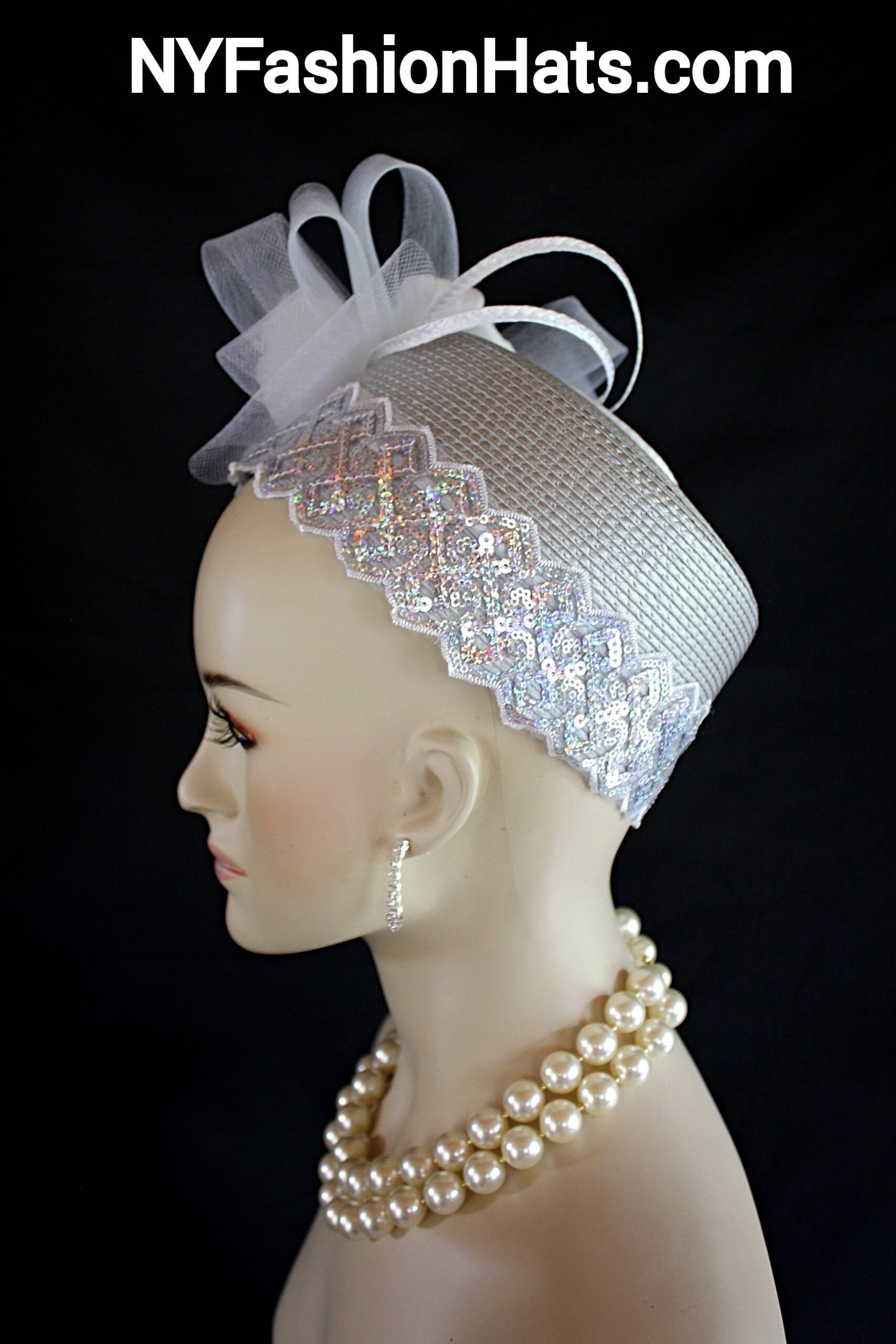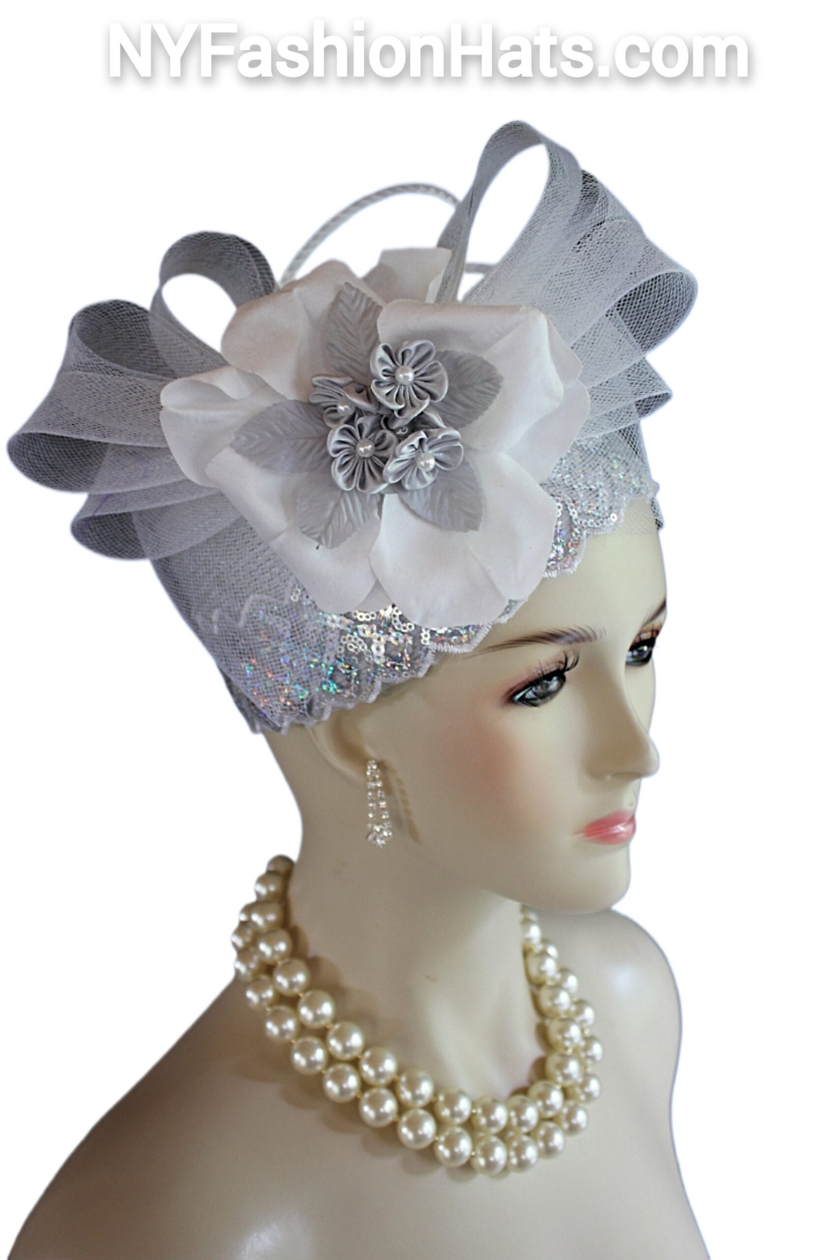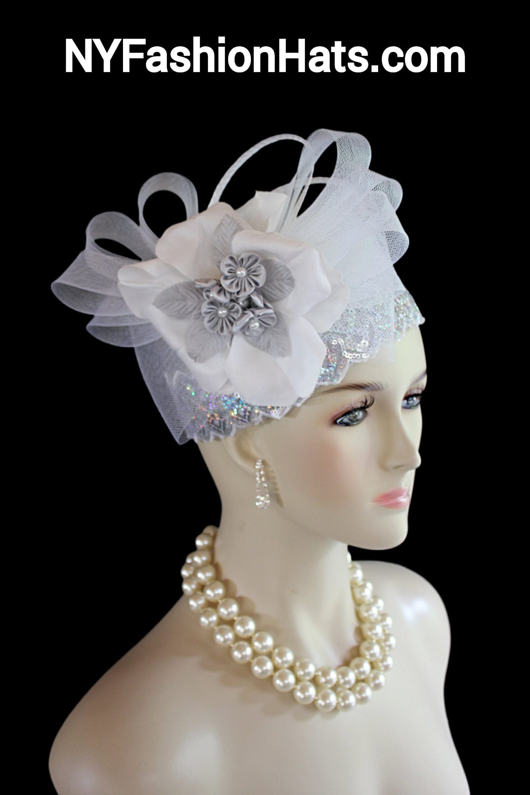 This Formal Wedding Hat Is Embellished With A Large White Decorative Crinoline Horse Hair Bow Enhanced With A Combination Of Gray And White Poly Straw Sculptured Loop Bowing. Placed With This Beautiful Bow Is A Large White Vintage Flower Embedded With Grey Satin Flowers With Silk Leaves And A White Pearl Center. A Beautiful Zig Zag Pearlized Iridescent Sequin Trim Encircles The Lower Crown Of This Beautiful Headpiece Cocktail Hat.