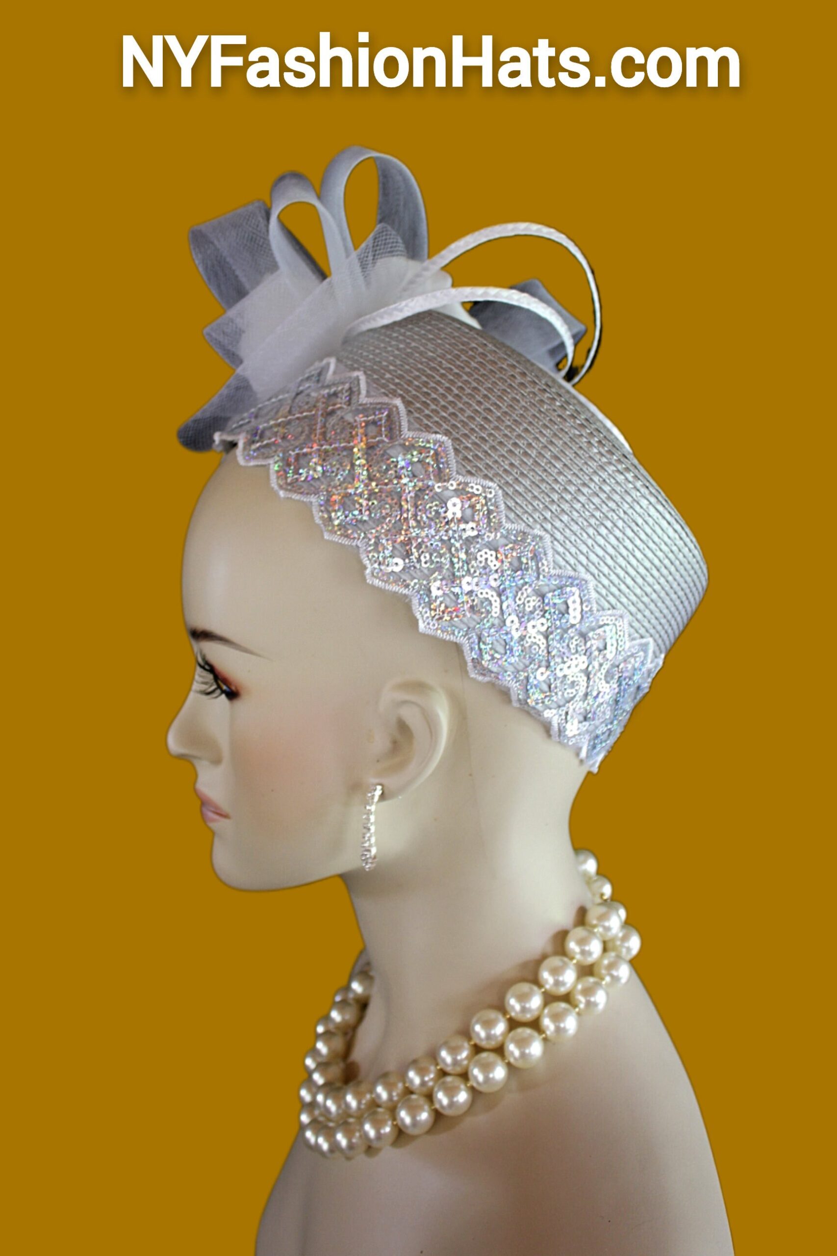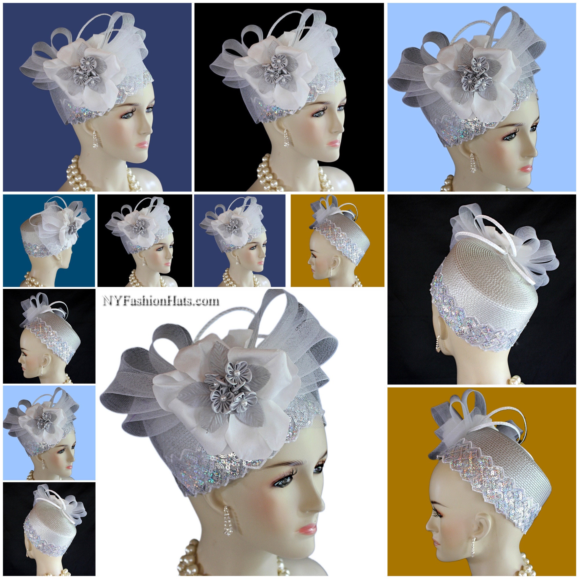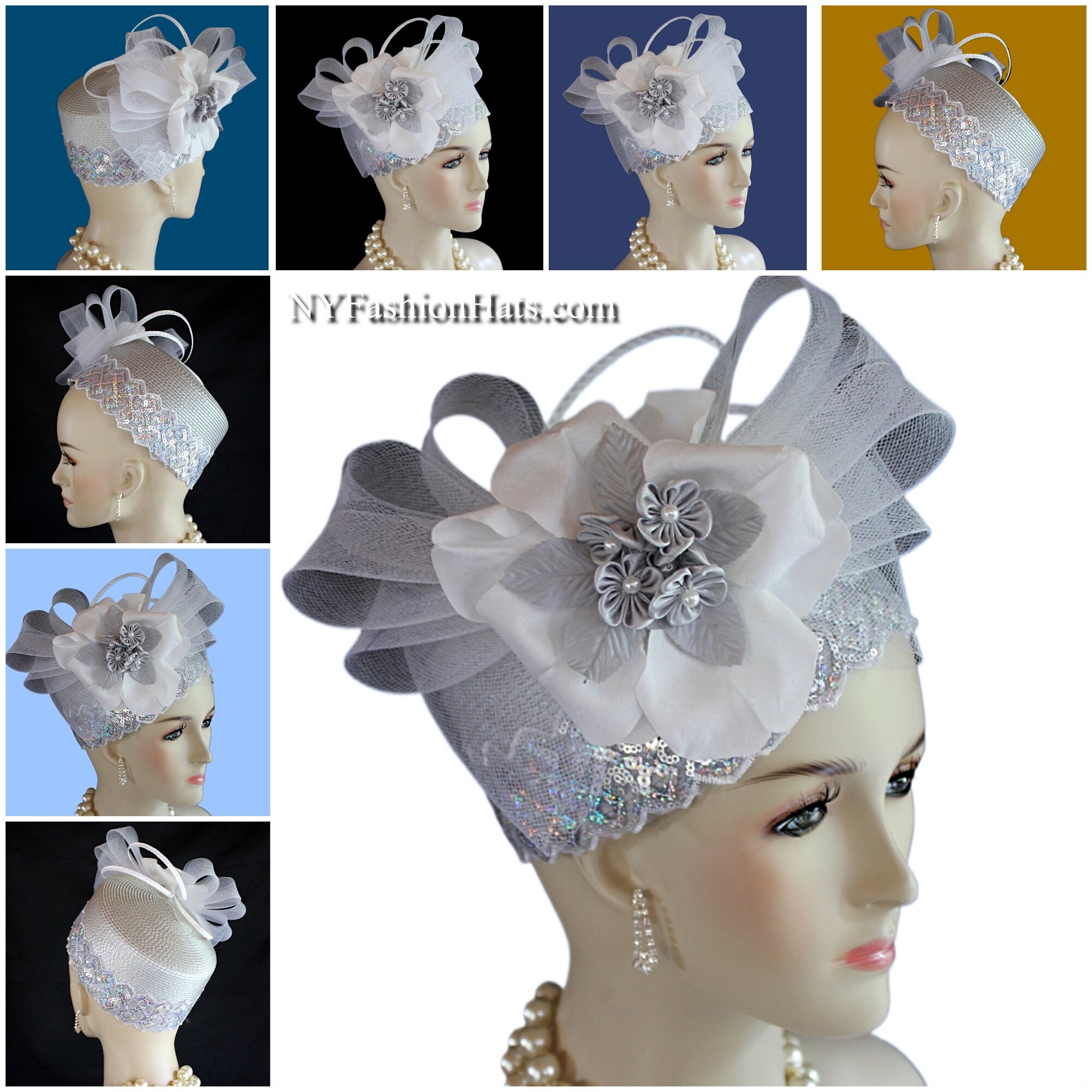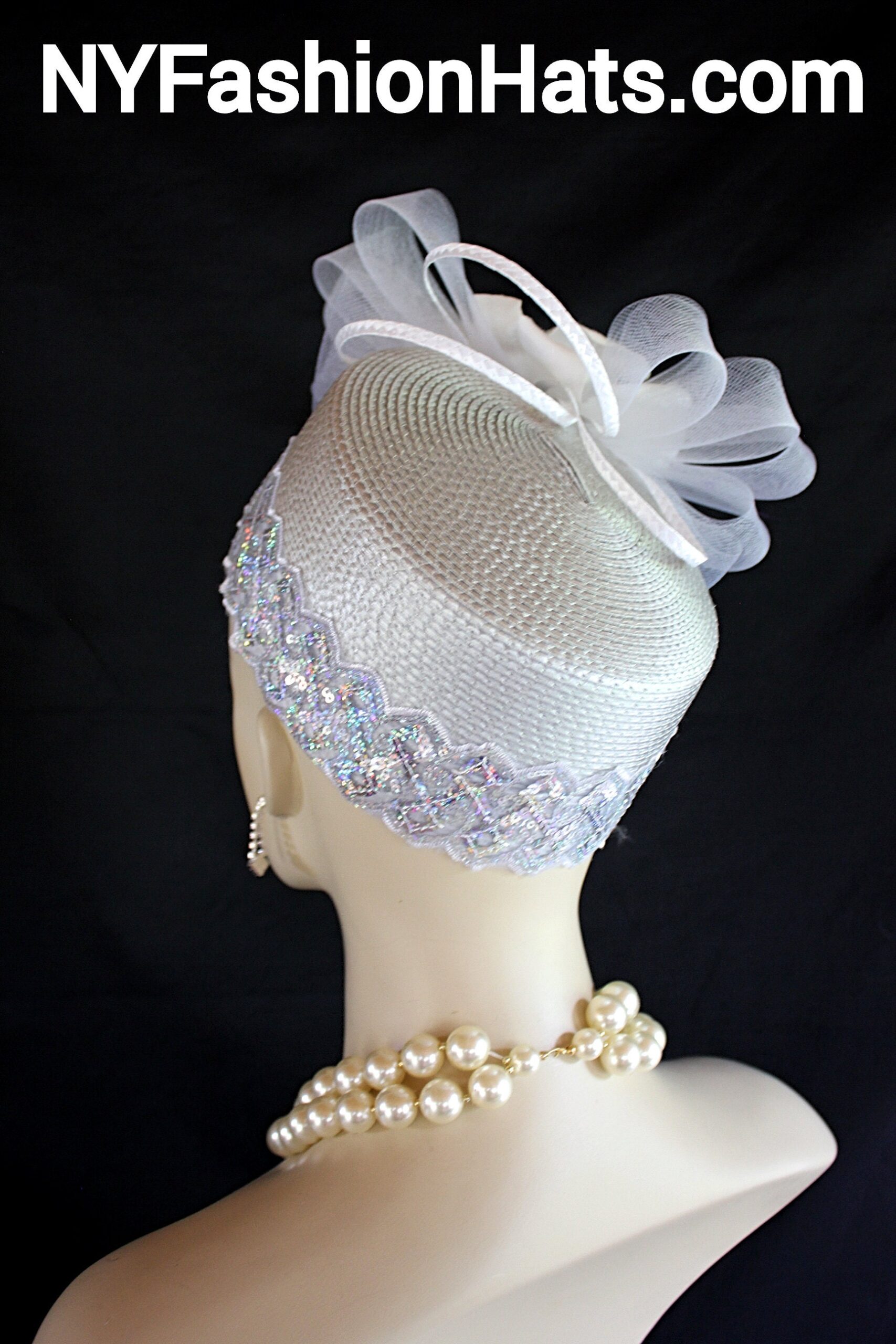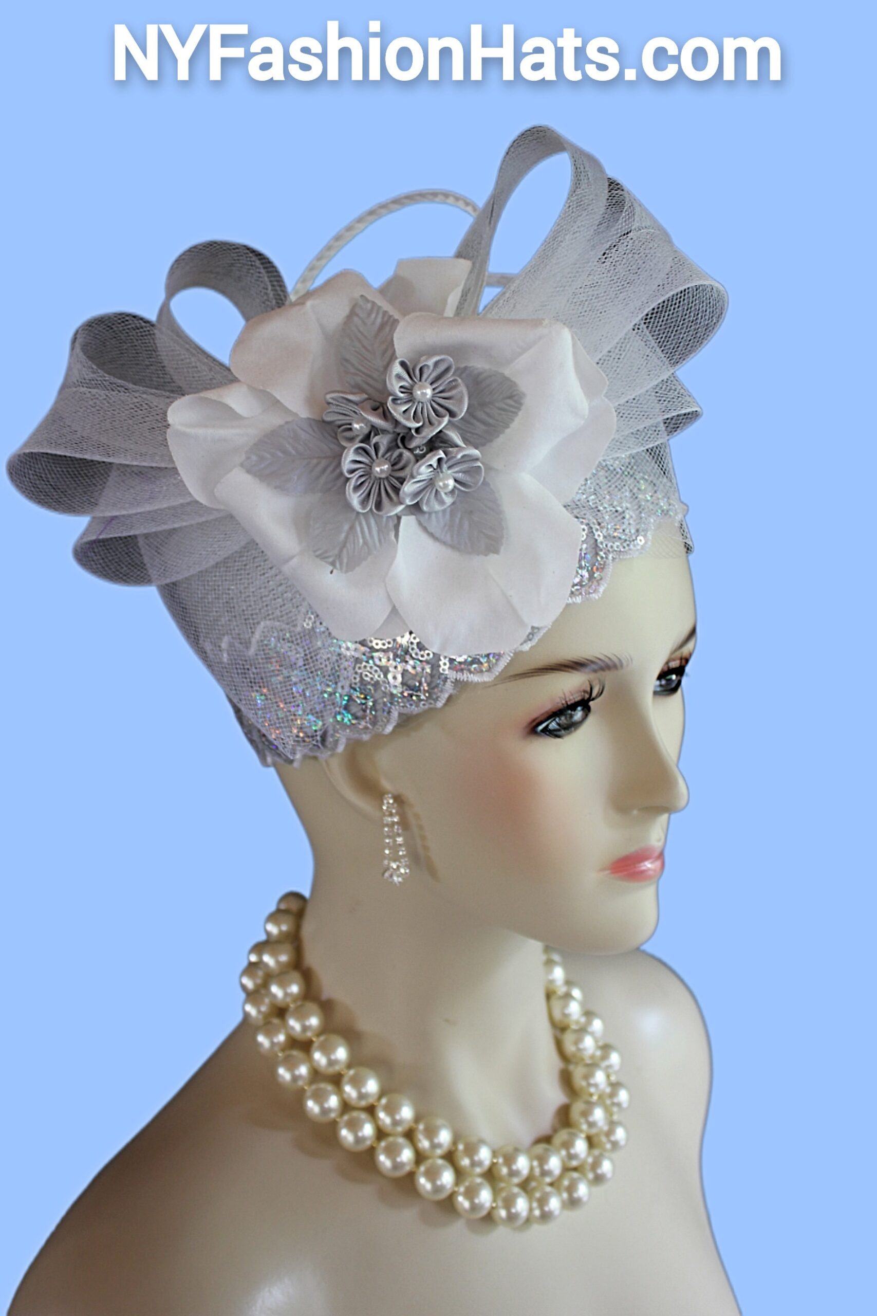 This Formal Wedding Hat Is Embellished With A Large White Decorative Crinoline Horse Hair Bow Enhanced With A Combination Of Gray And White Poly Straw Sculptured Loop Bowing. Placed With This Beautiful Bow Is A Large White Vintage Flower Embedded With Grey Satin Flowers With Silk Leaves And A White Pearl Center. A Beautiful Zig Zag Pearlized Iridescent Sequin Trim Encircles The Lower Crown Of This Beautiful Headpiece Cocktail Hat.