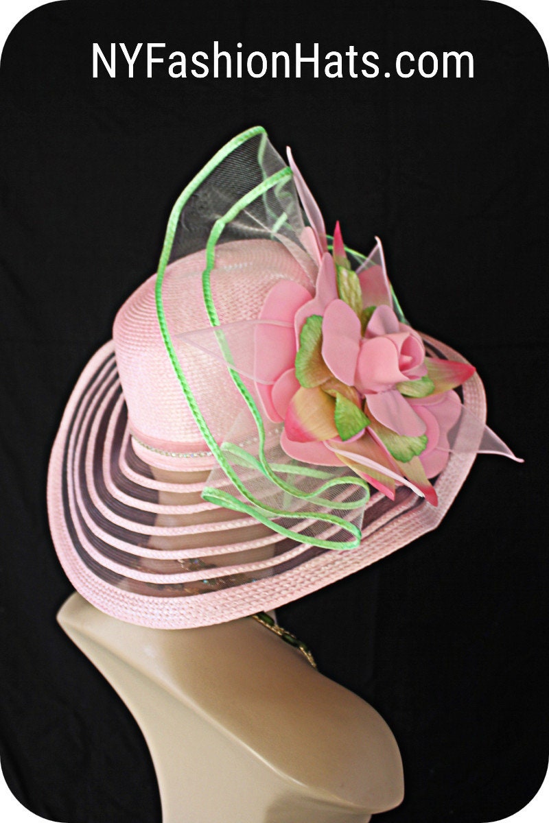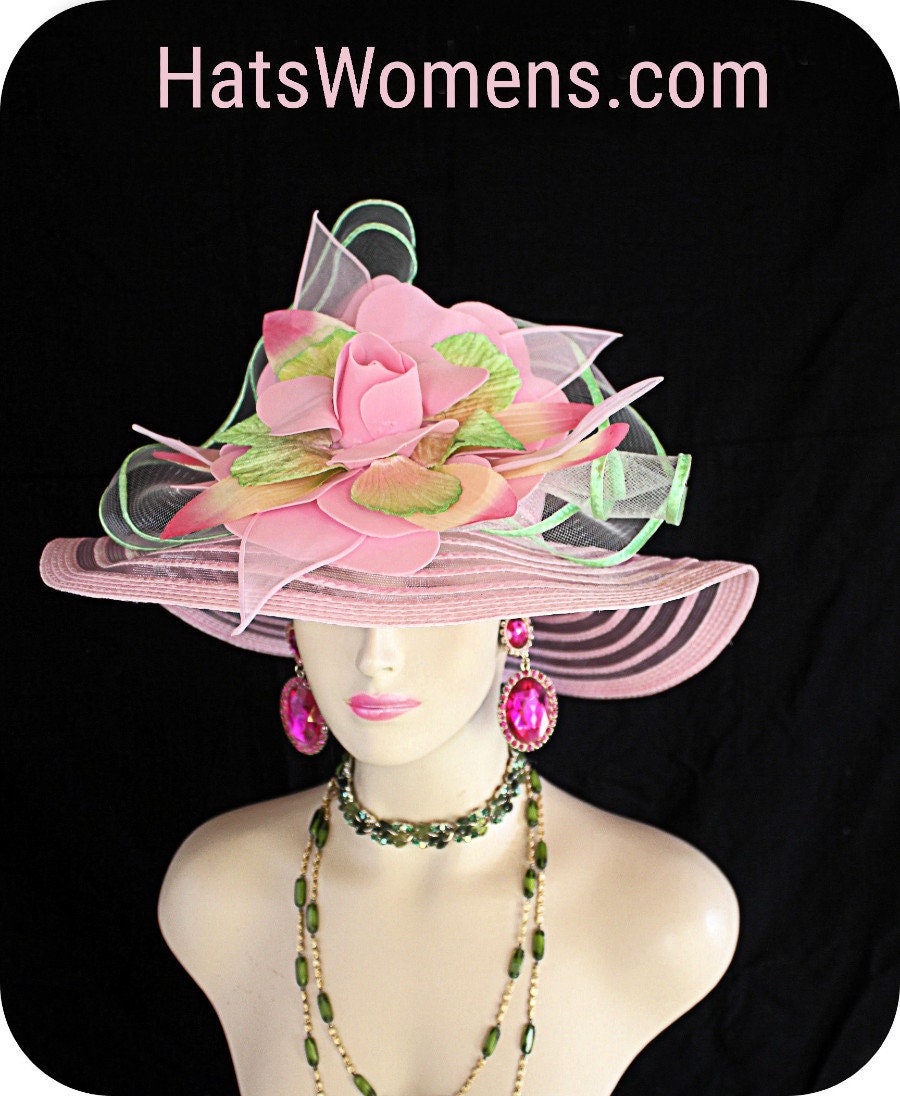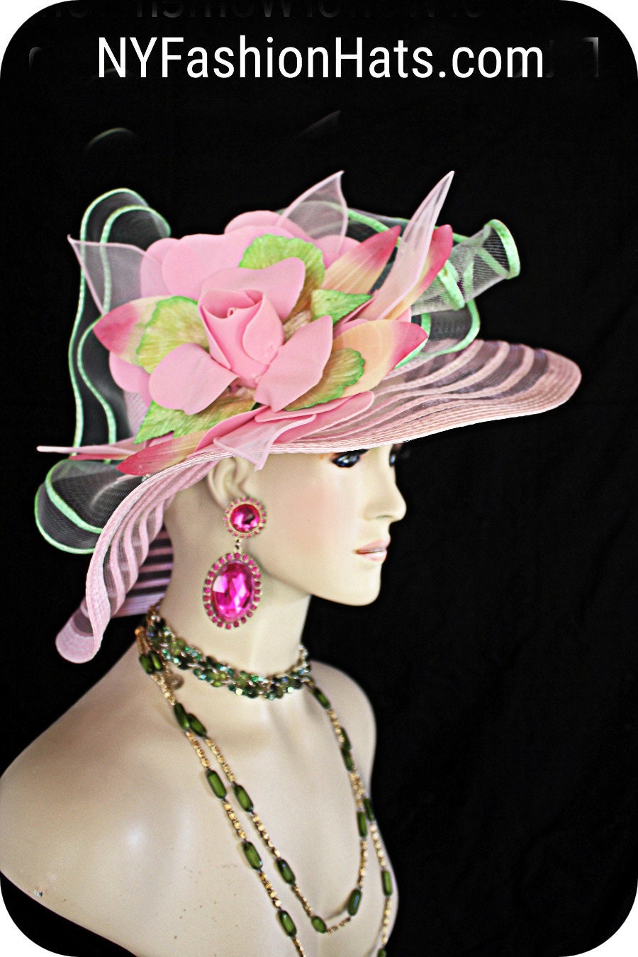 This Exclusive Motf Premium Pink Passion Coloured Wide Brimmed Exclusive Formal Hat Is Decorated With A Large Lime Apple Green Horsehair Braid Bow. Trimmed Within This Huge Bow Is A Very Large Lipstick Pink Foam Rose. Placed Within This Beautiful Rose Are Handmade Velvet Multicolored Vintage Flower Petals. Also Decorated Within The Flower Are Vintage Silk Long Flower Petals. For The Final Touch Hand Rolled Edged Vintage Pink Organza Flower Petals Are Trimmed Within This Unusual Floral Bowing. A Pink Trim With Rhinestones Encircles The Lower Crown. This Is A Glamorous Hat That Will Make A Huge Hit. NOTE: This Versatile Hat Can Be Worn In Different Positions. The Bowing Can Be Worn Toward The Face Or Toward The Back Of The Head.
