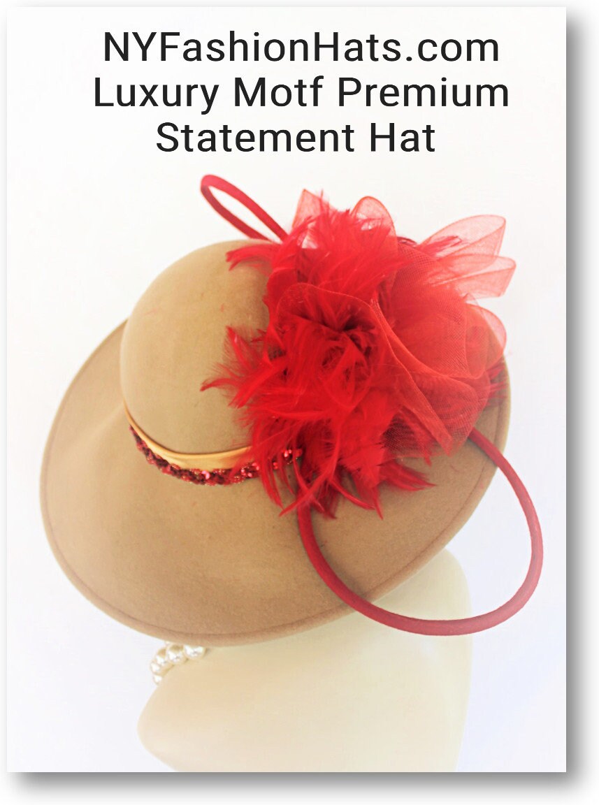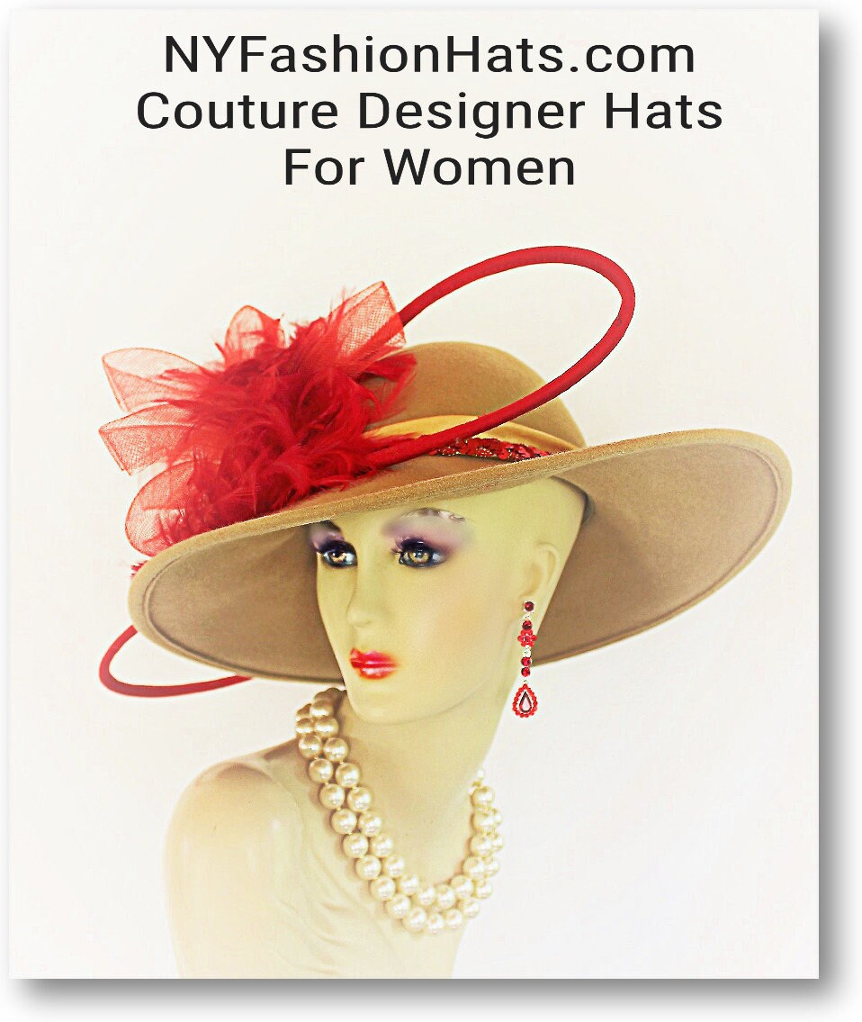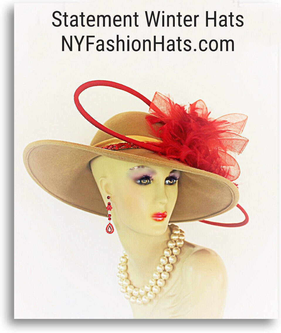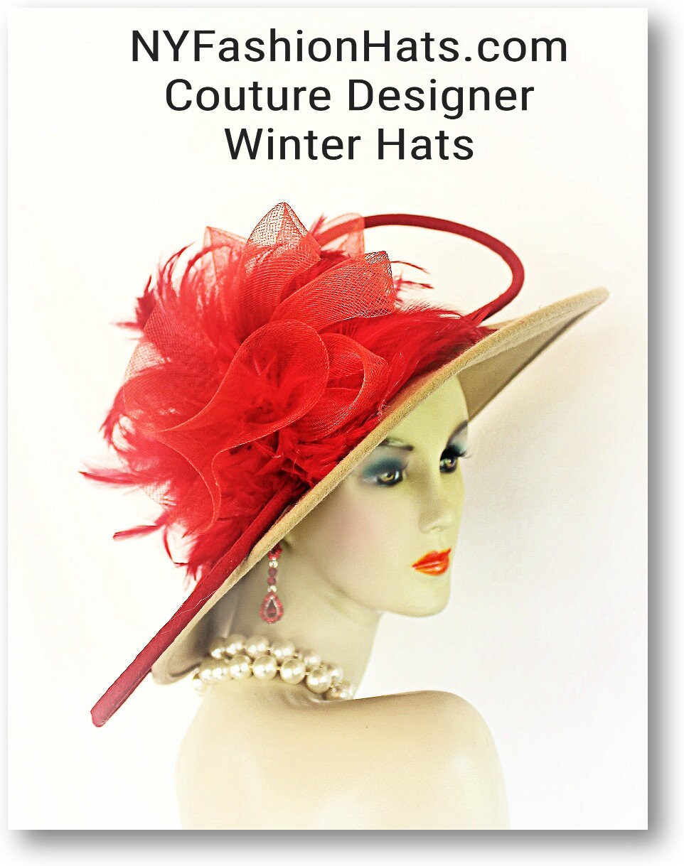 Haute Couture Motif Premium Beige Winter Wool Big Bow Red Feathered Designer Statement Wedding Church Hat For Women. This Old Hollywood Vintage Inspired Wool Fall Hat Is Trimmed With A Big Red Horsehair Crinoline Bow Accented With A Double Loop Red Handmade Wool Bow. Placed Within The Beautiful Bowing Are Expensive Red Rooster Feathers. A Golden Beige Satin Band Adorned With Red Sequin Encircles The Crown Of The Elegant Hat. This High-Fashion Statement Hat Is A Showpiece. This Is A One Of A Kind Hat. This Hat Is Suited To Wear With A Formal Coat Dress Suite Or Gown.