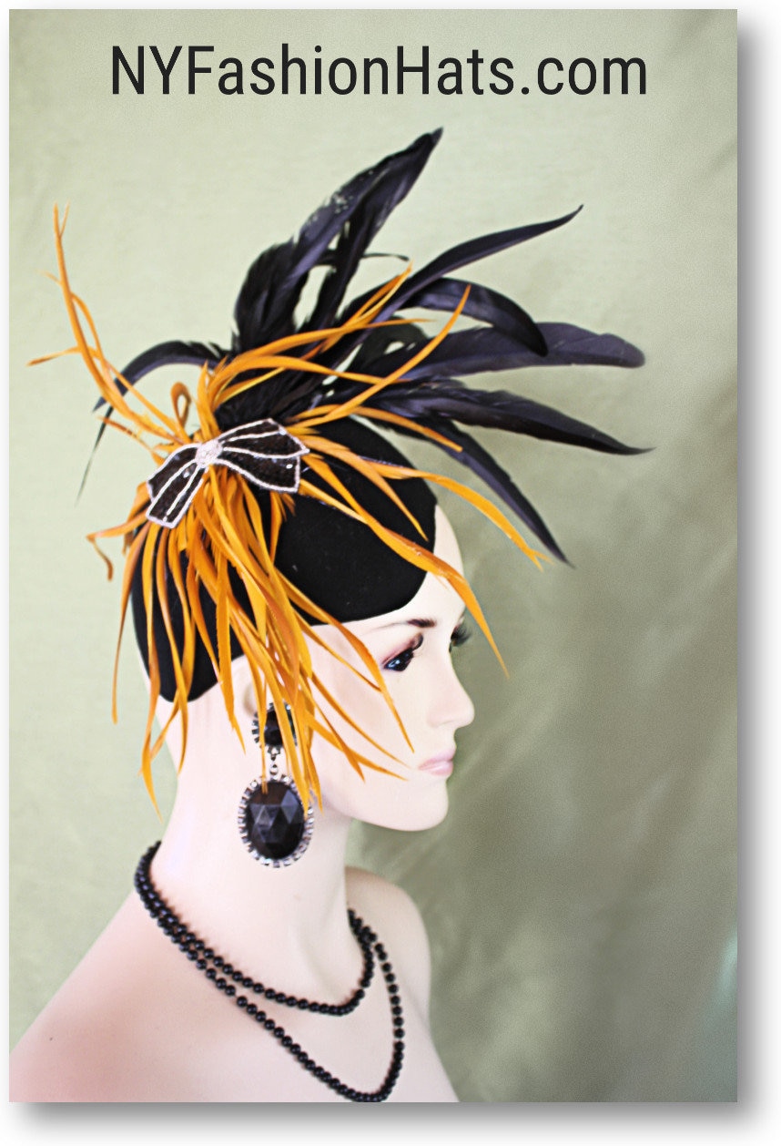 Haute Couture Motif Premium Wool Black And Gold Exotic Feathered Art Deco Shaped Cocktail Hat Wedding Fascinator Headpiece. This Old Hollywood Vintage Inspired Wool Fall Hat Is Trimmed With Expensive Long Black iridescent Rooster Coque Feathers Enhanced With Exotic Mustard Goose Biot Feathers. To Top Off This Unique Headpiece A Vintage Black And Metallic Silver Bow Is Added. This High-Fashion Statement Hat Is A Showpiece. This Hat Is Suited To Wear With A Formal Coat Dress Suite Or Gown.