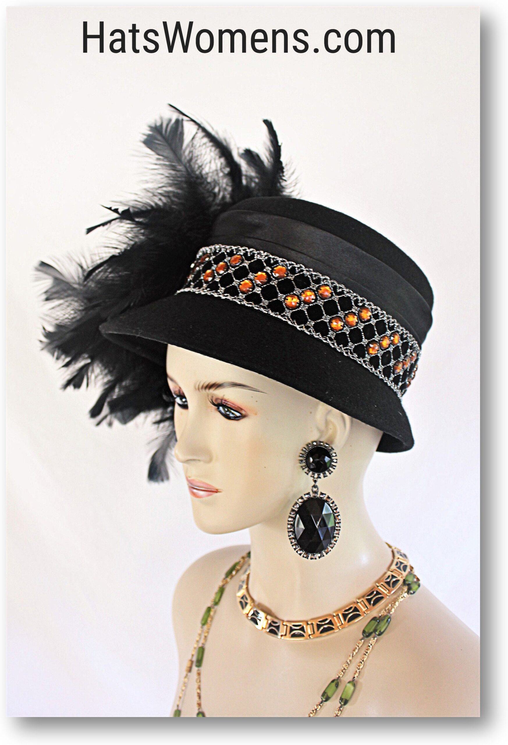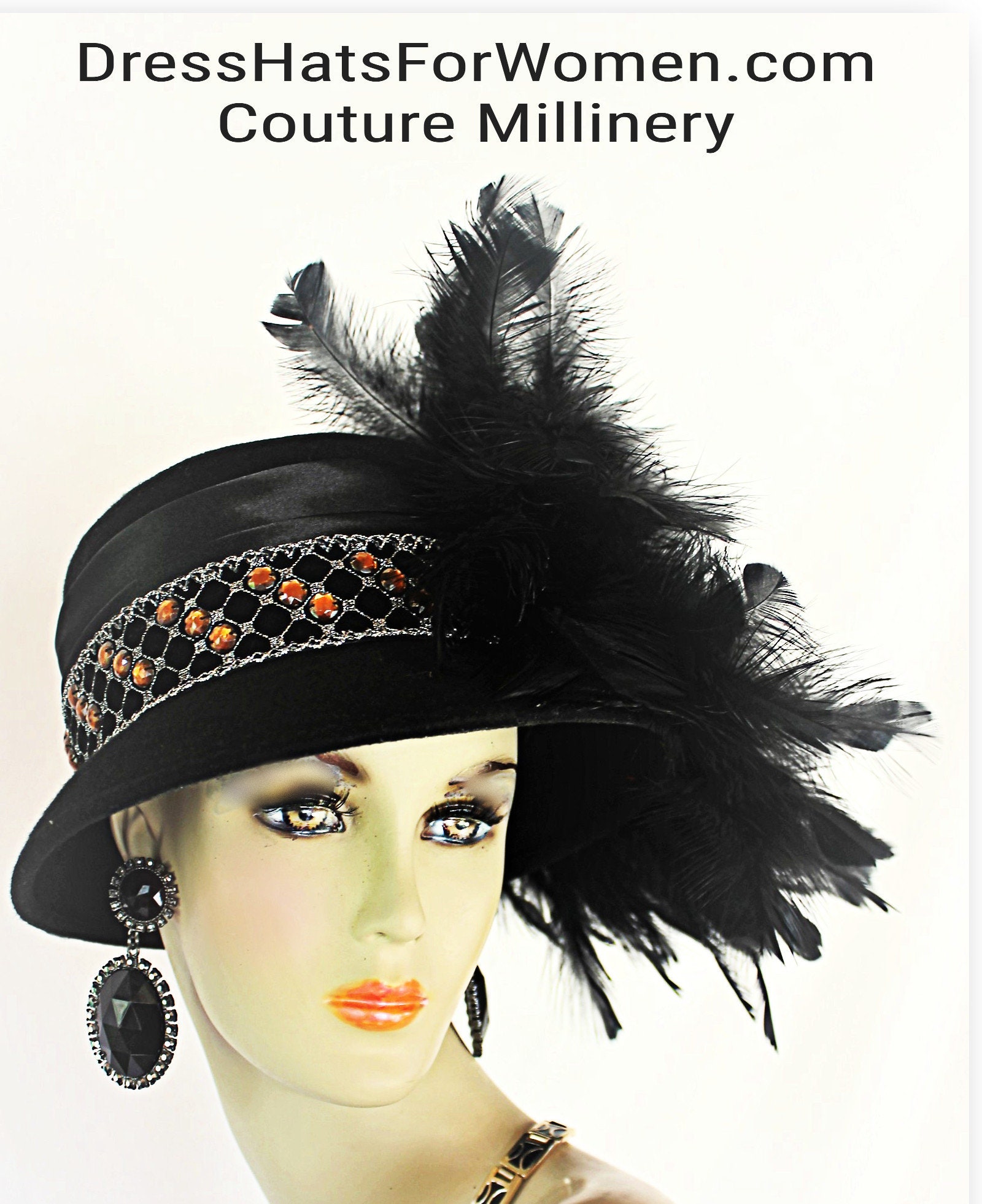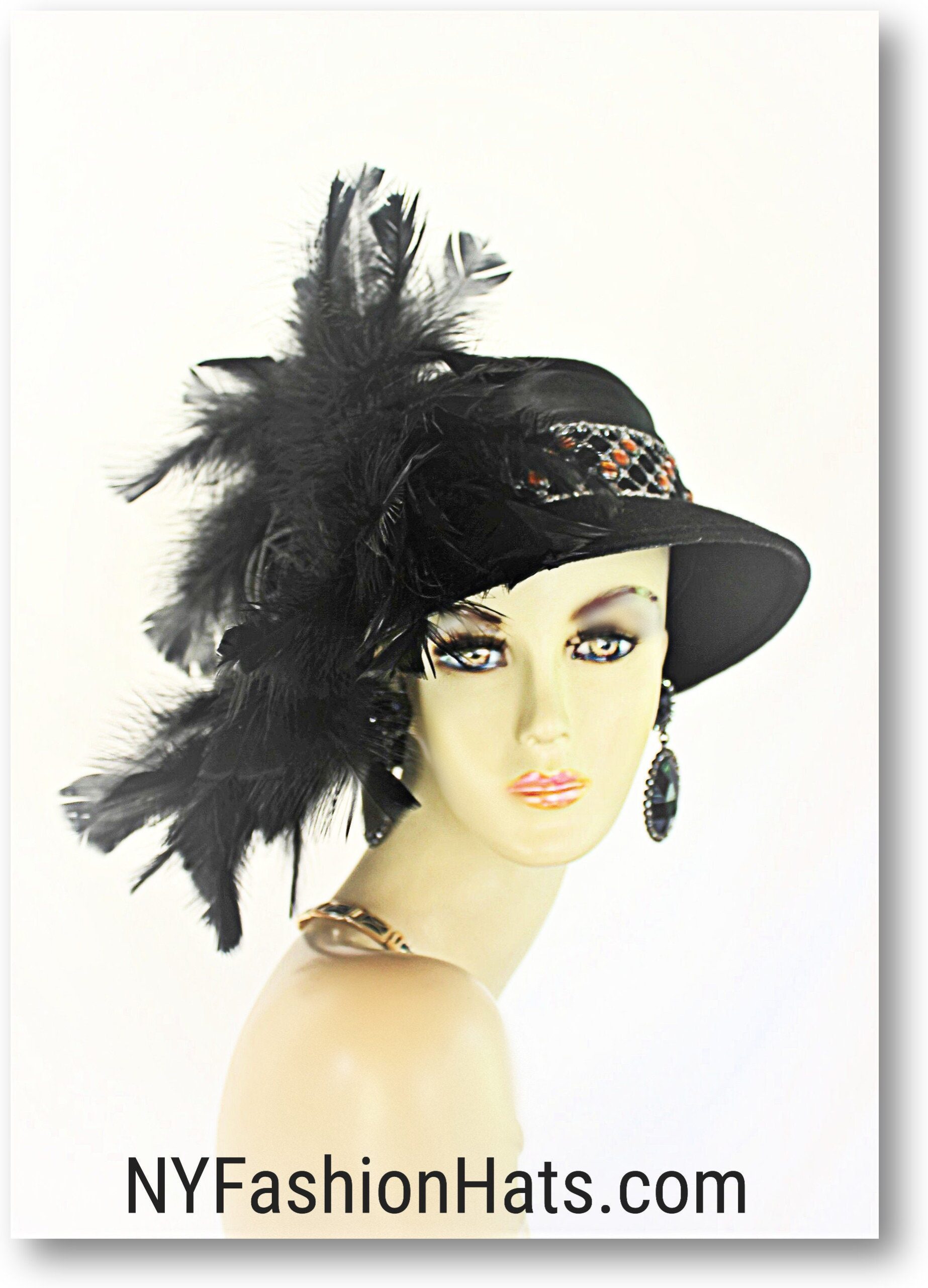 Haute Couture Black Luxury Statement Winter Wool Formal Designer Cloche Dress Hat For Women. This Old Hollywood Vintage Inspired Black Wool Fall Hat Is Trimmed With Lustrous Jet Black Rooster Feathers. Note: We Did Not Skimp On Feathers. A Beautiful Detailed Black Velvet Metallic Silver And Orange Beaded Trim Encircles The Crown Of This Classic Styled Hat. This High Fashion Statement Hat Is A Showpiece.