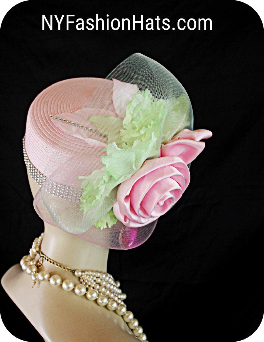 Women’s Designer Soft Pink And Celery Green Formal Straw Cotton Braid Special Occasion Wedding Pillbox Cocktail Hat Wedding Fascinator Bridal Headpiece. This Couture Pink Church Hat Is Embellished With A Large Pink Crinoline Horsehair Large Rose Bow. Beautiful Hand Dyed Pink Vintage Silk Orchid Millinery Flowers Are Placed Within The Bow, Enhanced With Pink Vintage Silk Leaves Accented With A Single Row Of Acrylic Rhinestones. Four Rows Of Acrylic Rhinestones Encircle The Crown Of This Fashion Wedding Headpiece. This Formal 1920’s Flapper Art Deco Styled Hat Wedding Headpiece Can Be Worn In Different Positions. This Fashionable Pillbox Hat Can Be Customized To Match Your Wardrobe. If You Need Custom Colors Please Notify Us.