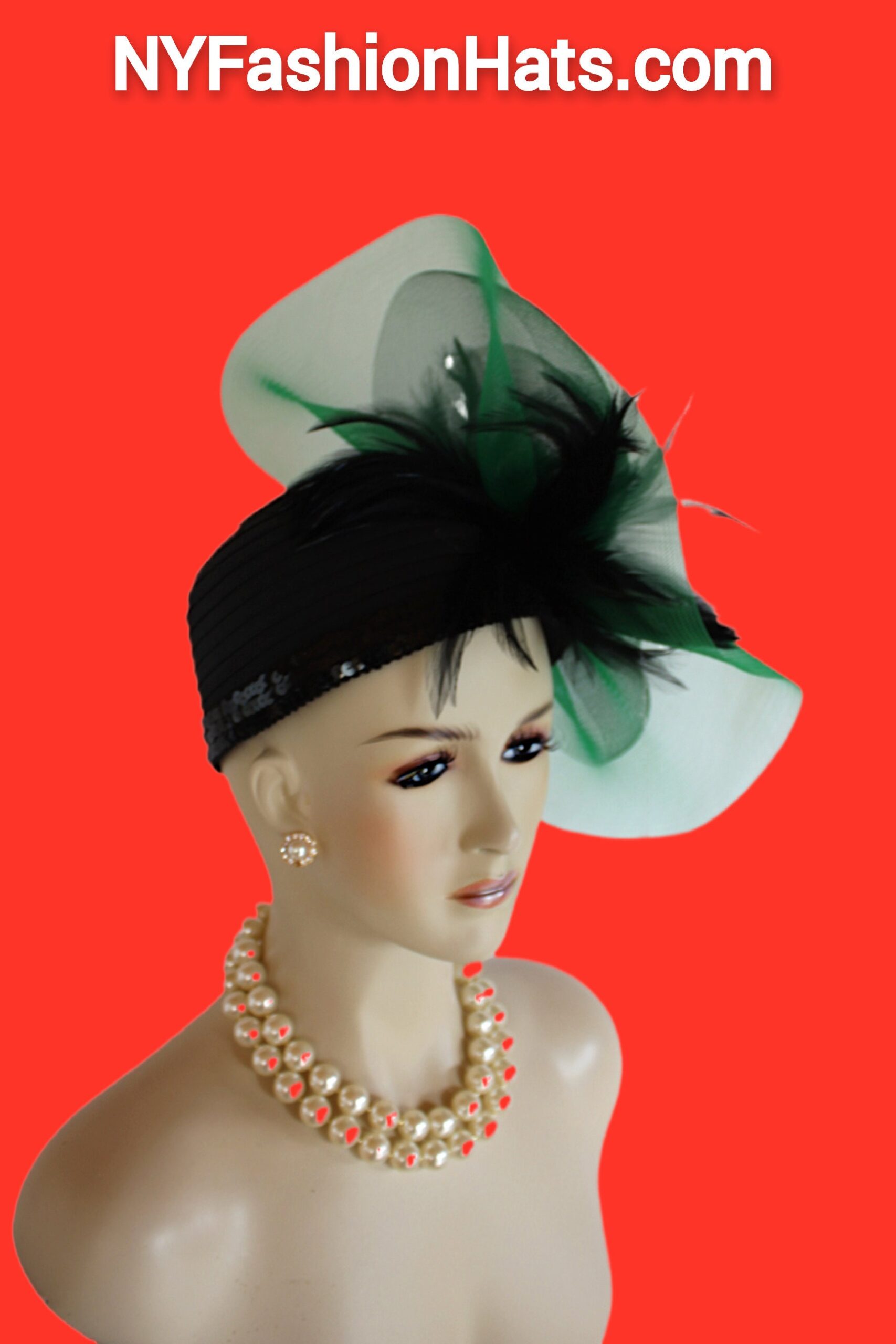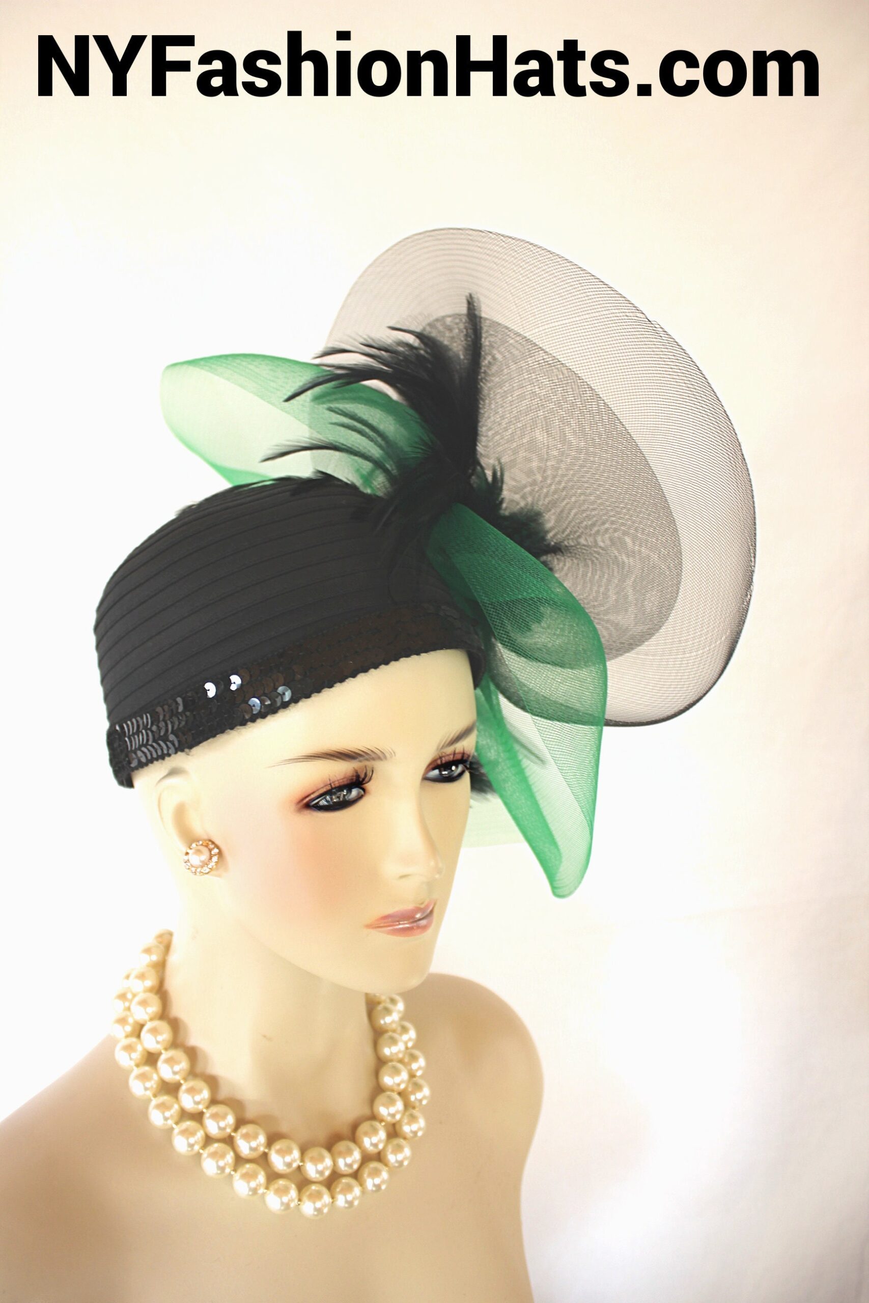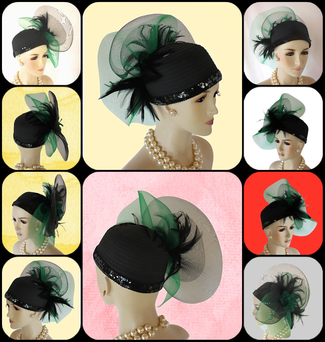Black And Kelly Green Haute Couture Avant Garde Designer Satin Pillbox Fashion Hat For Women. This Hand Made Motf Premium Black Satin Designer Dress Hat Is Trimmed With A Large Black And Kelly Green Double Crinoline Horsehair Handmade Large Bow. Placed Within And Around This Big Bow Are Expensive Long Black Hackle Rooster Feathers. To Top Off This Luxury Black Satin Pillbox Hat, Black And Green Speckled Guinea Feathers Are Added As A Center Accent Piece. This Designer Custom Made Hat Is A Show Stopper. Suited For Winter, Spring, Summer And Fall. This Beautiful Hat Speaks For Itself With The High Fashion Millinery Design.