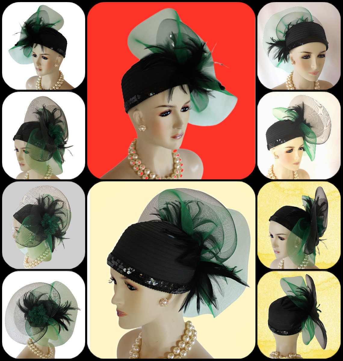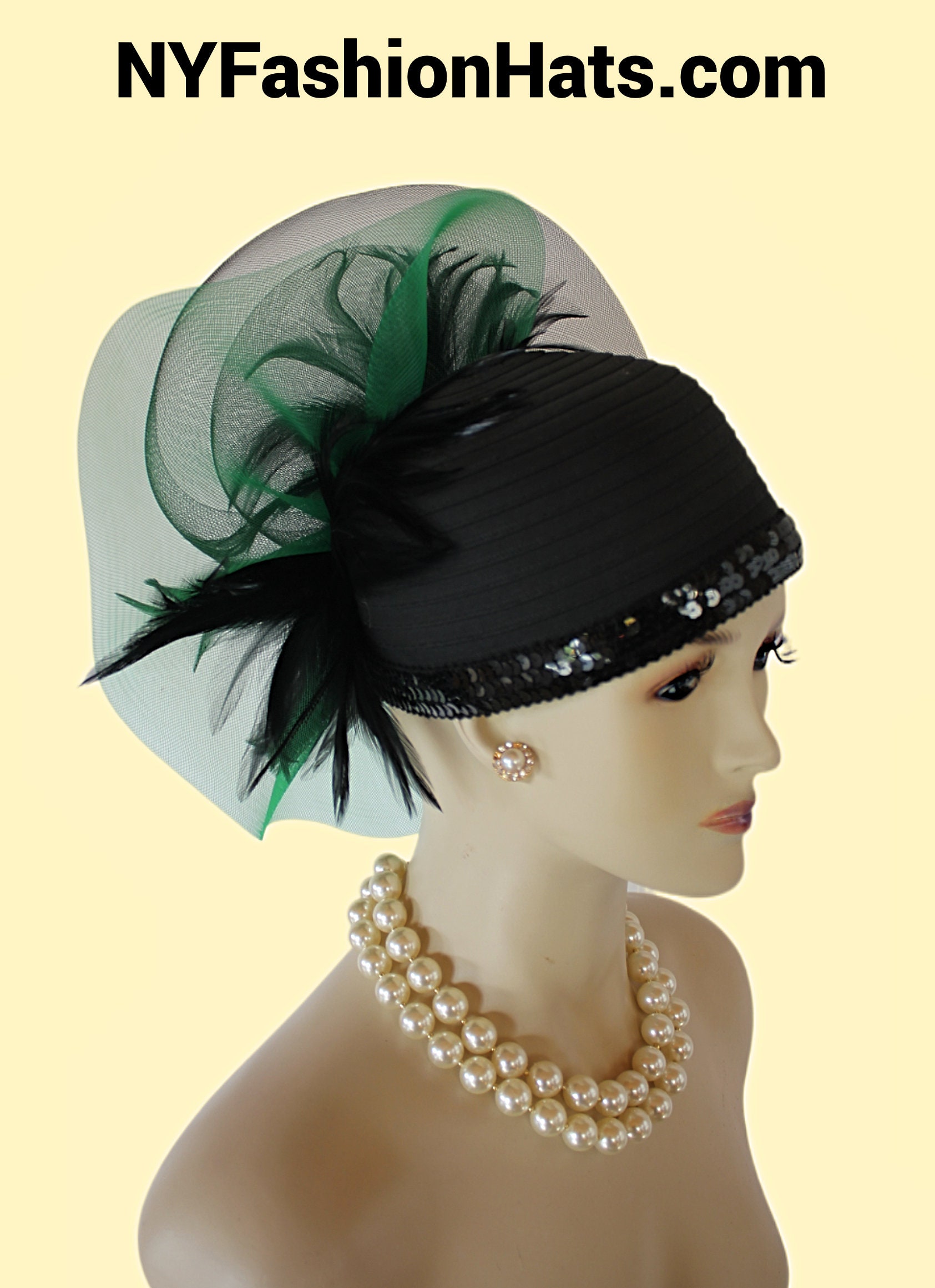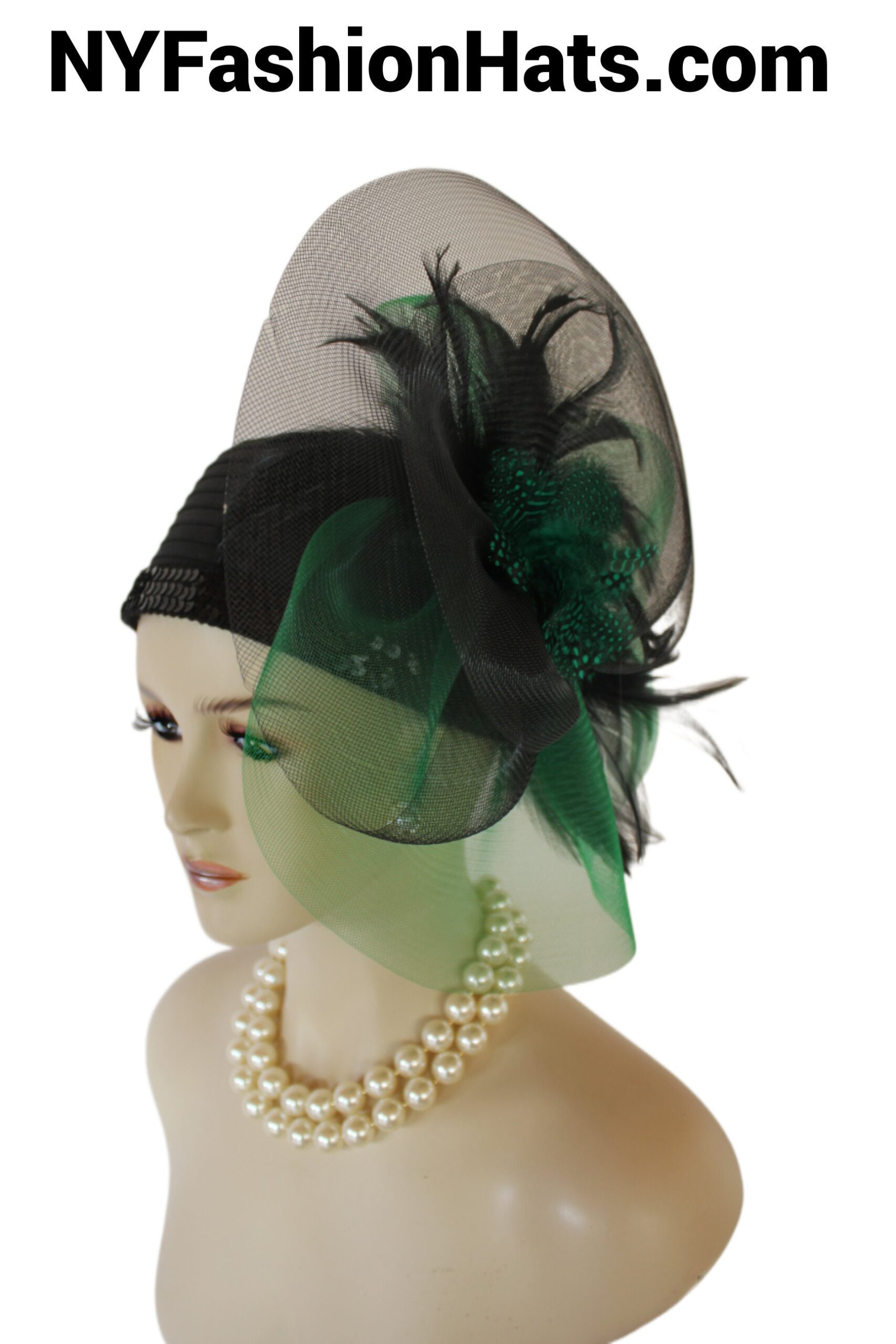 Black And Kelly Green Haute Couture Avant Garde Designer Satin Pillbox Fashion Hat For Women. This Hand Made Motf Premium Black Satin Designer Dress Hat Is Trimmed With A Large Black And Kelly Green Double Crinoline Horsehair Handmade Large Bow. Placed Within And Around This Big Bow Are Expensive Long Black Hackle Rooster Feathers. To Top Off This Luxury Black Satin Pillbox Hat, Black And Green Speckled Guinea Feathers Are Added As A Center Accent Piece. This Designer Custom Made Hat Is A Show Stopper. Suited For Winter, Spring, Summer And Fall. This Beautiful Hat Speaks For Itself With The High Fashion Millinery Design.