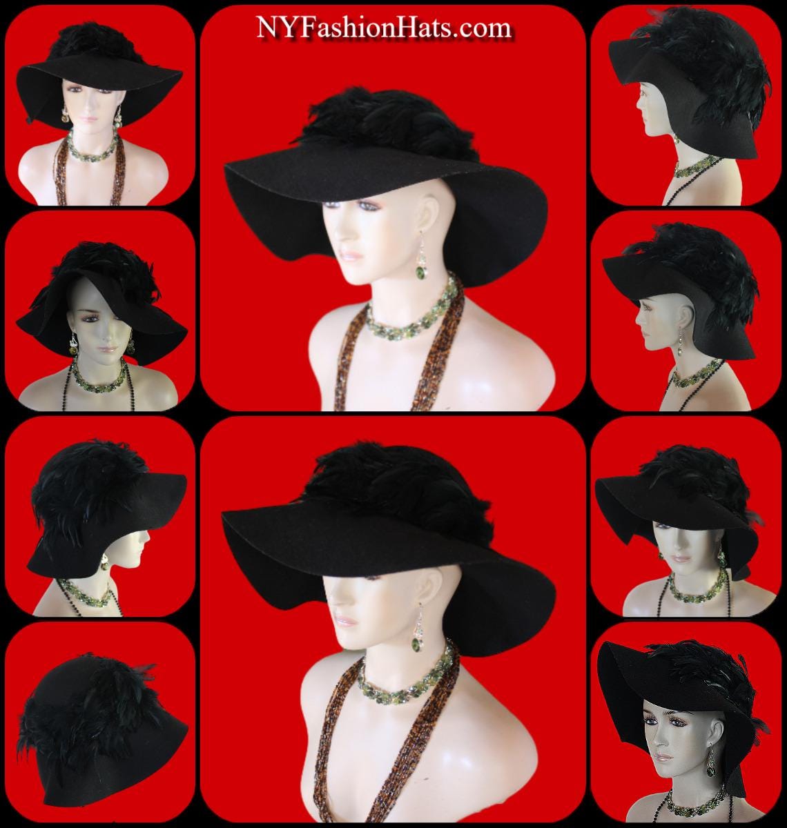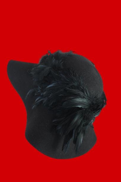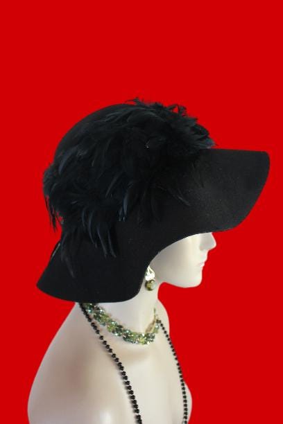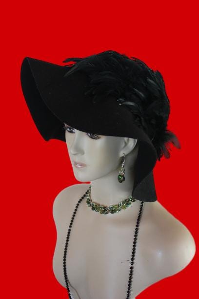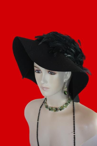 Black Winter Wool Rooster Feathered Formal Haute Couture Designer Floppy Dress Hat For Women. This Old Hollywood Vintage Inspired Wool Fall Hat, Is Trimmed With A Large Amount Of Iridesent Black Rooster Feathers That Wrap Around This Luxury Custom Made Hat. Feathers Wrap Around Side Part Of The Hat Crown. This Hat Will Make A Fashion Statement.